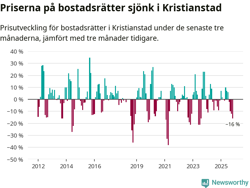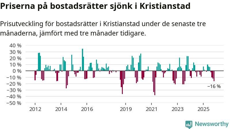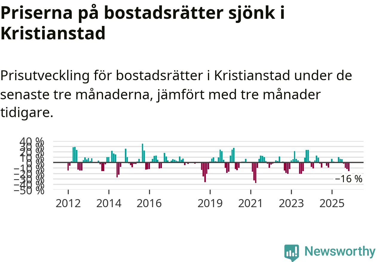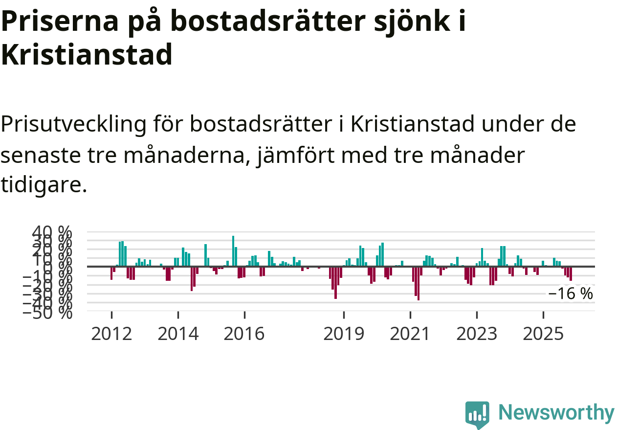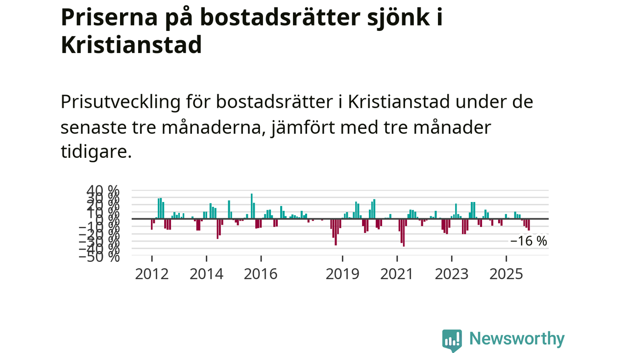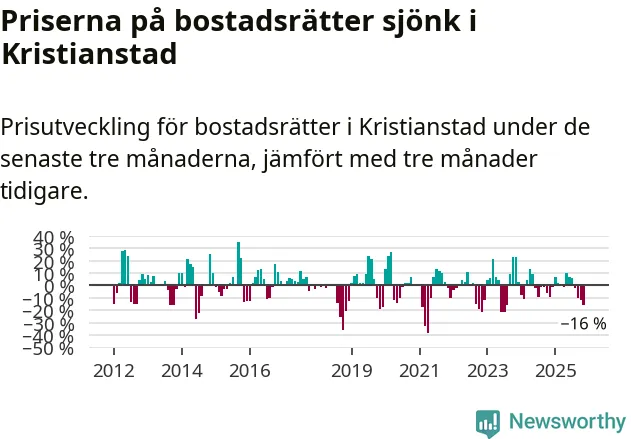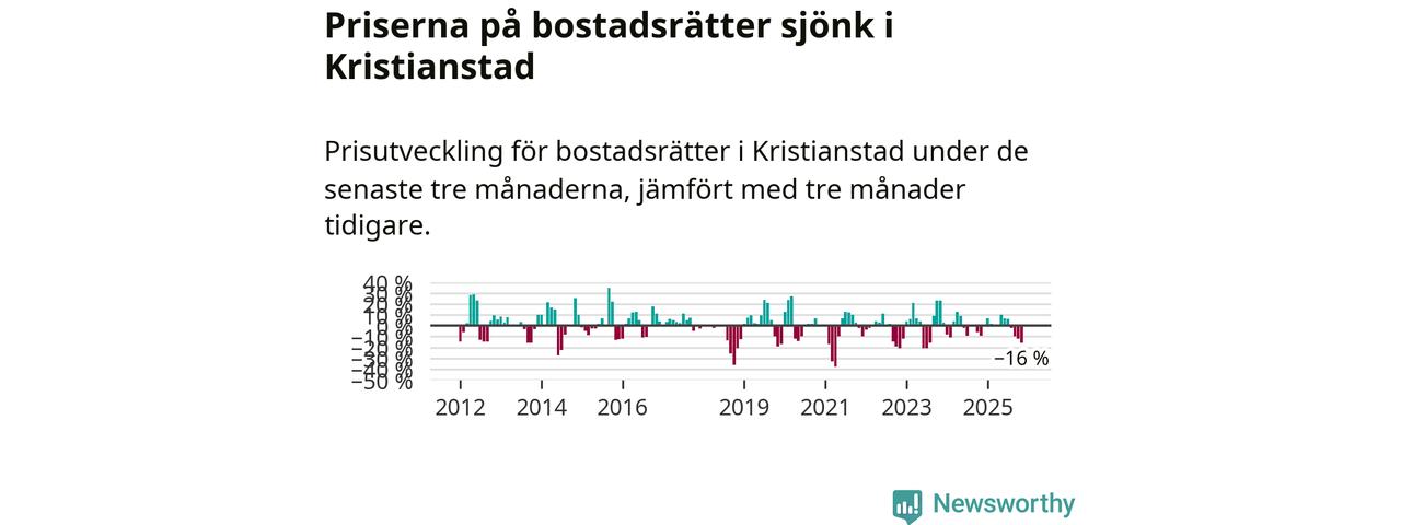 Priserna på bostadsrätter har gått ner i Kristianstads kommun. Medelpriset på försäljningarna under de senaste tre månaderna visar på en nedgång med 16 procent.