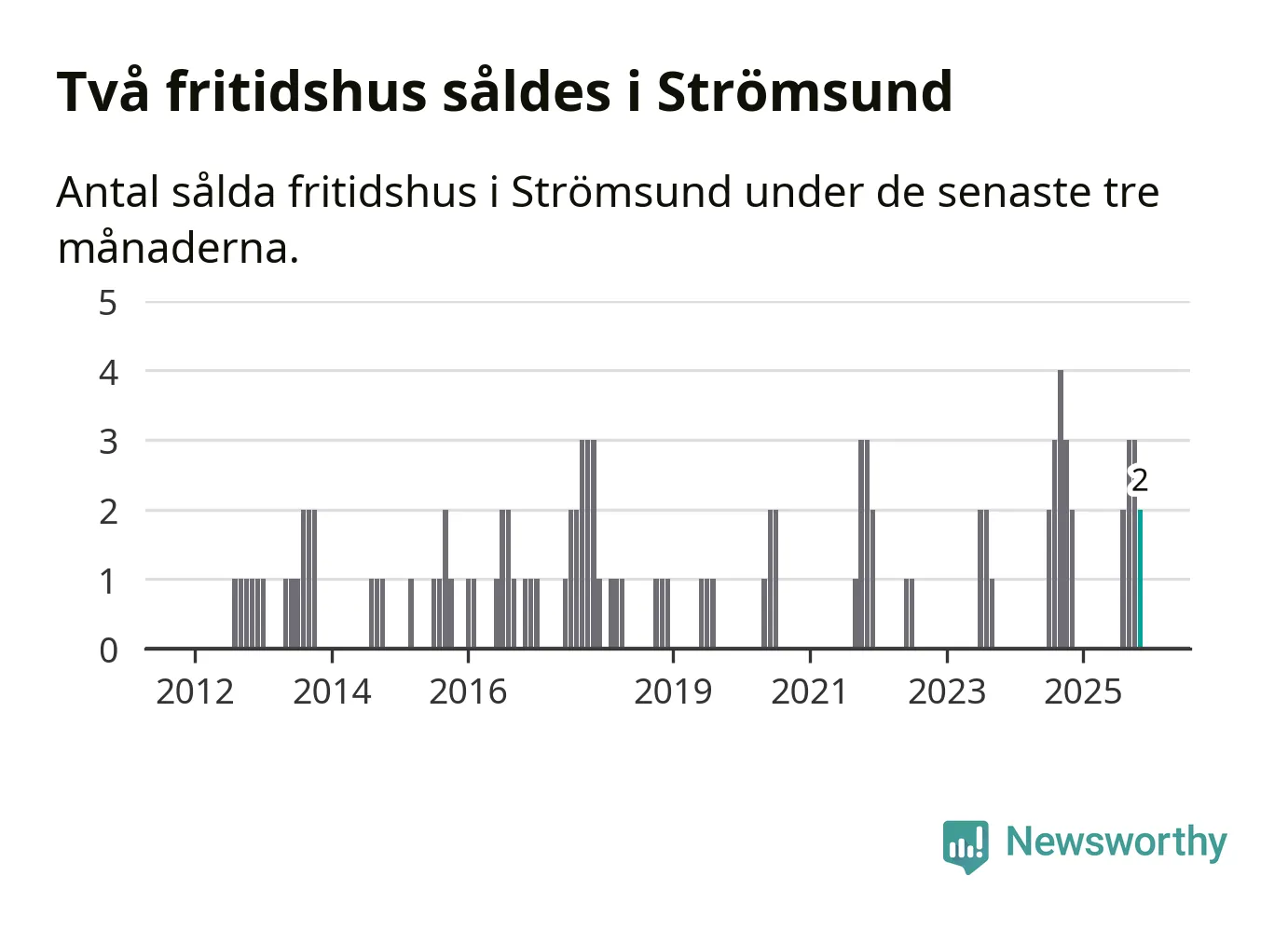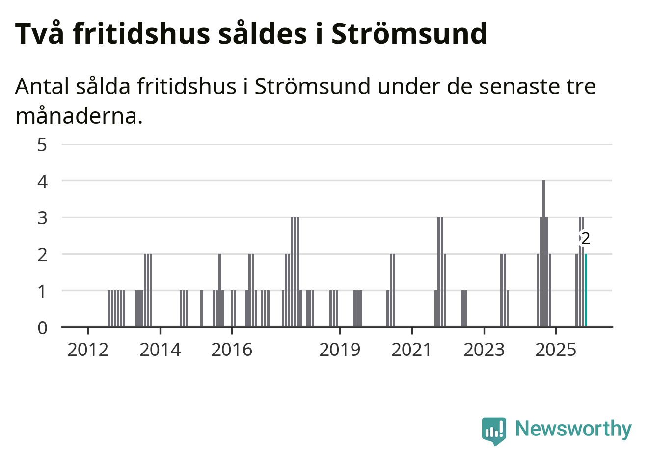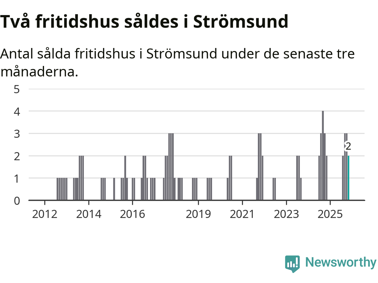 Mellan september och november gjordes sammanlagt två affärer med fritidshus i Strömsunds kommun. Det är lika många affärer som vid motsvarande tid i fjol.