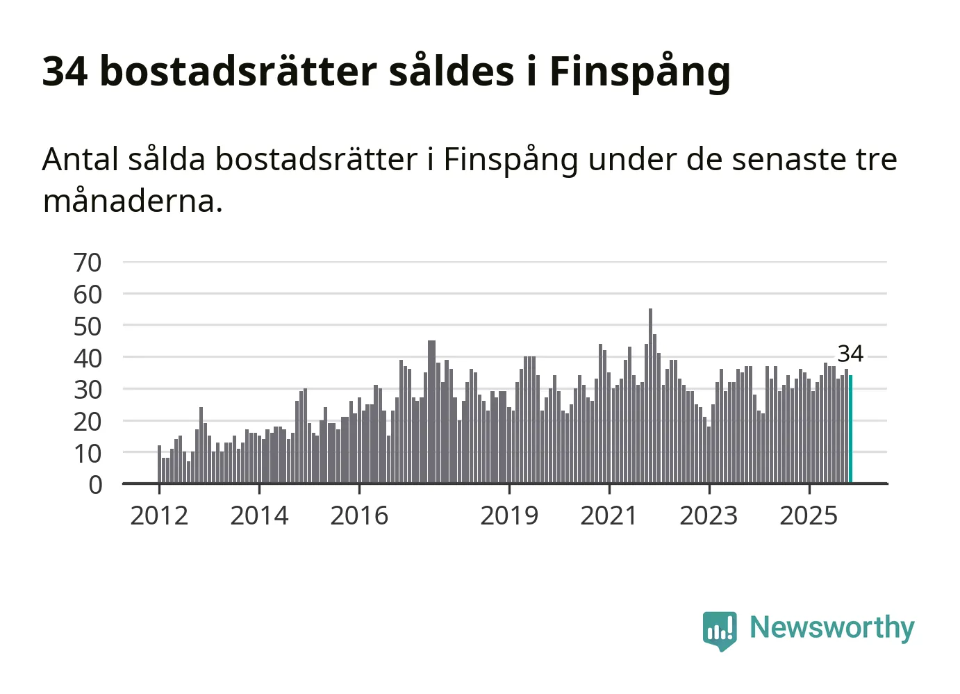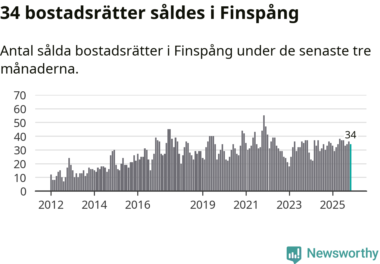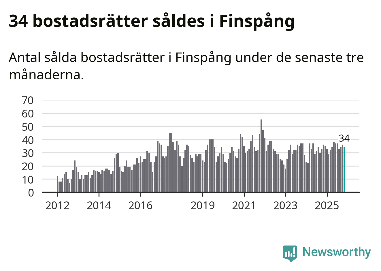 Mellan september och november såldes 34 bostadsrätter i Finspångs kommun. Det är relativt få sett till aktiviteten på bostadsmarknaden i kommunen under de senaste tolv månaderna, samt det historiska snittet för den här tiden på året.