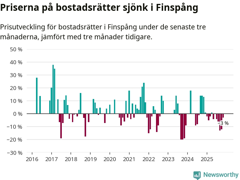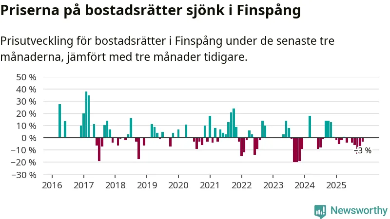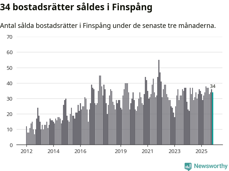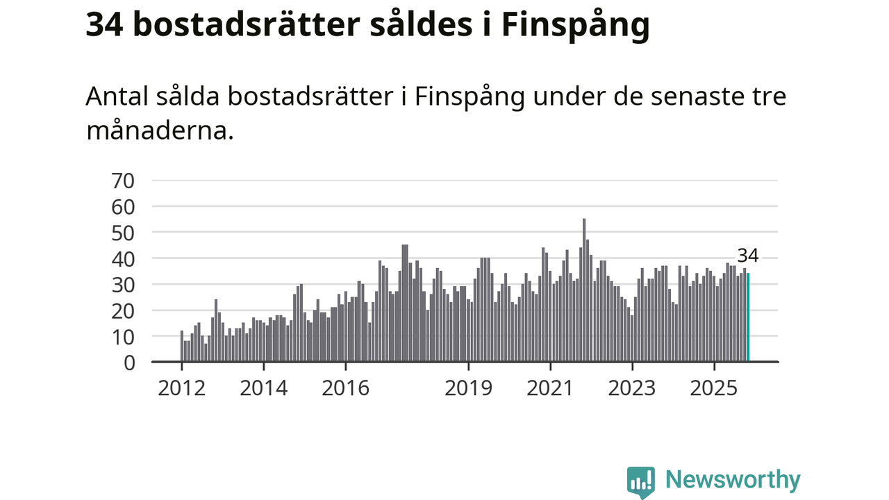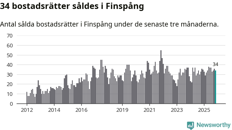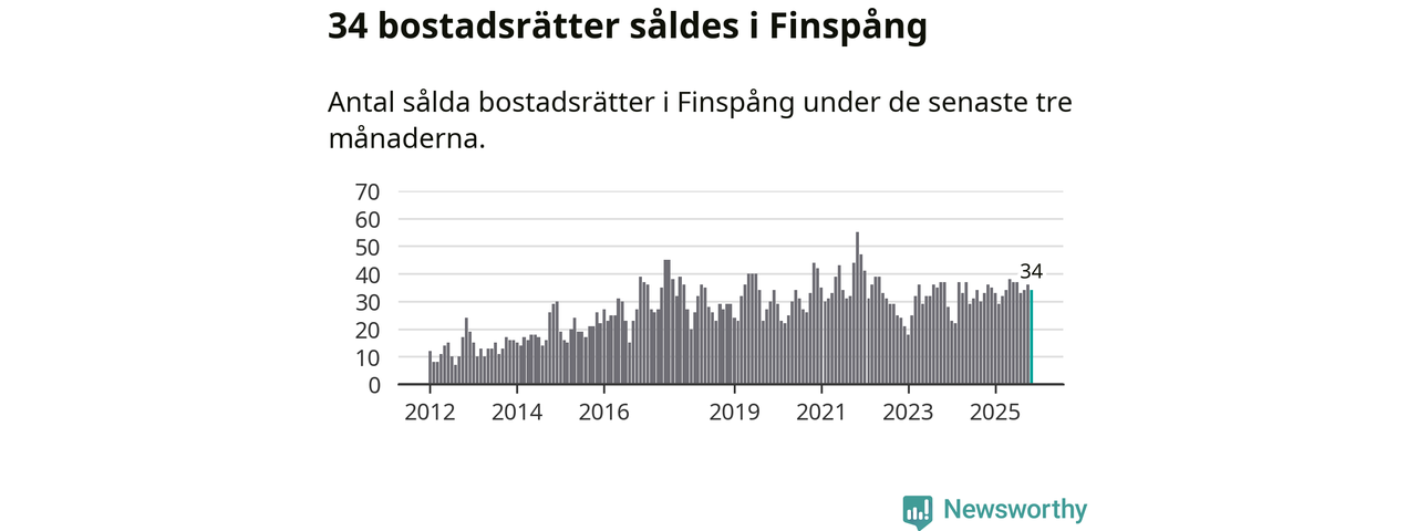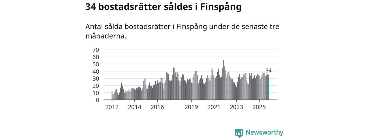 Mellan september och november såldes 34 bostadsrätter i Finspångs kommun. Det är relativt få sett till aktiviteten på bostadsmarknaden i kommunen under de senaste tolv månaderna, samt det historiska snittet för den här tiden på året.