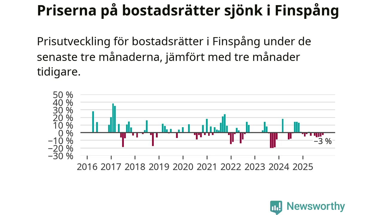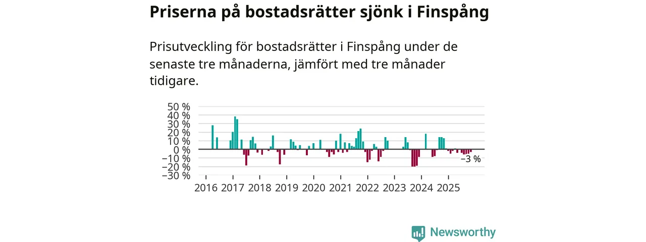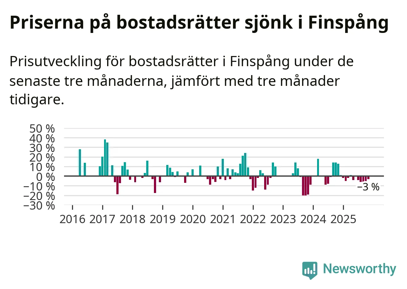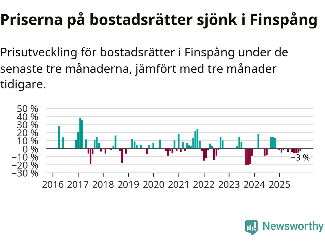 Statistiken visar även på en prisnedgång i Finspångs kommun. Medelpriset på försäljningarna av bostadsrätter i kommunen var 3 procent lägre än för tre månader sedan. Även i hela Östergötland sjunker priserna på bostadsrätter. I hela länet noterades en prisnedgång på 9 procent.