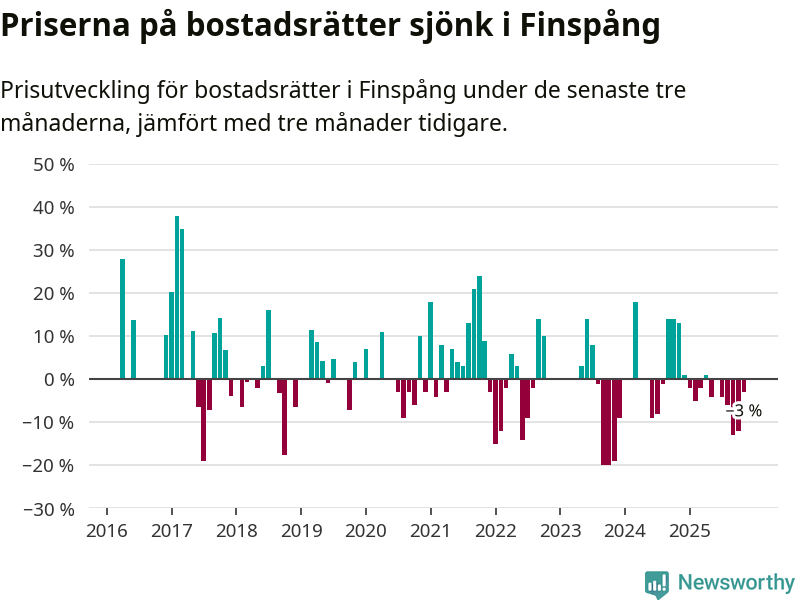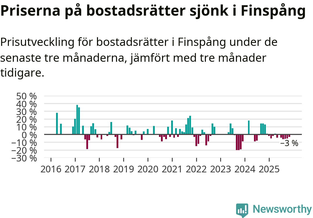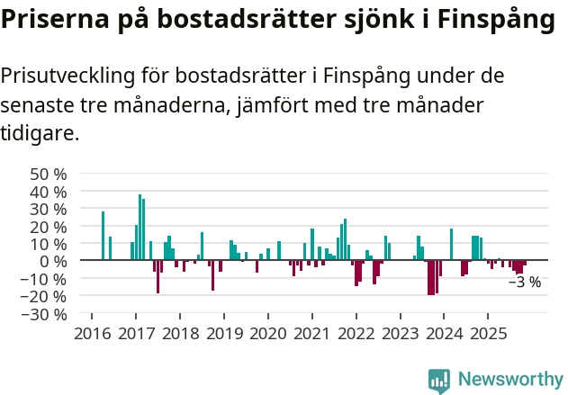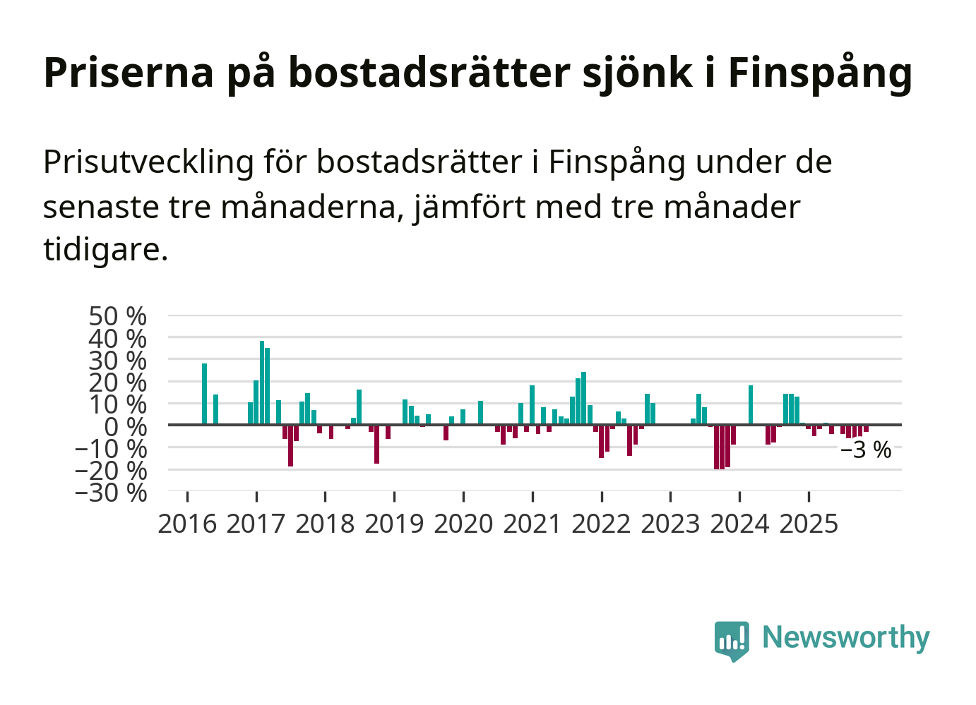 Statistiken visar även på en prisnedgång i Finspångs kommun. Medelpriset på försäljningarna av bostadsrätter i kommunen var 3 procent lägre än för tre månader sedan. Även i hela Östergötland sjunker priserna på bostadsrätter. I hela länet noterades en prisnedgång på 9 procent.