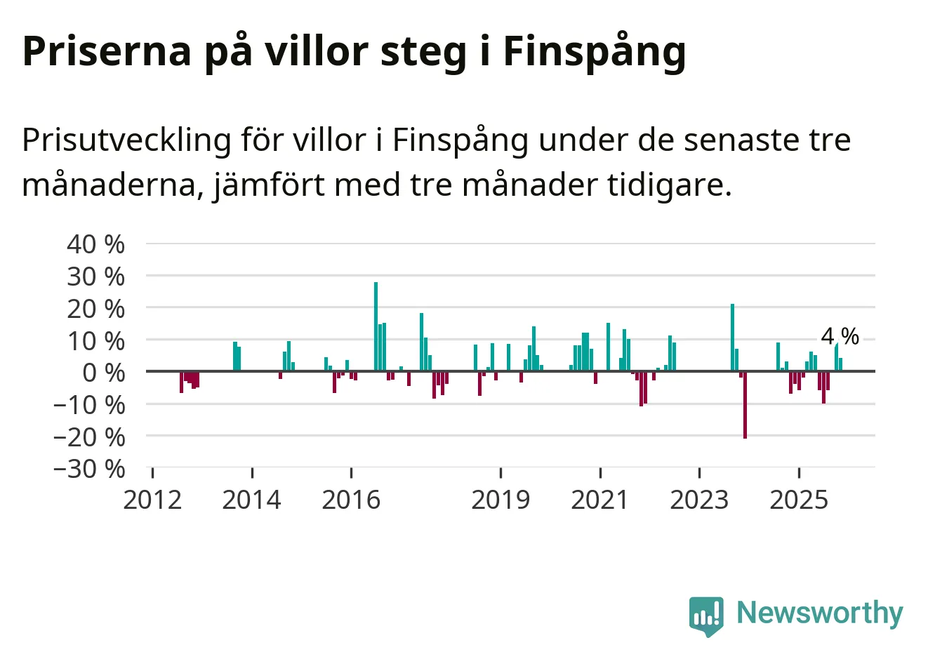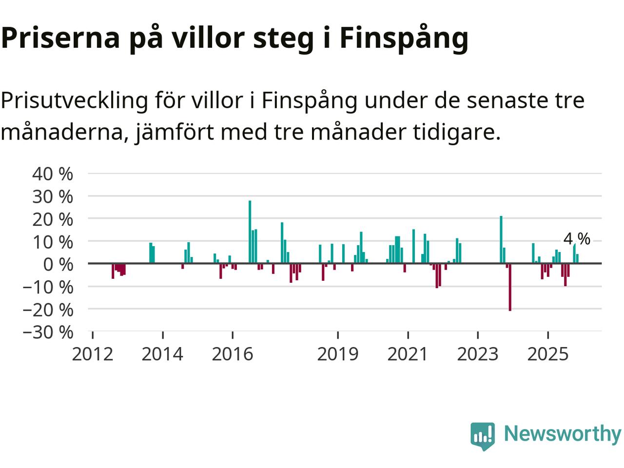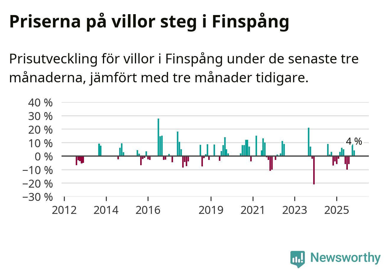 Statistiken visar även på en kännbar prisuppgång i Finspångs kommun. Medelpriset på försäljningarna av villor i kommunen var 4 procent högre än för tre månader sedan. I hela Östergötland däremot sjunker villapriserna. I hela länet noterades en prisnedgång på 2 procent.