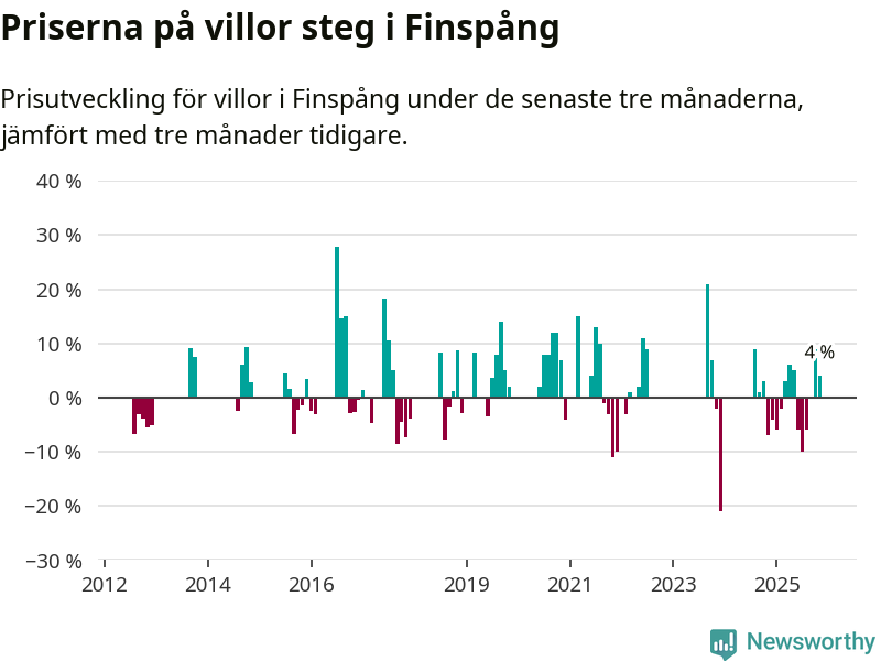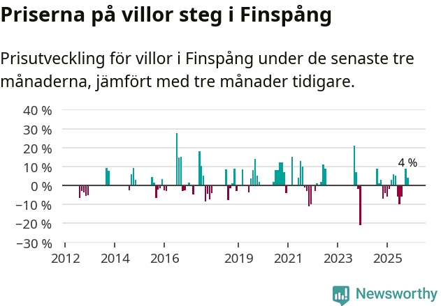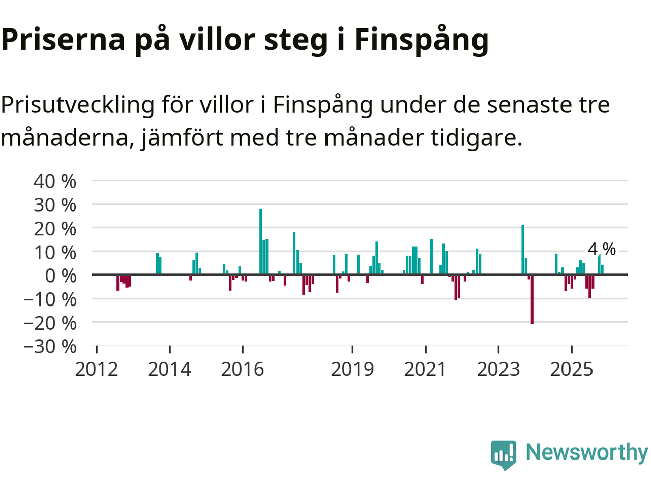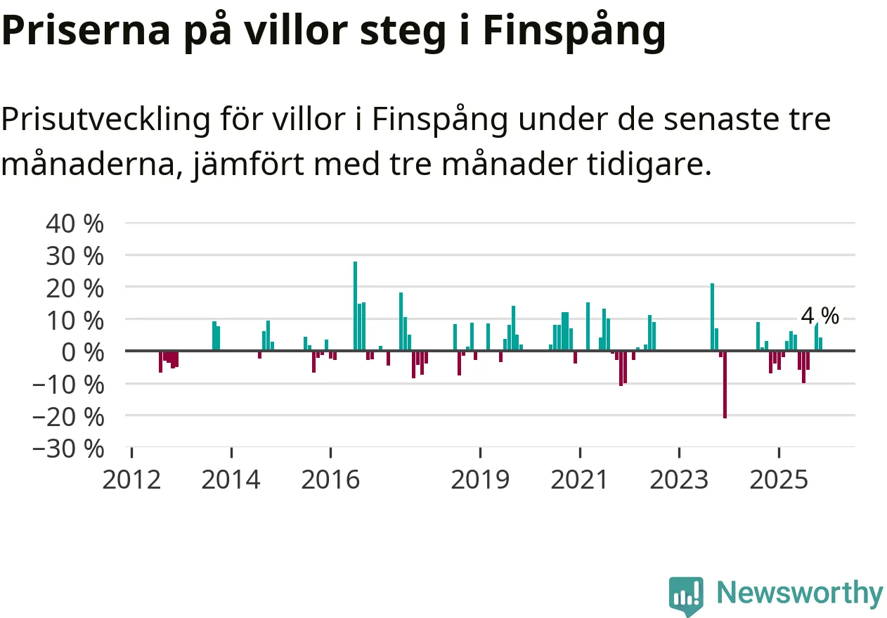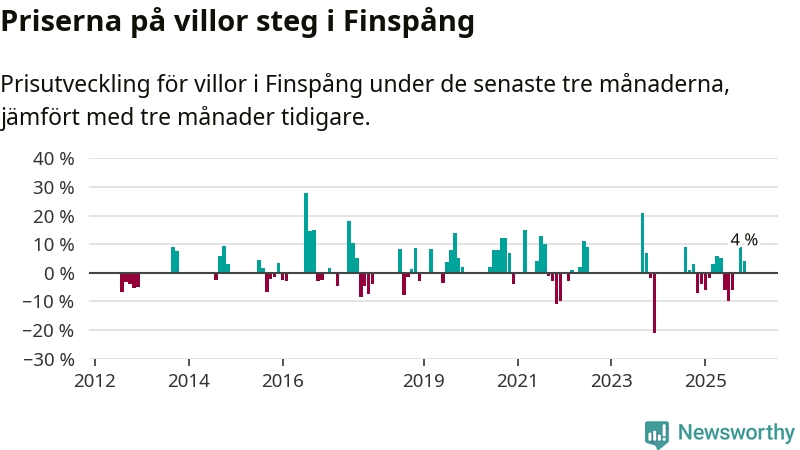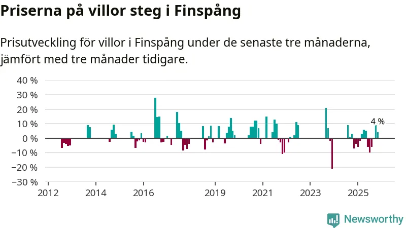 Statistiken visar även på en kännbar prisuppgång i Finspångs kommun. Medelpriset på försäljningarna av villor i kommunen var 4 procent högre än för tre månader sedan. I hela Östergötland däremot sjunker villapriserna. I hela länet noterades en prisnedgång på 2 procent.