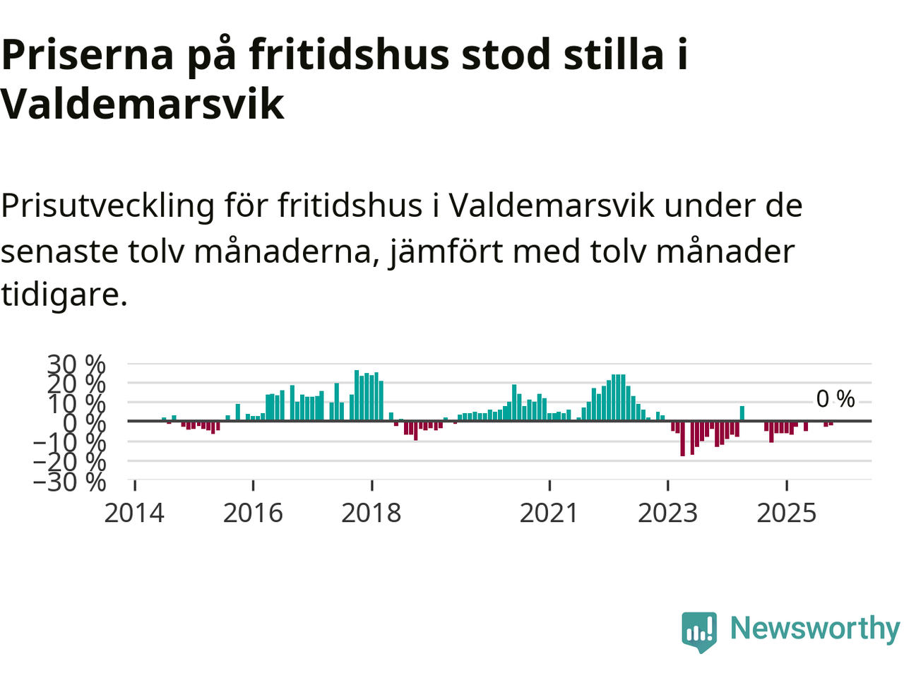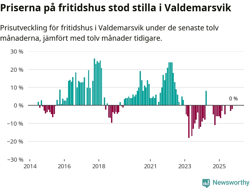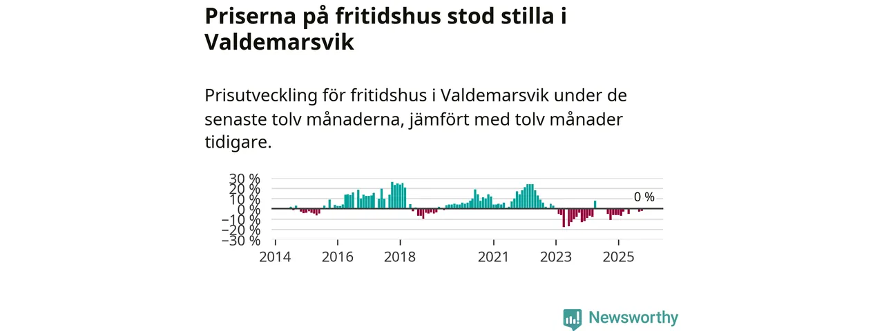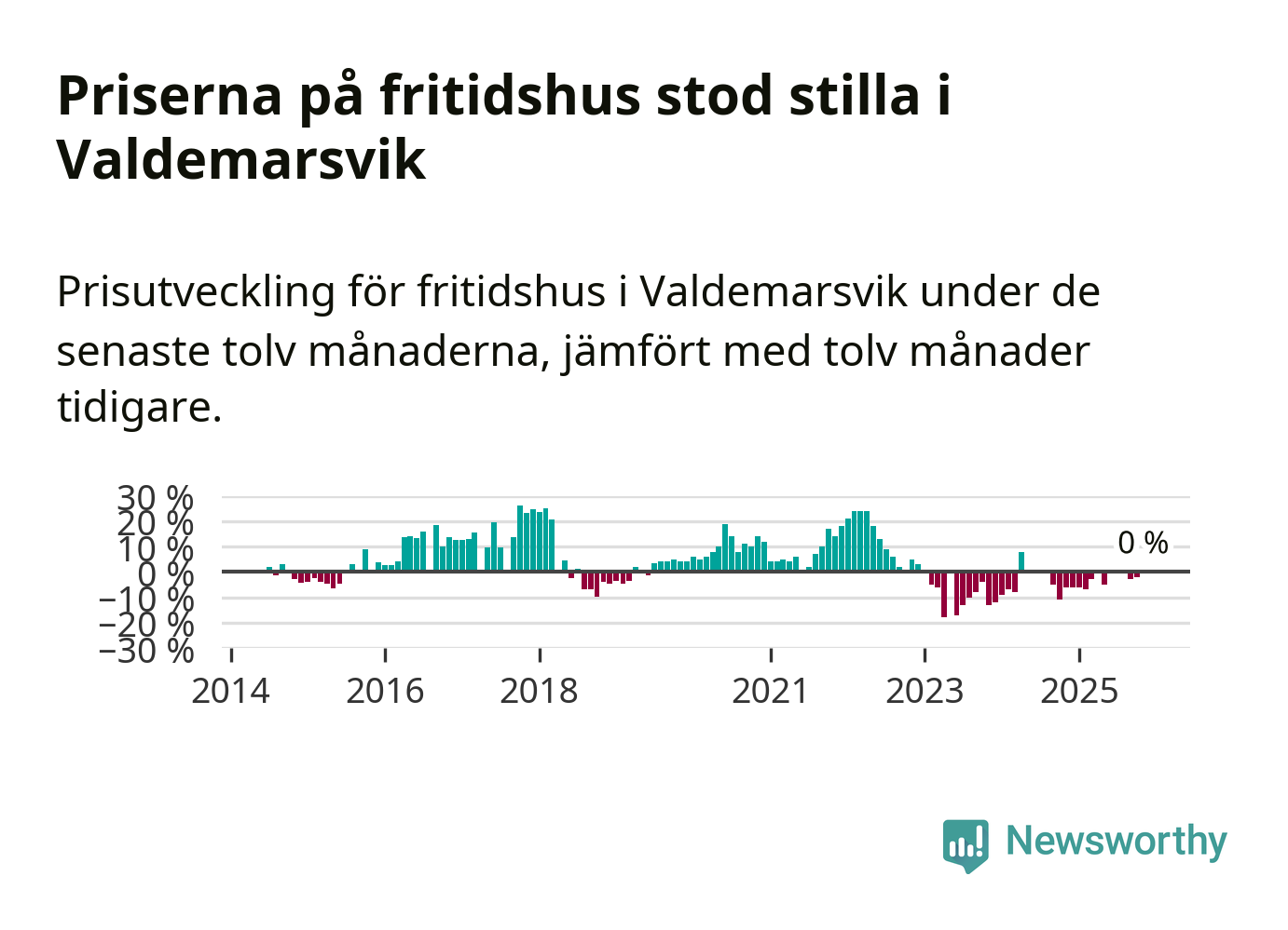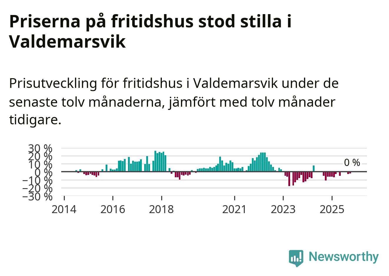 Priserna på fritidshus står i stort sett stilla i Valdemarsviks kommun. Medelpriset på de på försäljningarna under de senaste tolv månaderna låg på samma nivå som för ett år sedan.