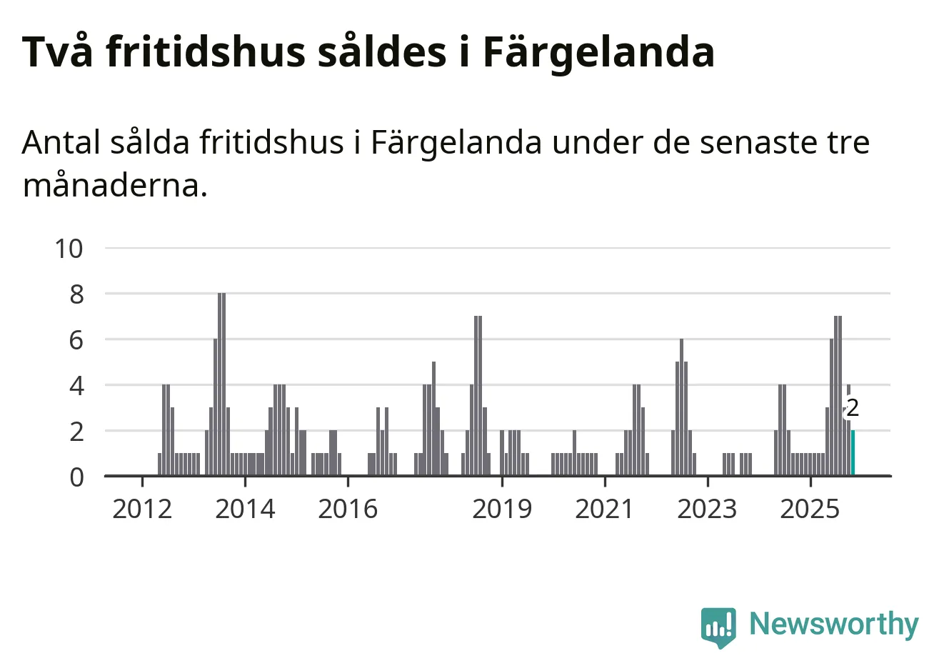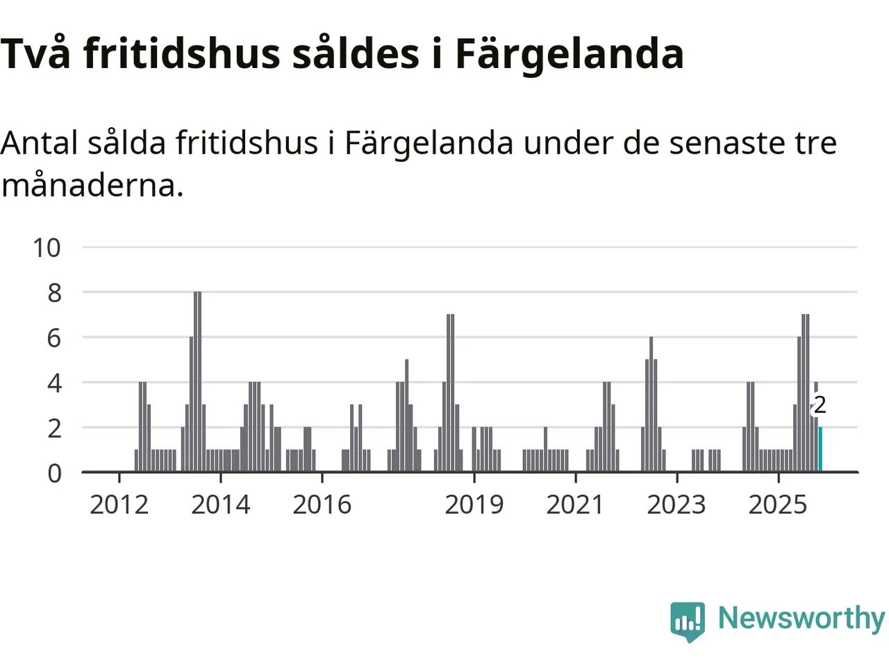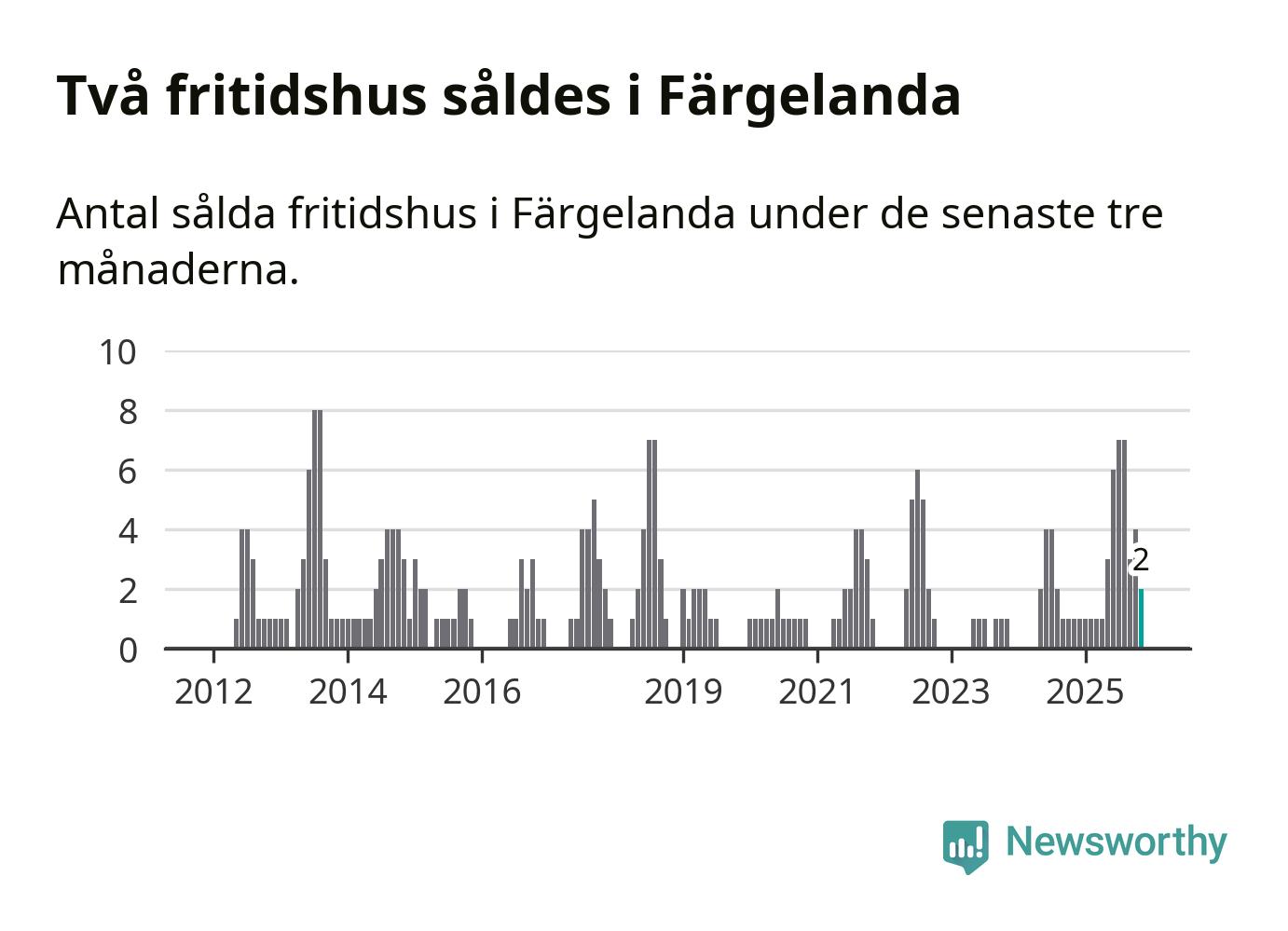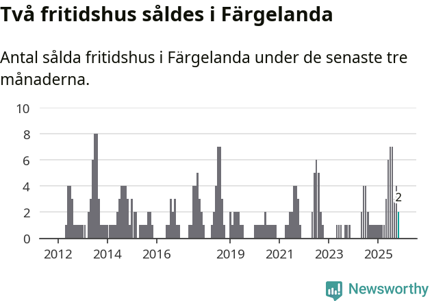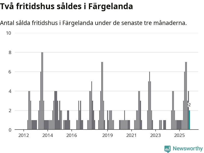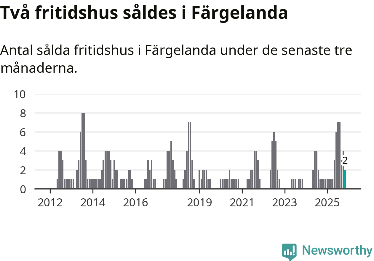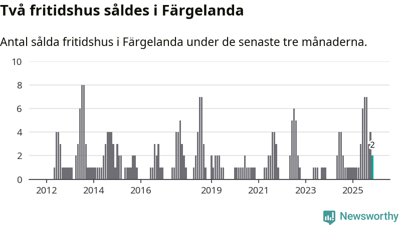 Mellan september och november gjordes sammanlagt två affärer med fritidshus i Färgelanda kommun. Det kan jämföras med ett vid motsvarande tid i fjol.