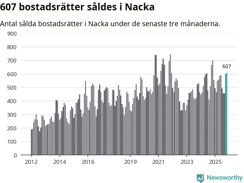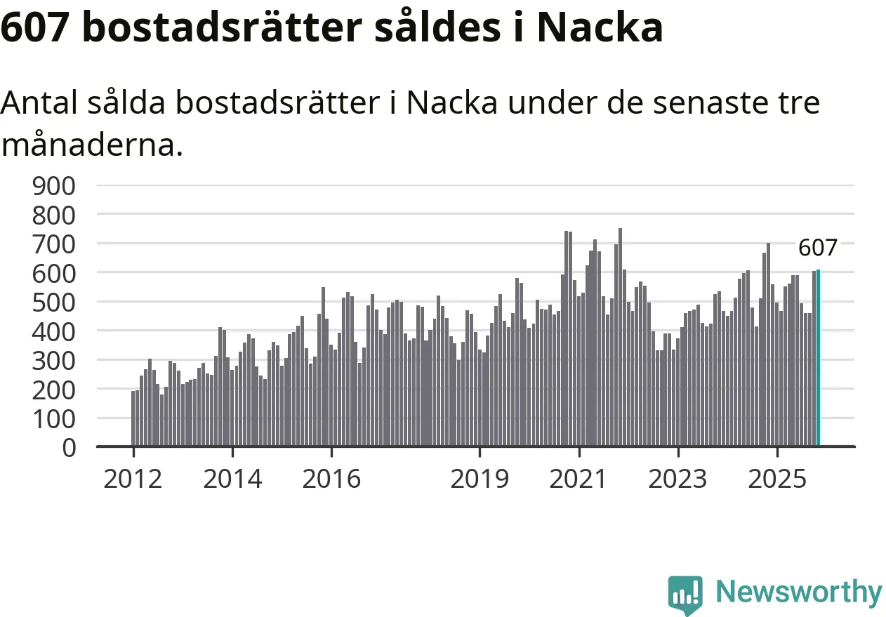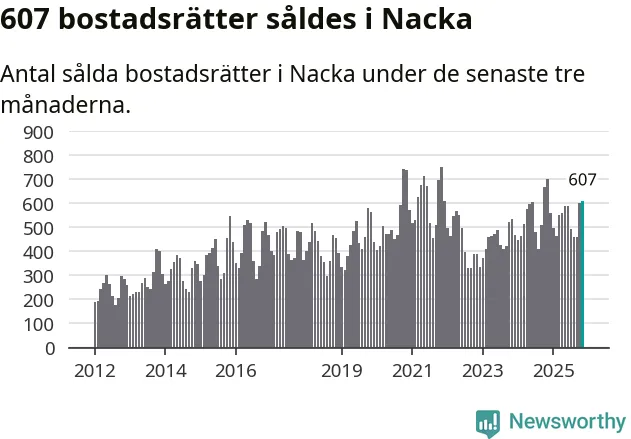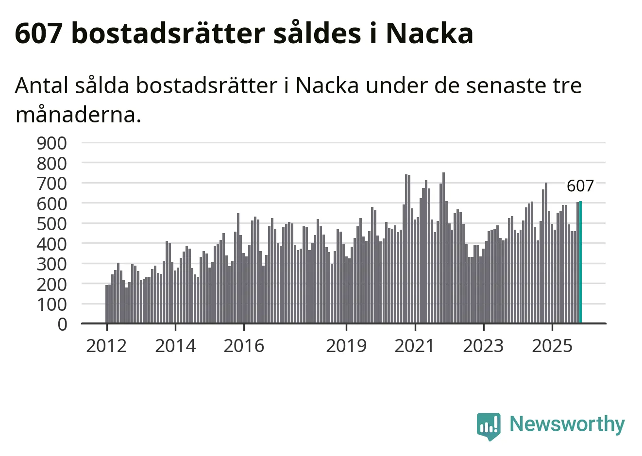 Sammanlagt såldes 607 bostadsrätter i Nacka kommun mellan september och november till ett genomsnittligt pris på 4,2 miljoner kronor. I fjol gjordes 700 affärer vid den här tiden på året.