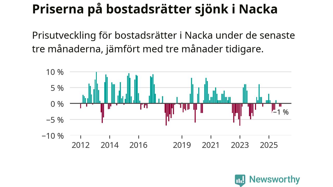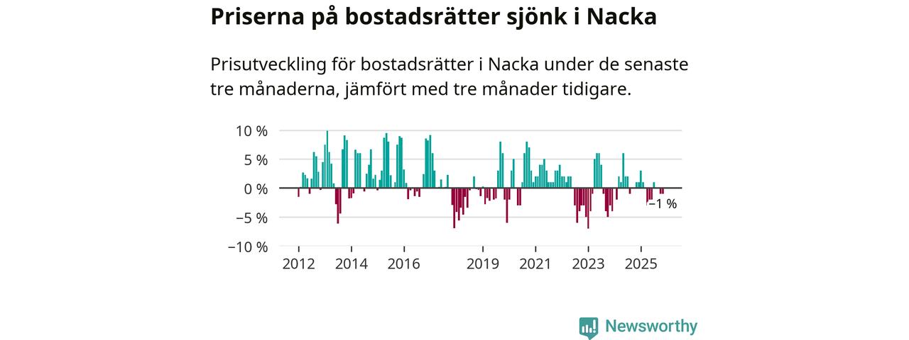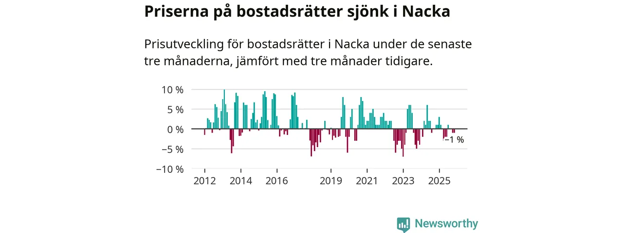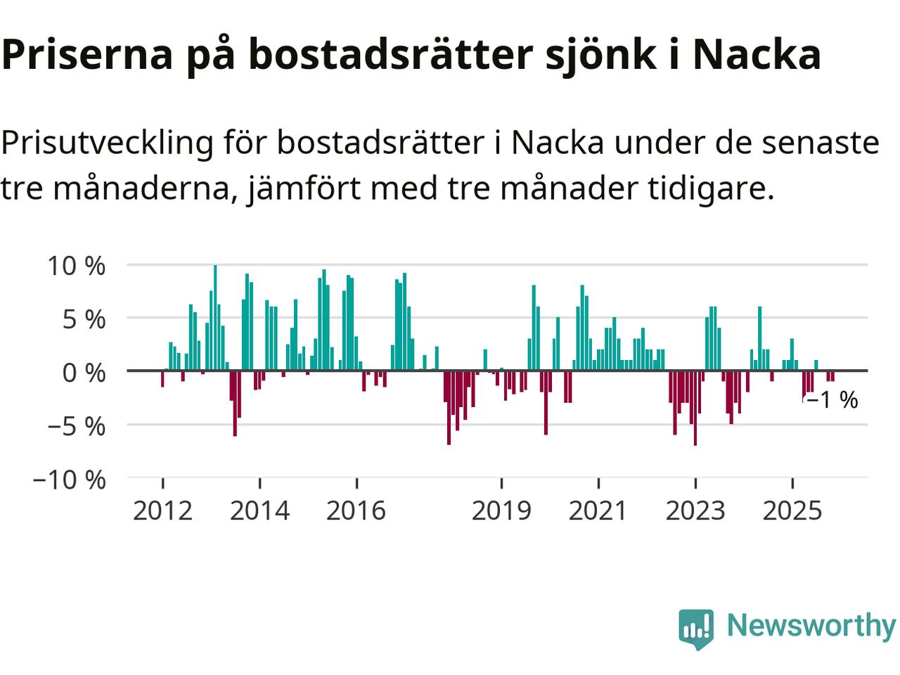 Priserna på bostadsrätter har gått ner i Nacka kommun. Medelpriset på försäljningarna under de senaste tre månaderna visar på en nedgång med 1 procent.