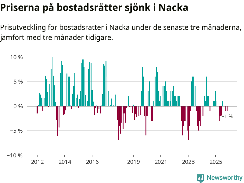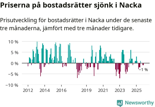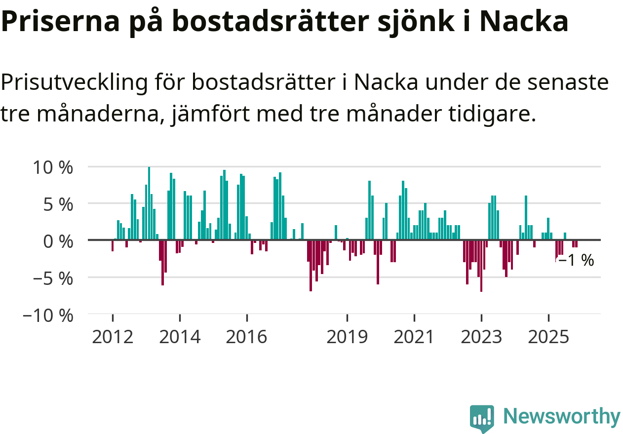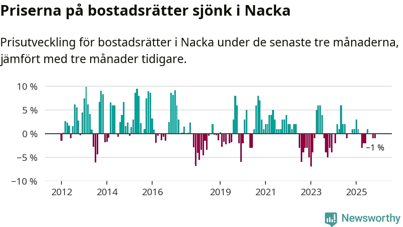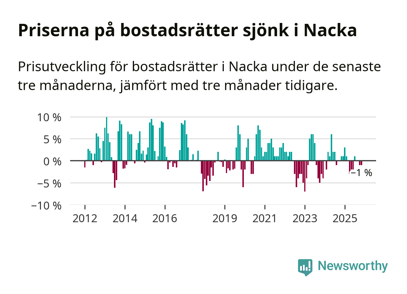 Priserna på bostadsrätter har gått ner i Nacka kommun. Medelpriset på försäljningarna under de senaste tre månaderna visar på en nedgång med 1 procent.