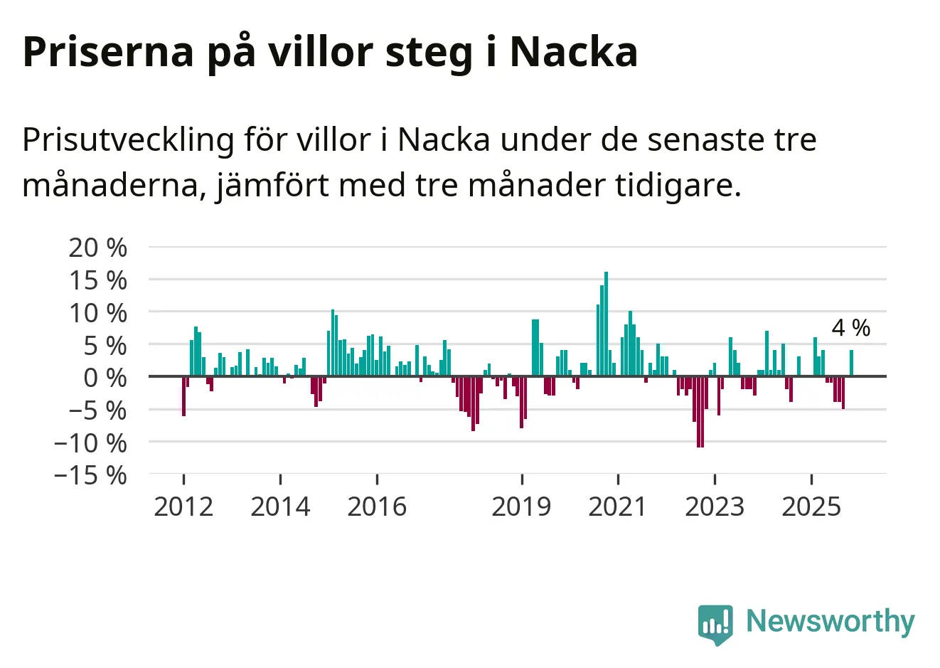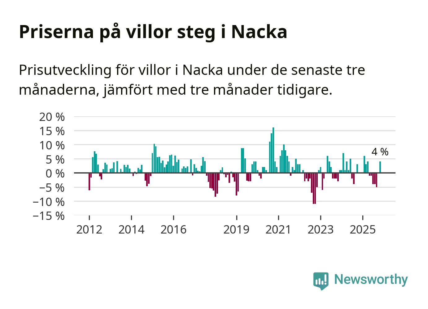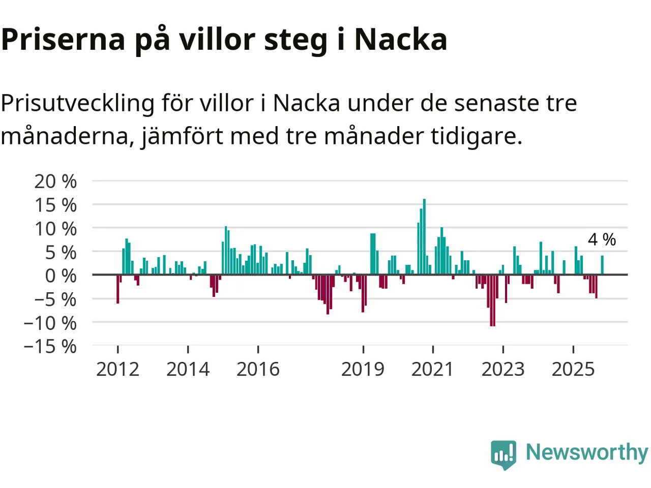Villapriserna har gått upp i Nacka kommun. Medelpriset på försäljningarna under de senaste tre månaderna visar på en uppgång med 4 procent.