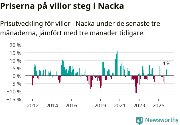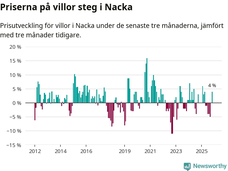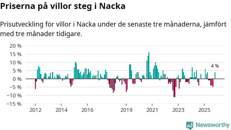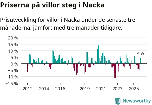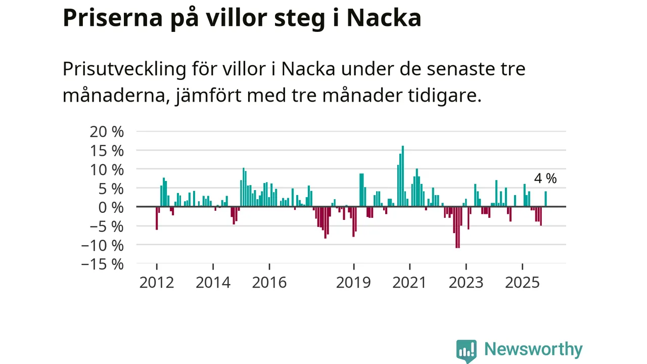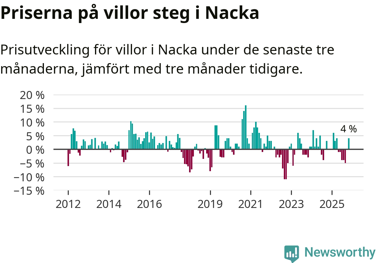 Villapriserna har gått upp i Nacka kommun. Medelpriset på försäljningarna under de senaste tre månaderna visar på en uppgång med 4 procent.