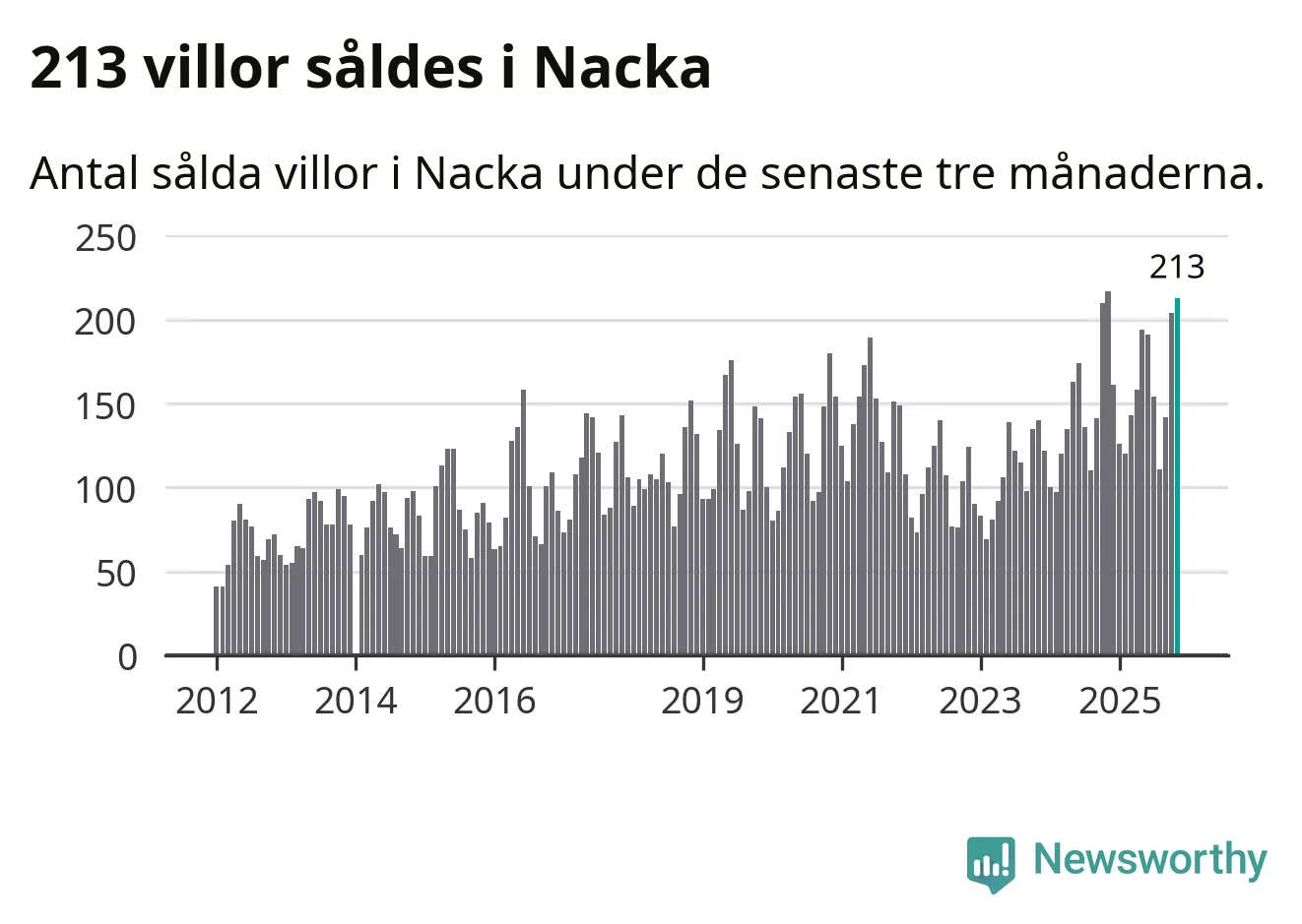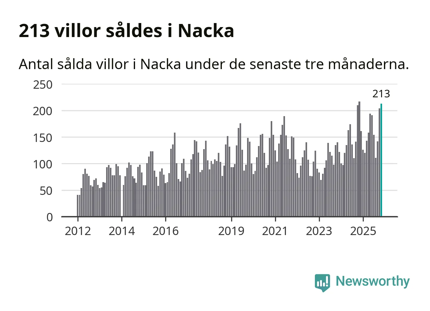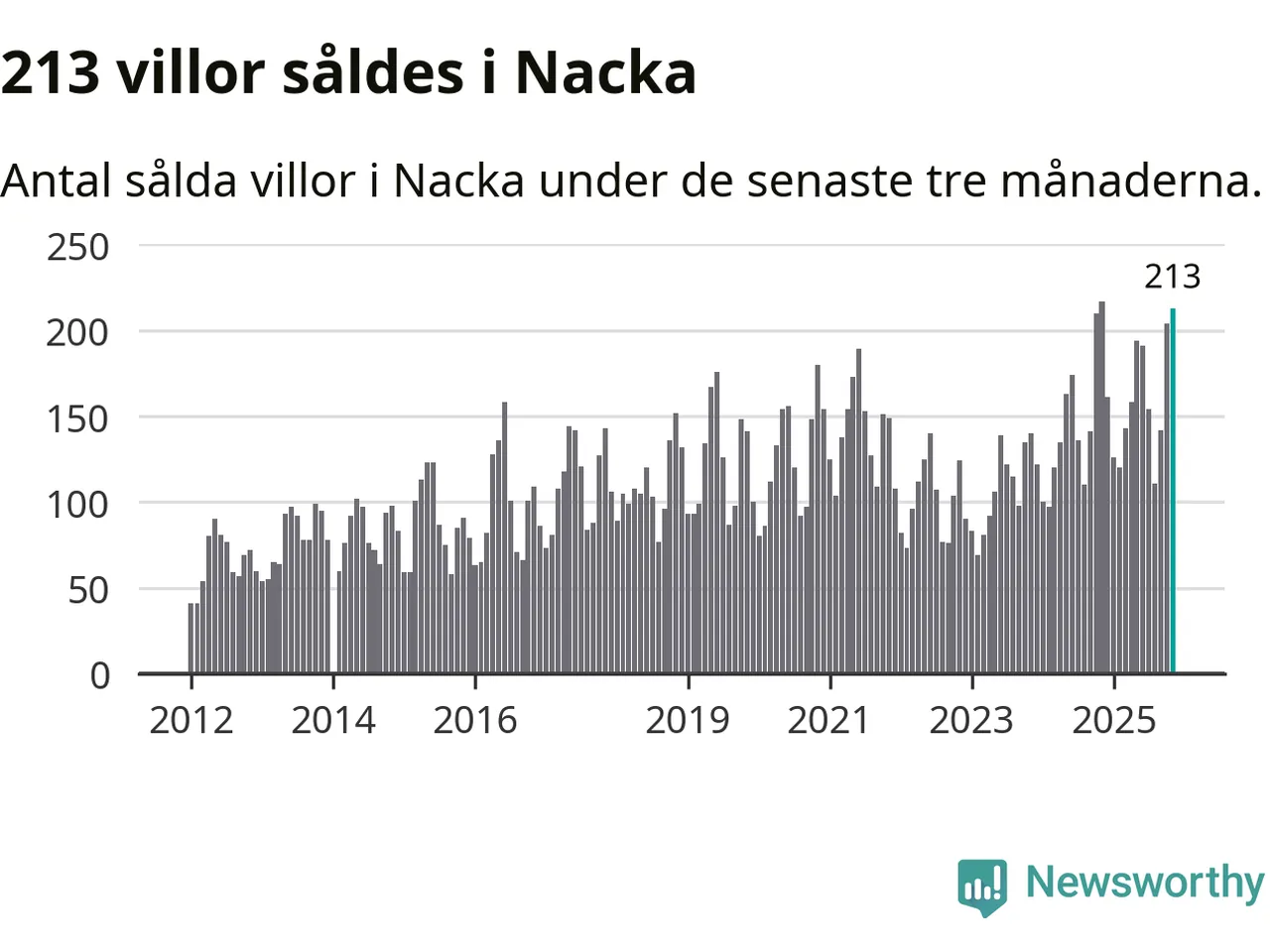 Sammanlagt såldes 213 villor i Nacka kommun mellan september och november till ett genomsnittligt pris på 10,4 miljoner kronor. I fjol gjordes 217 affärer vid den här tiden på året.