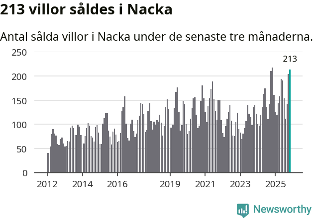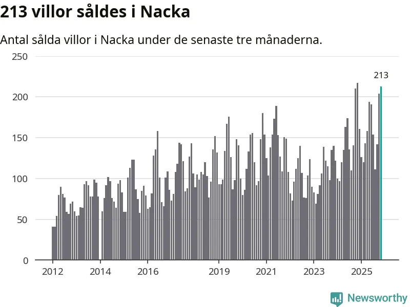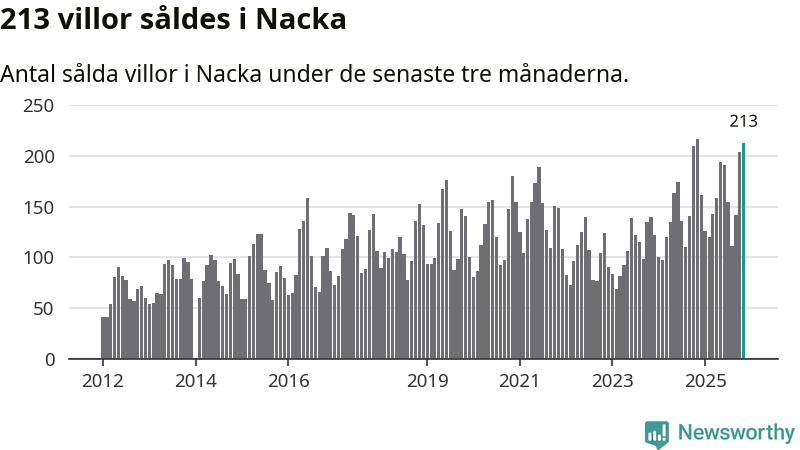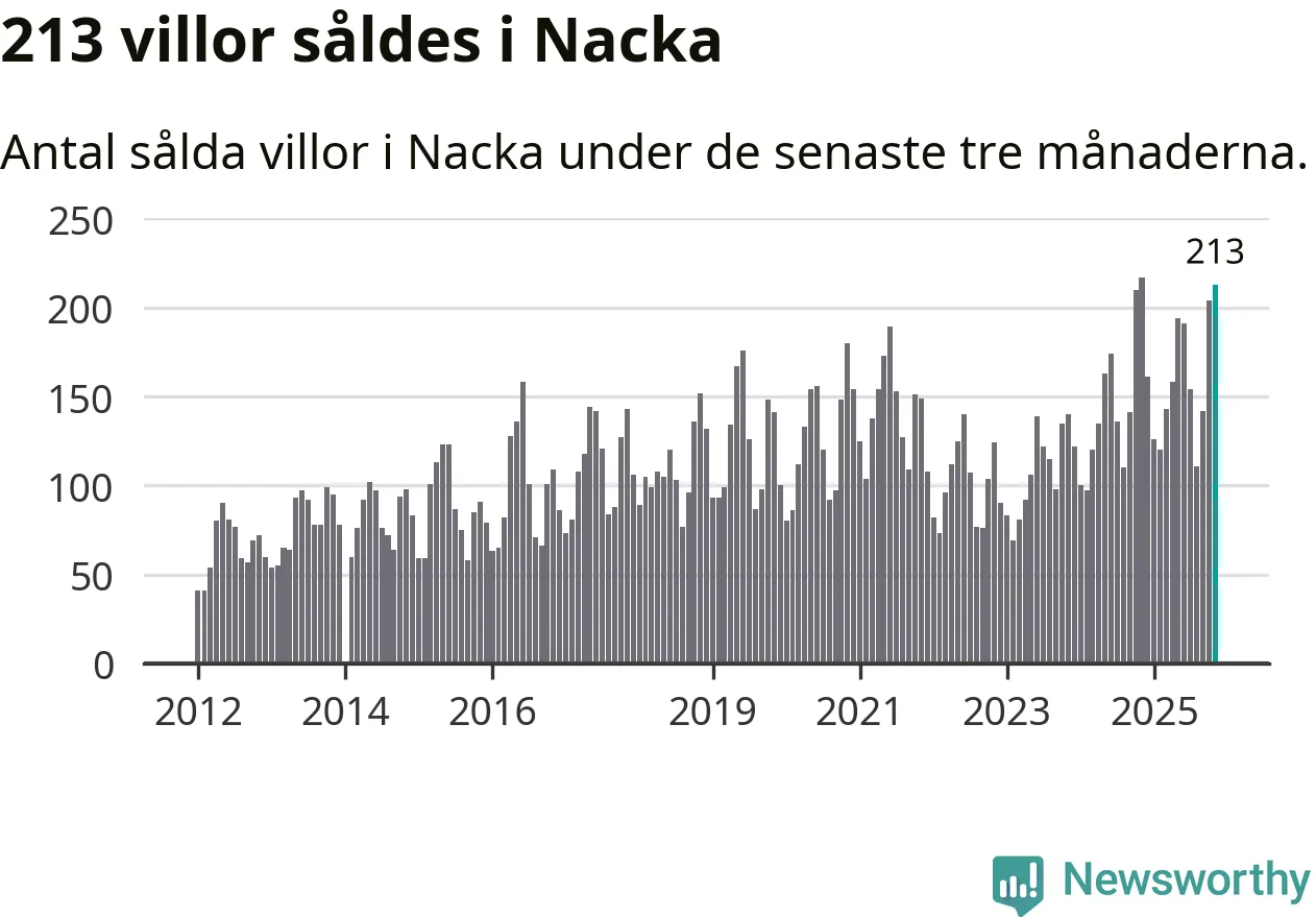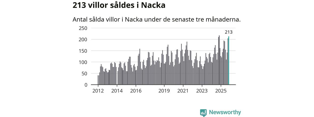 Sammanlagt såldes 213 villor i Nacka kommun mellan september och november till ett genomsnittligt pris på 10,4 miljoner kronor. I fjol gjordes 217 affärer vid den här tiden på året.