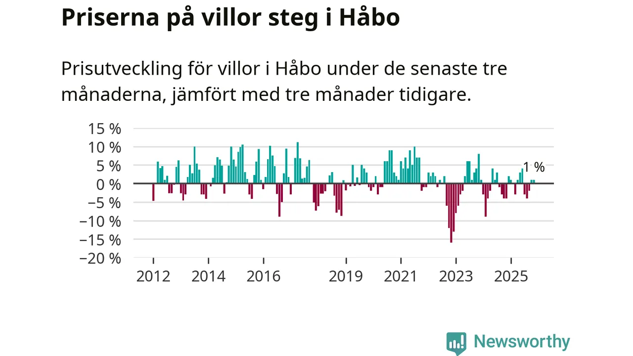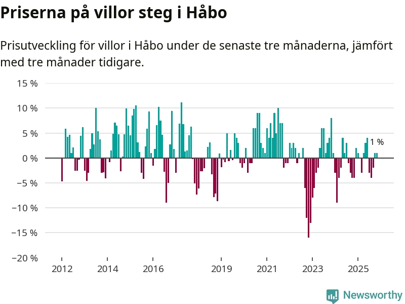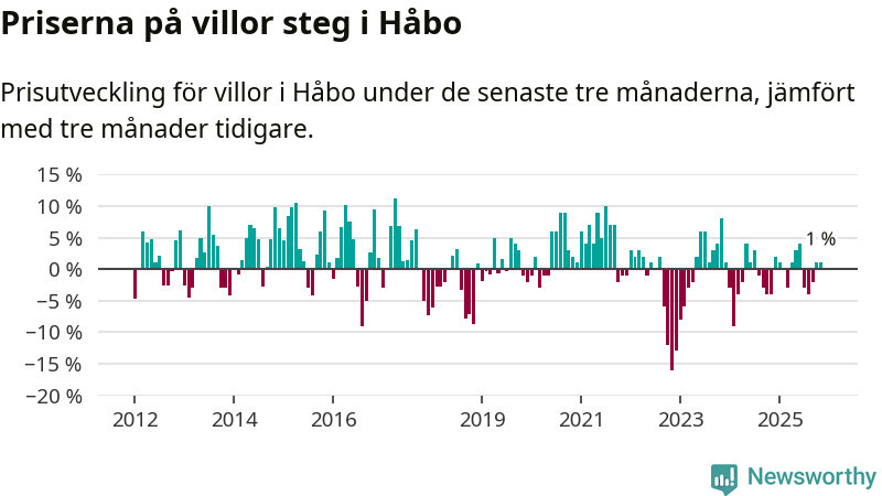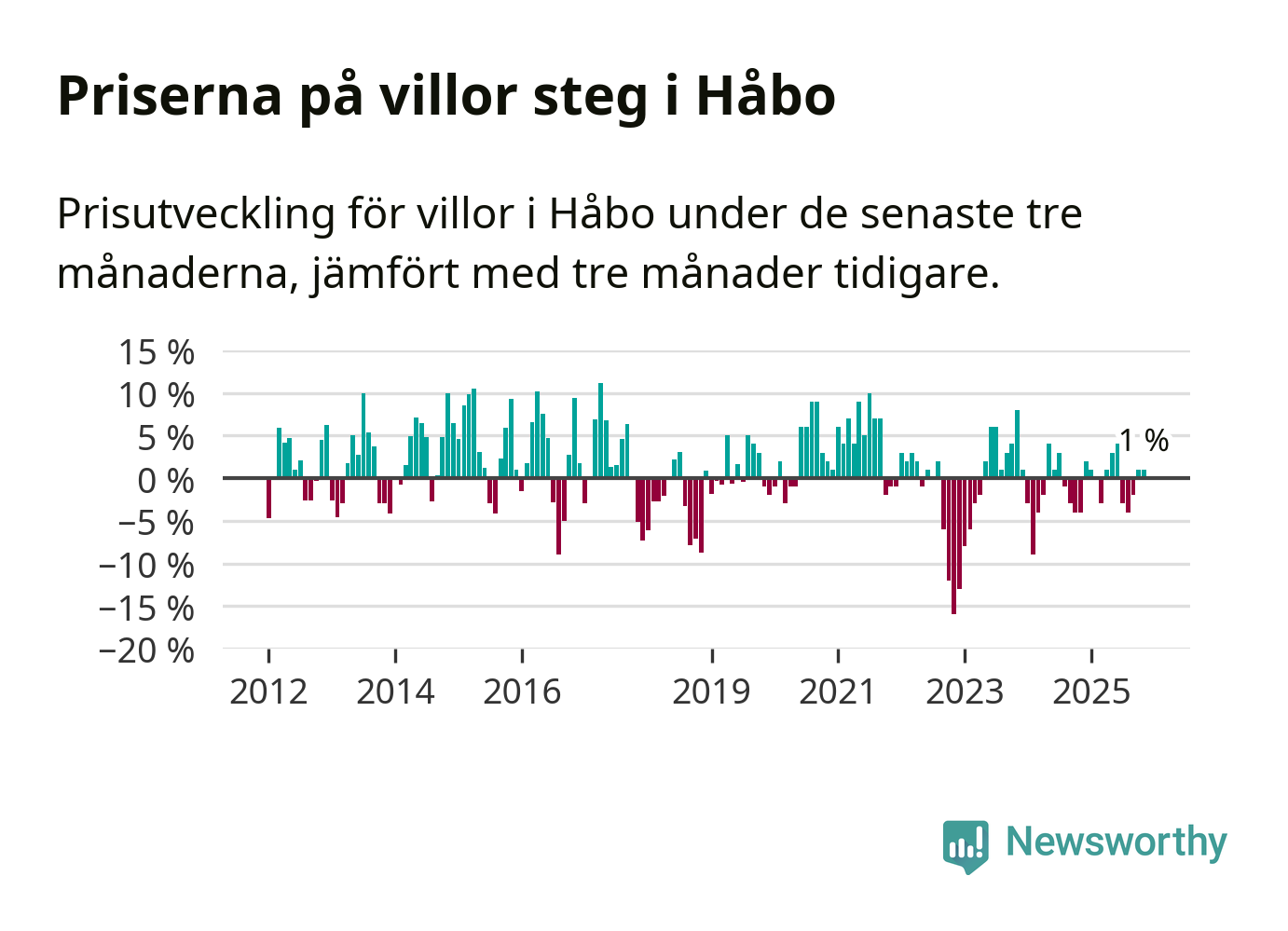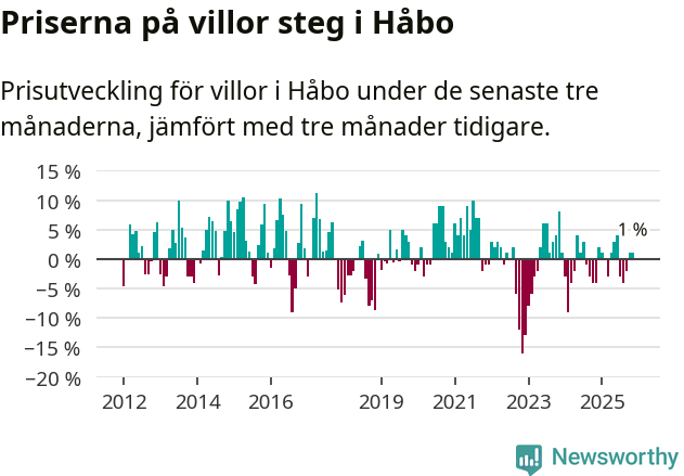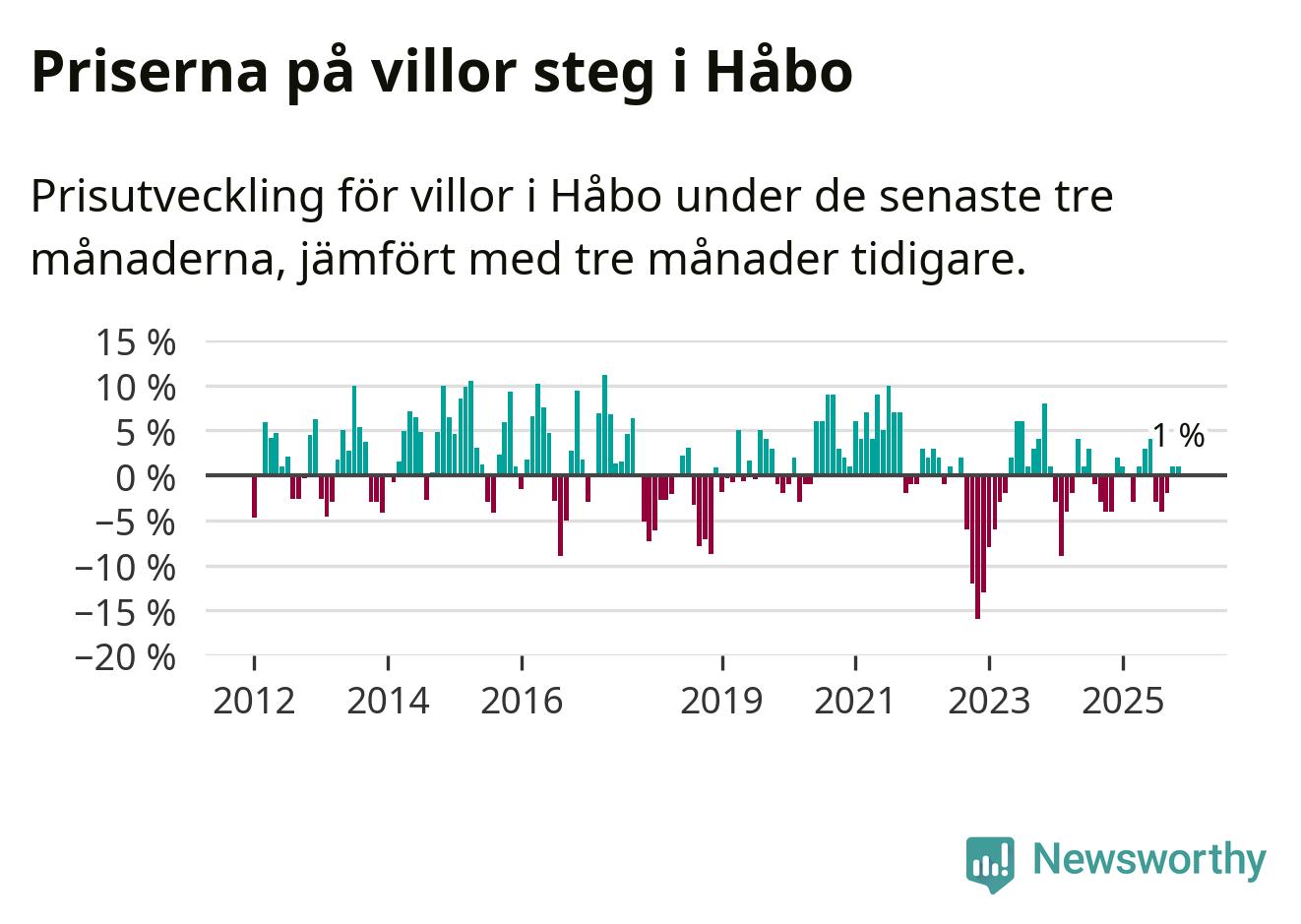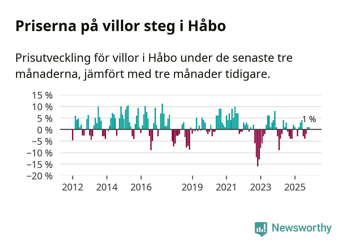 Villapriserna har gått upp i Håbo kommun. Medelpriset på försäljningarna under de senaste tre månaderna visar på en uppgång med 1 procent.