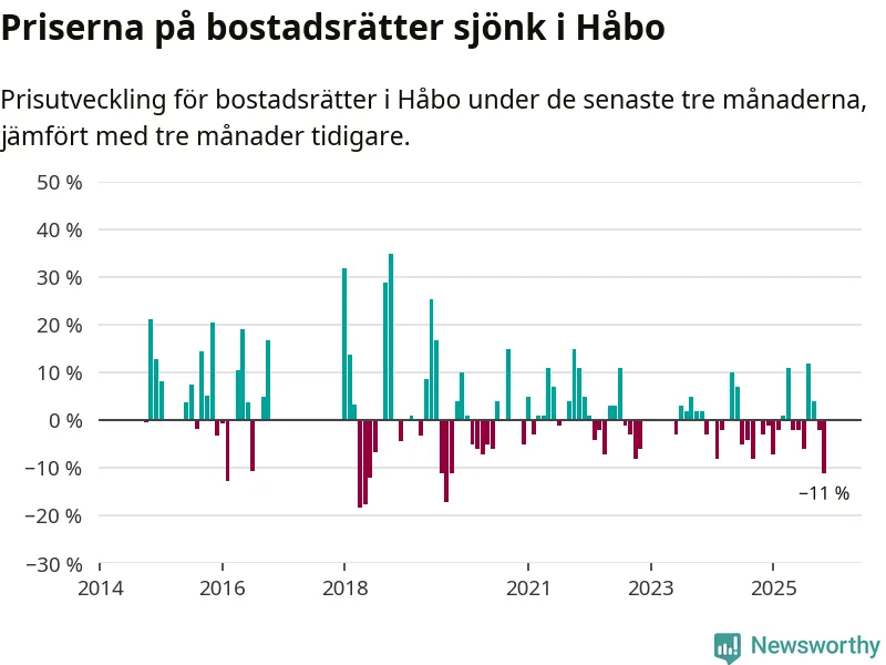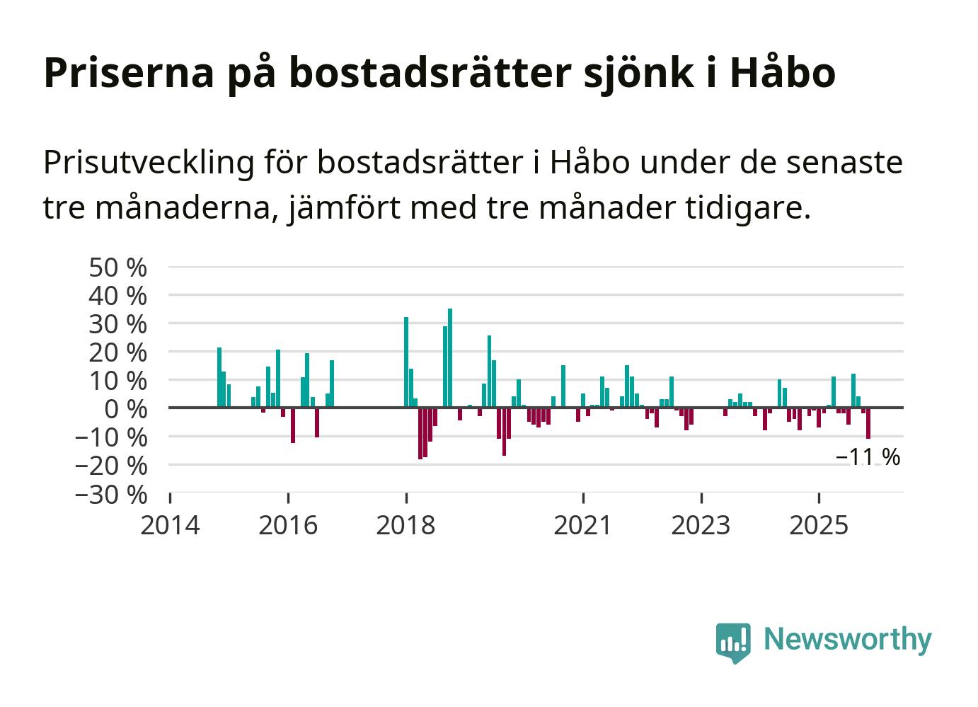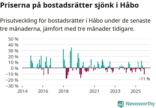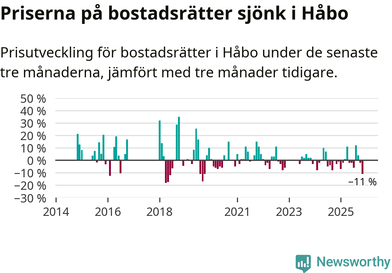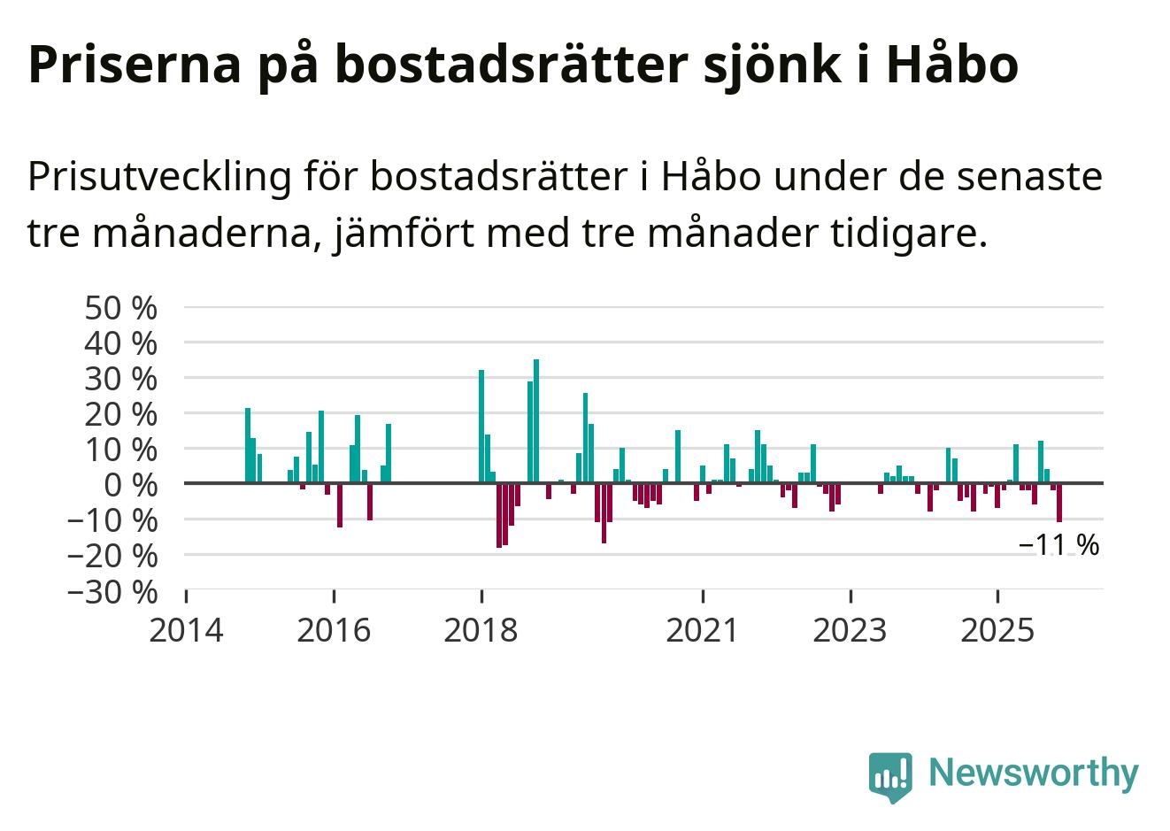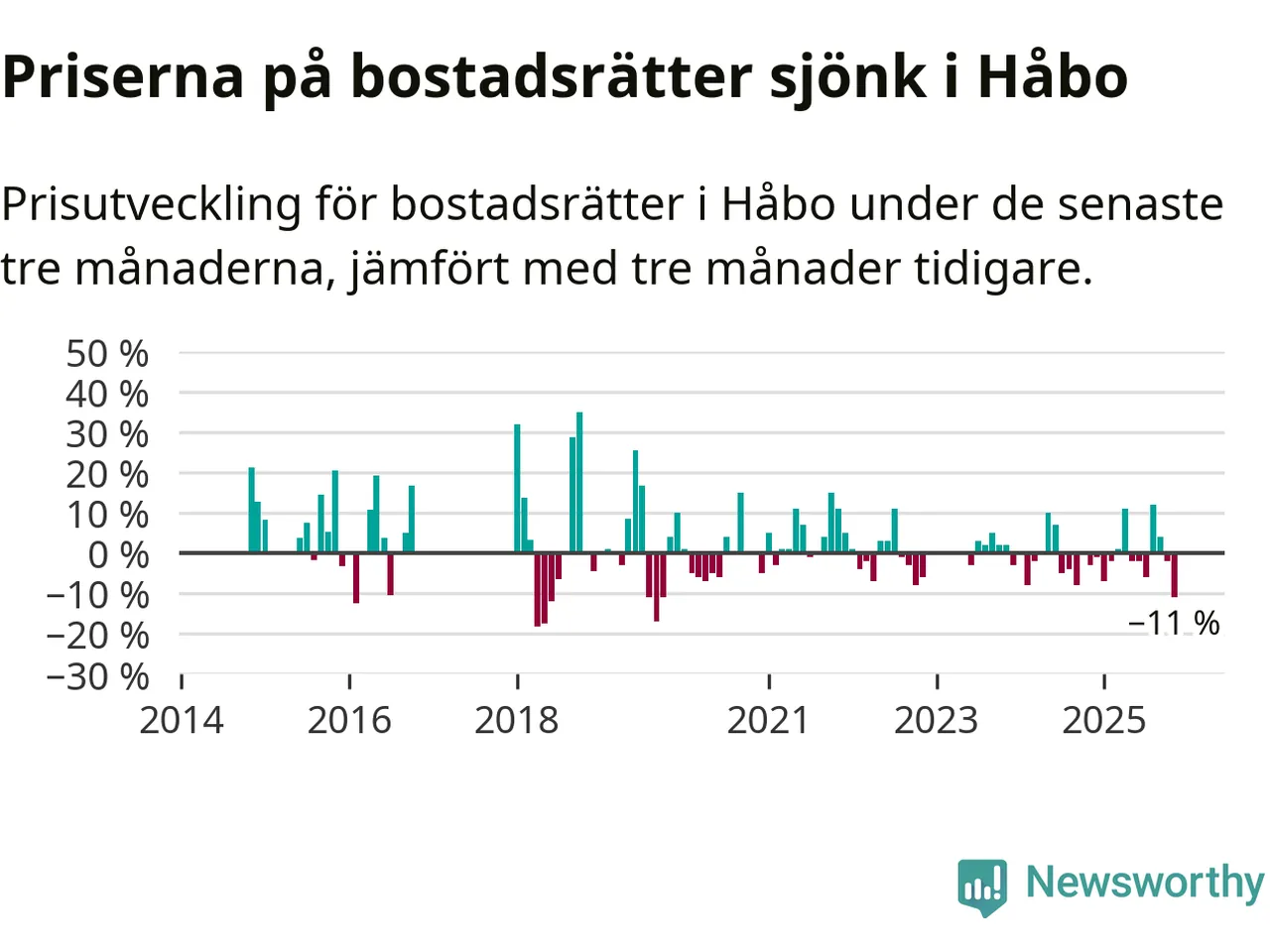 Priserna på bostadsrätter sjönk med elva procent i Håbo kommun under de senaste tre månaderna. Det är den svagaste prisutvecklingen sedan 2019.