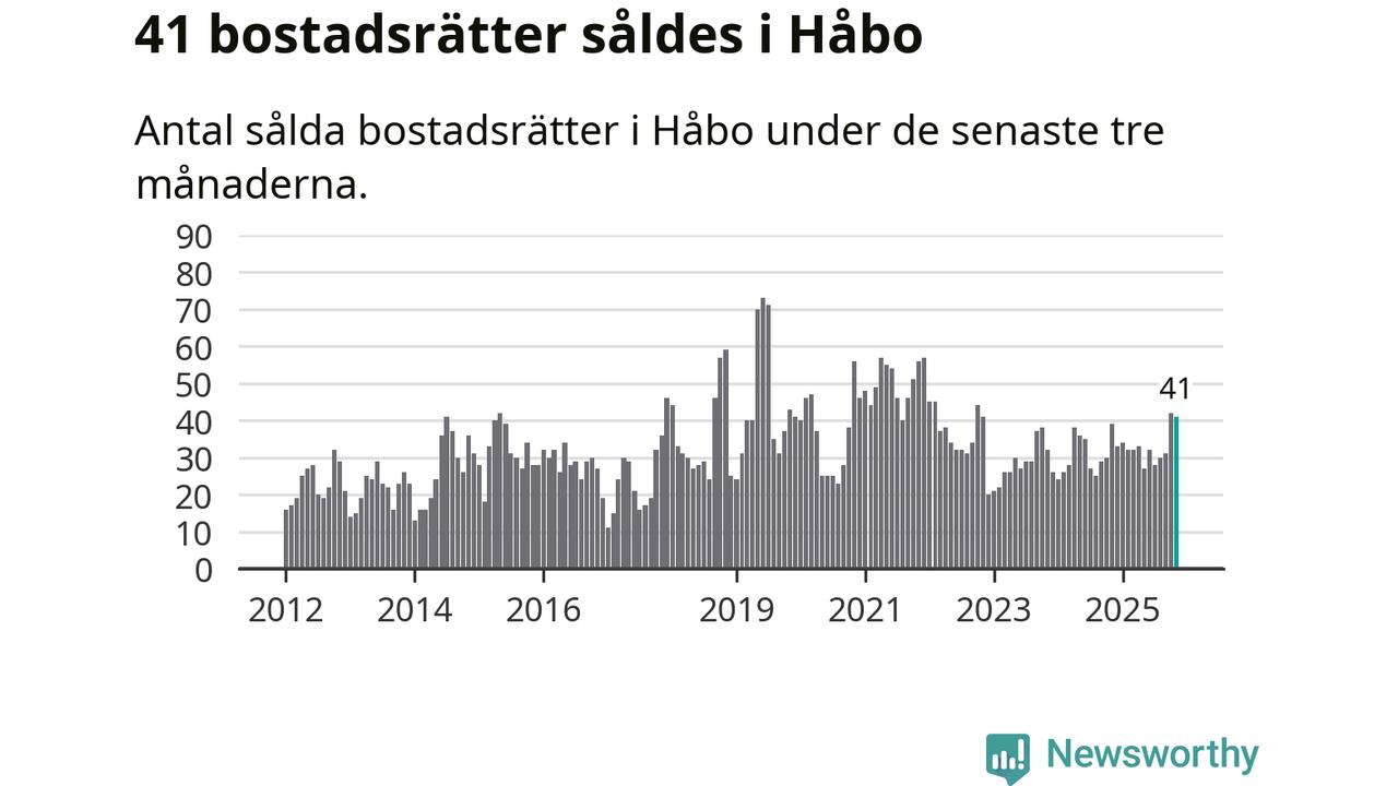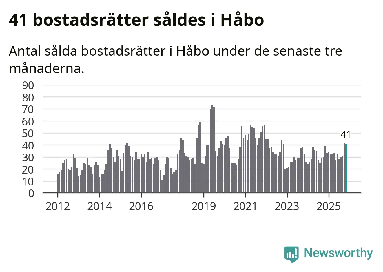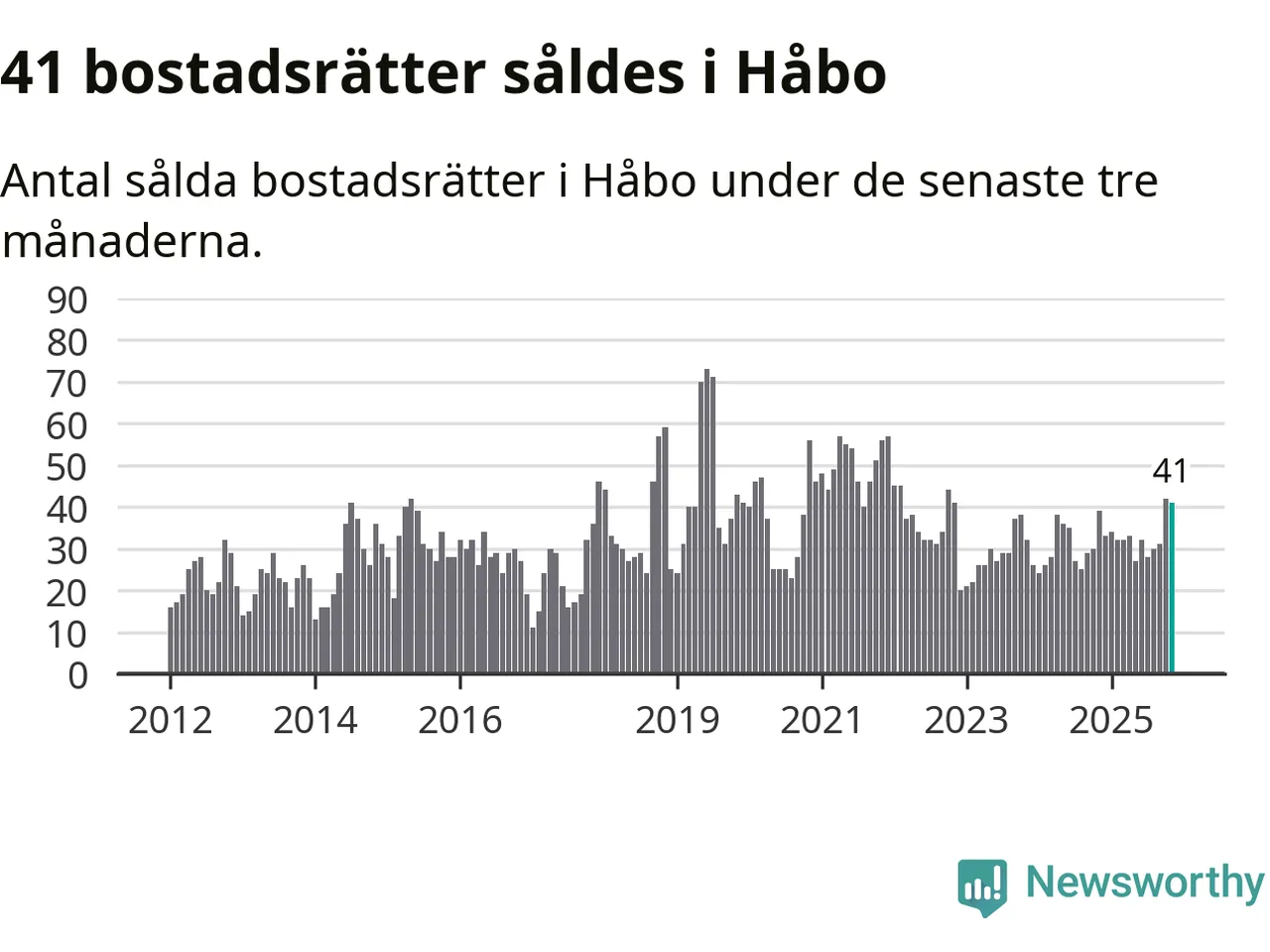 Sammanlagt såldes 41 bostadsrätter i Håbo kommun mellan september och november till ett genomsnittligt pris på 2,2 miljoner kronor. I fjol gjordes 39 affärer vid den här tiden på året.