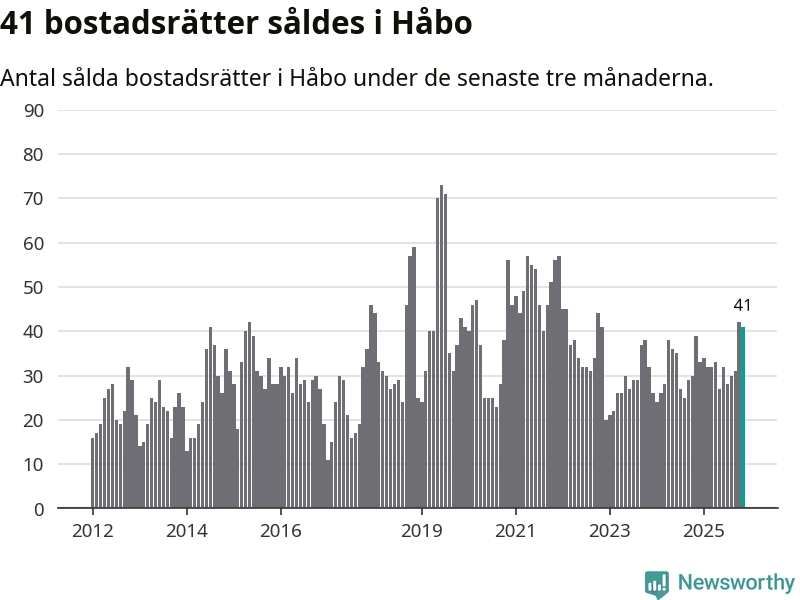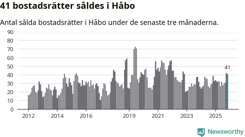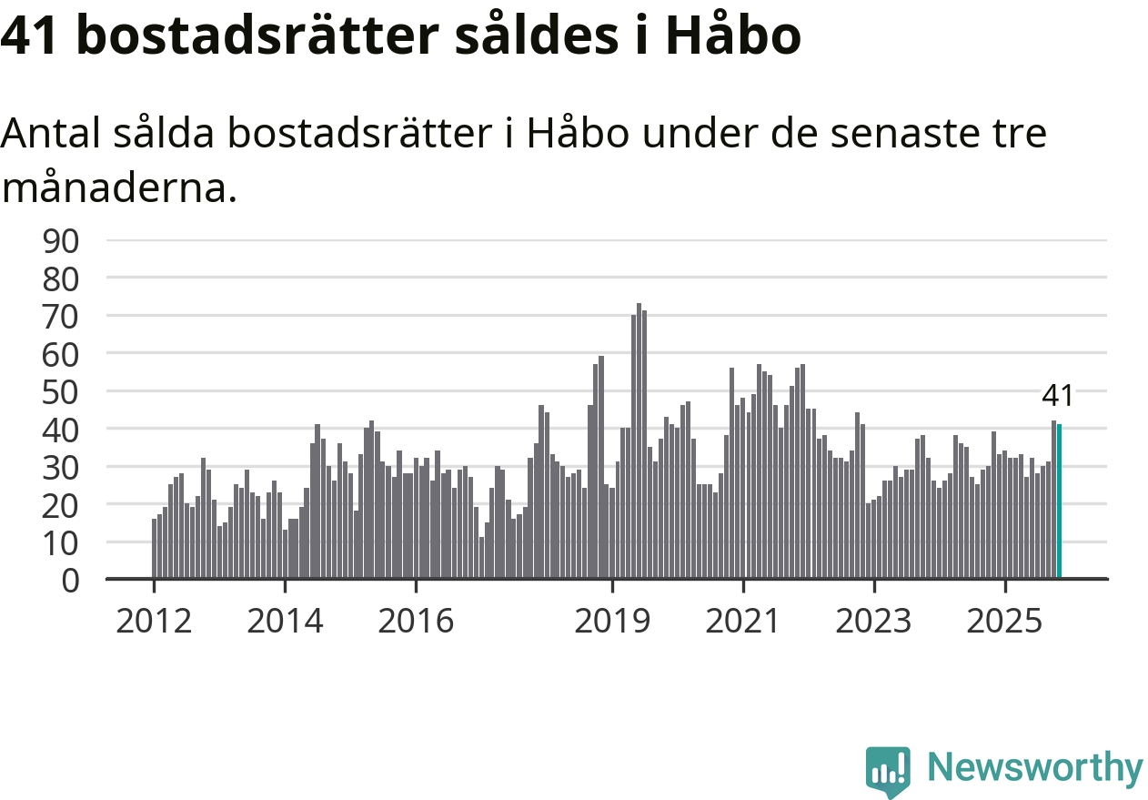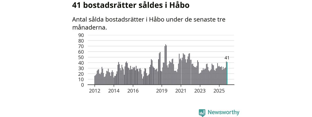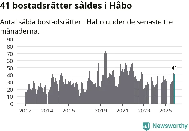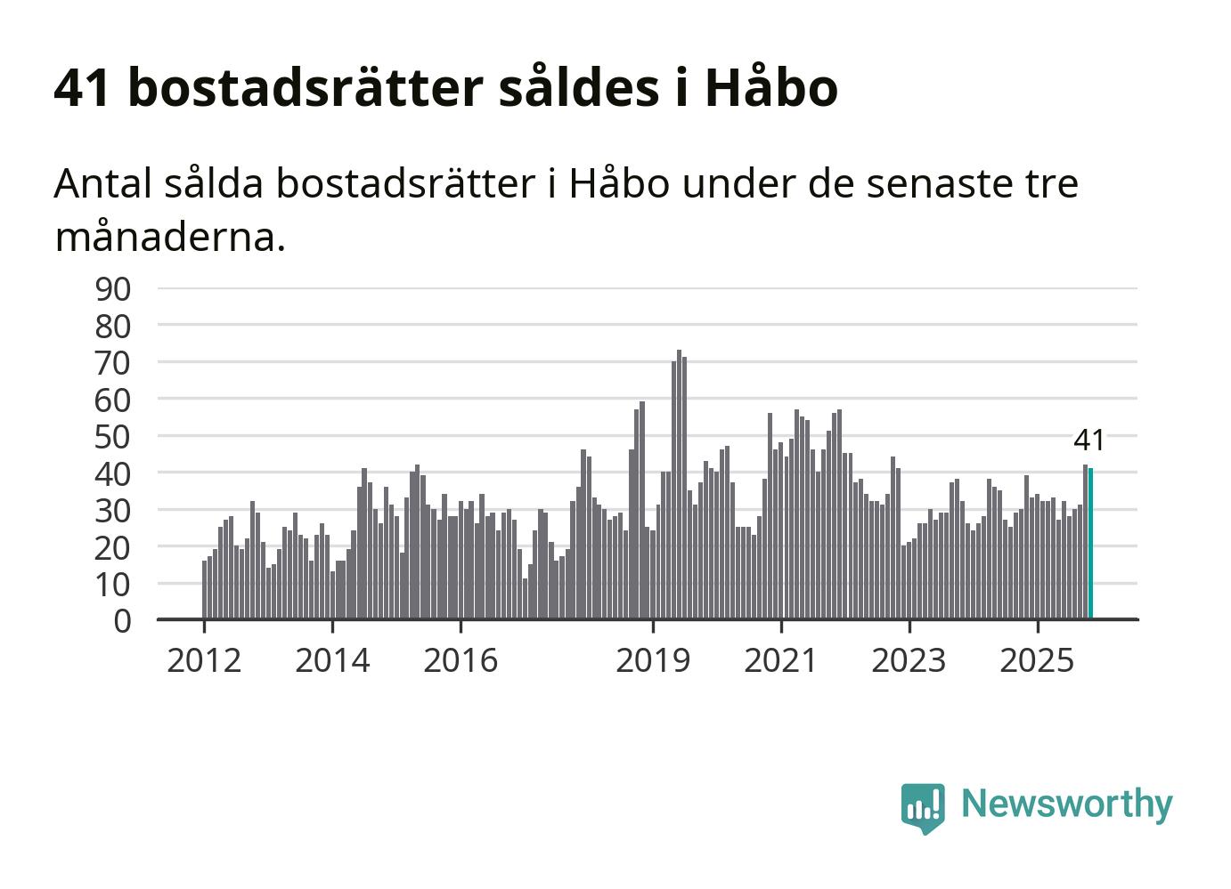 Sammanlagt såldes 41 bostadsrätter i Håbo kommun mellan september och november till ett genomsnittligt pris på 2,2 miljoner kronor. I fjol gjordes 39 affärer vid den här tiden på året.
