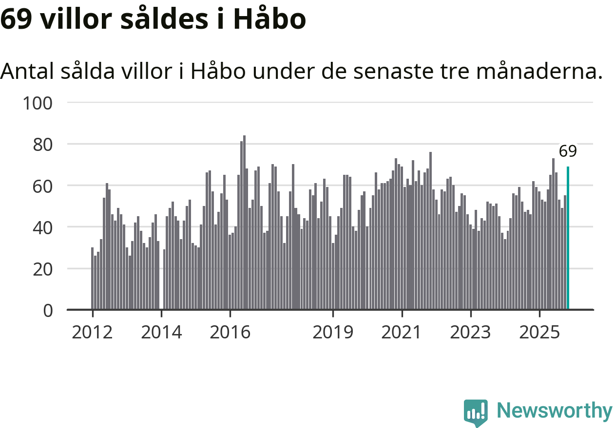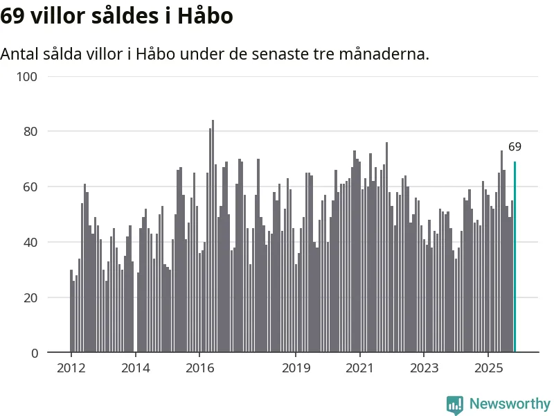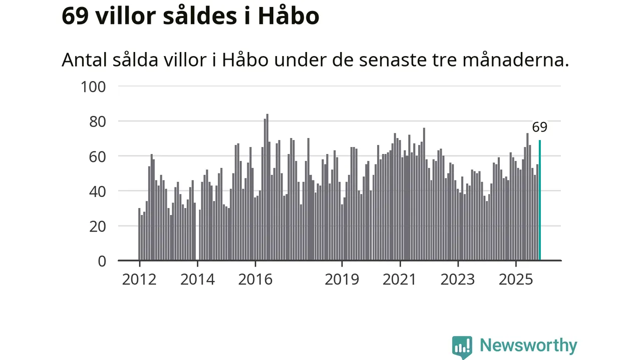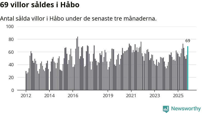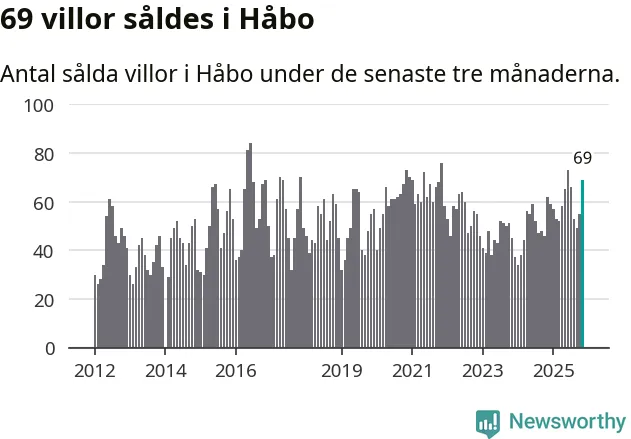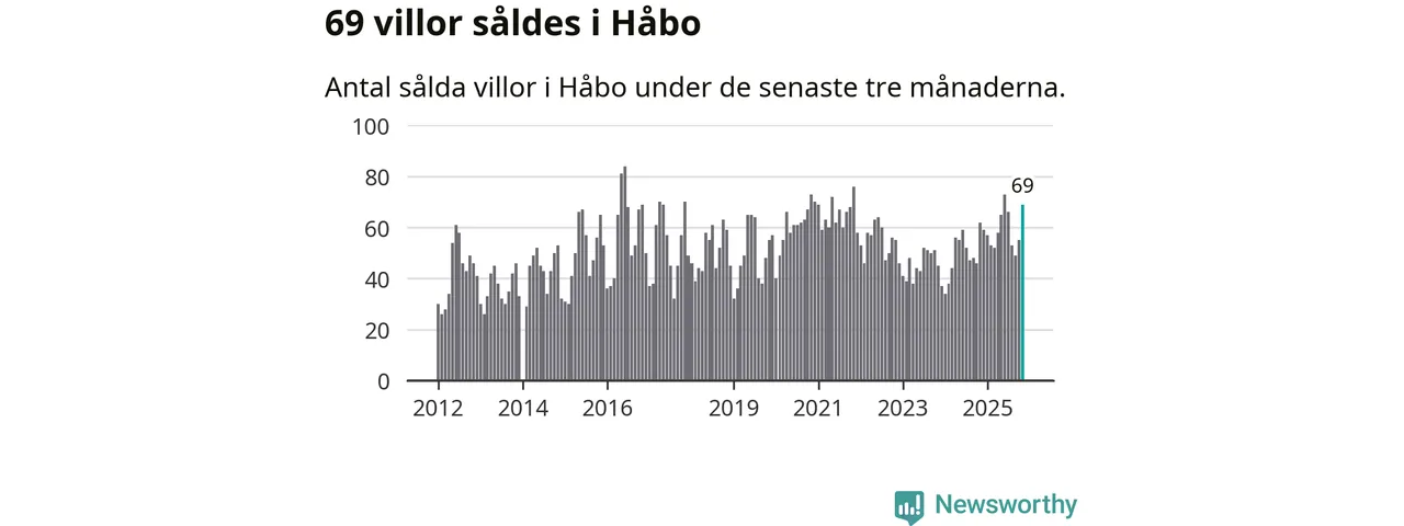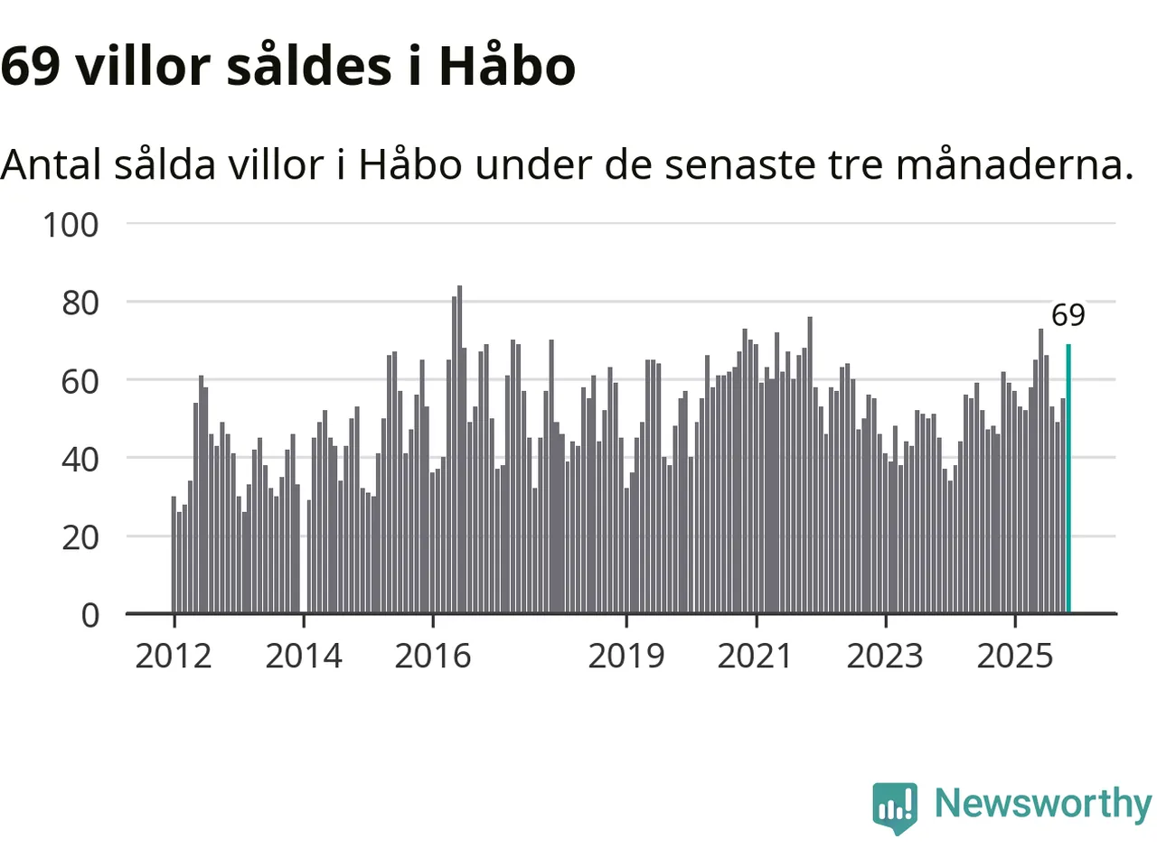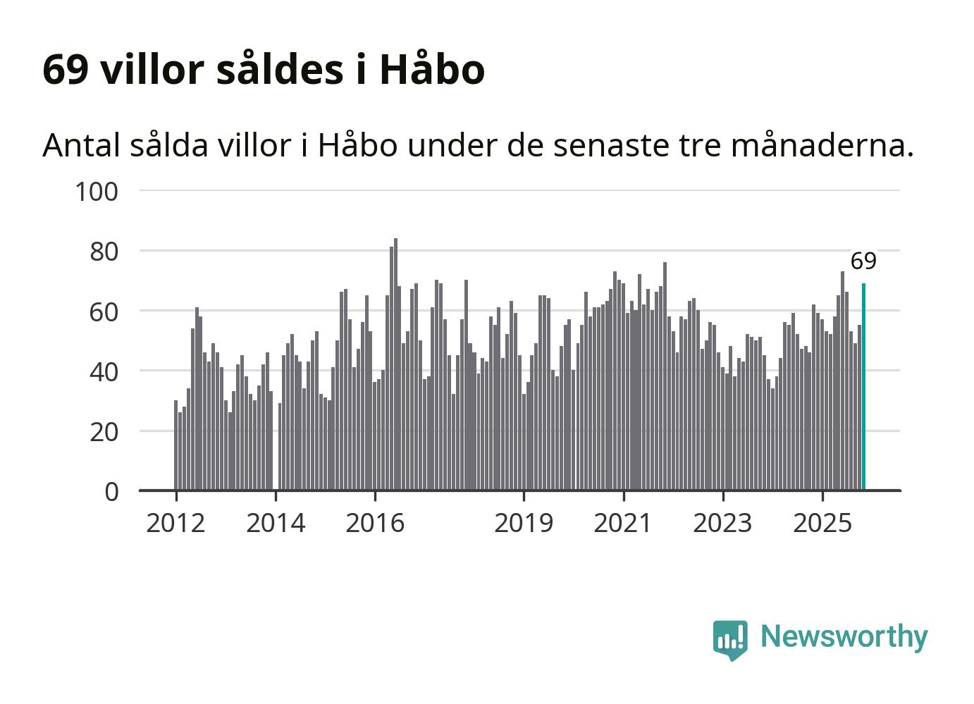 Sammanlagt såldes 69 villor i Håbo kommun mellan september och november till ett genomsnittligt pris på 4,2 miljoner kronor. I fjol gjordes 62 affärer vid den här tiden på året.