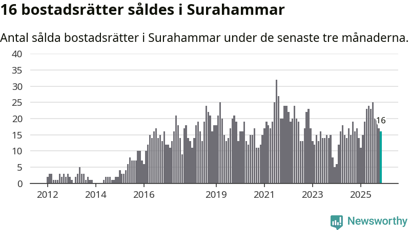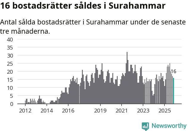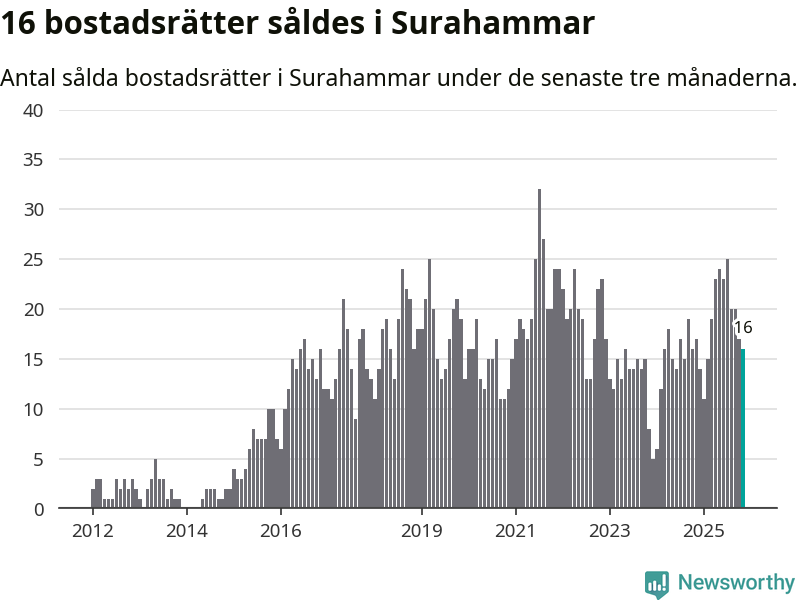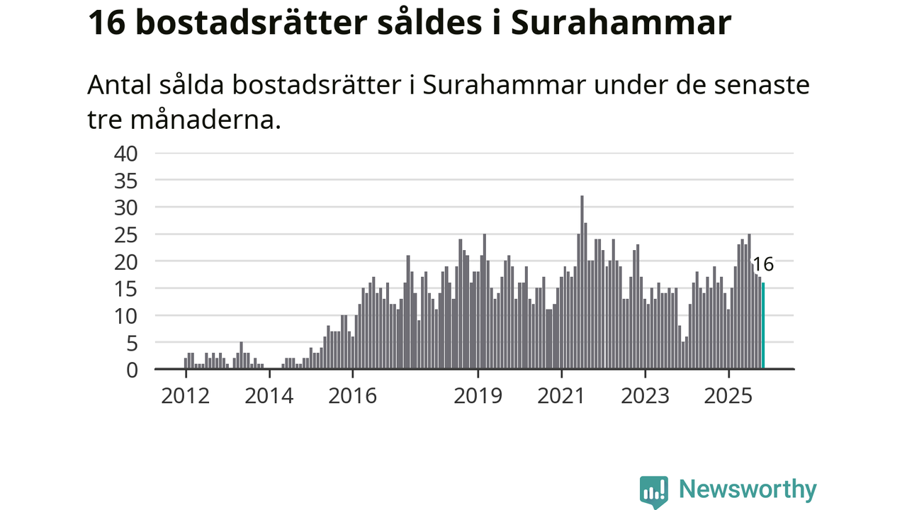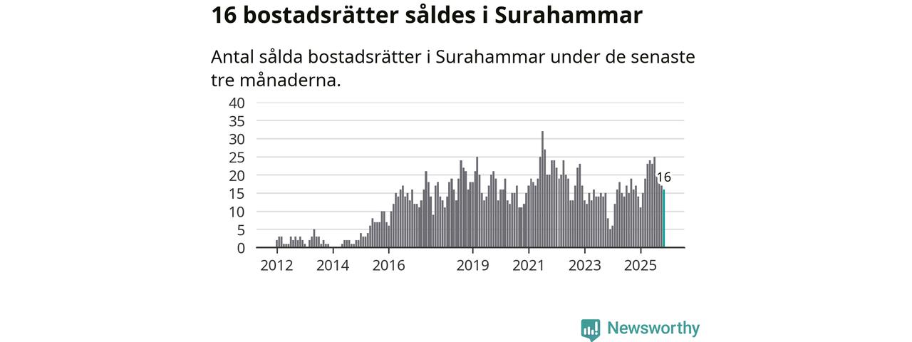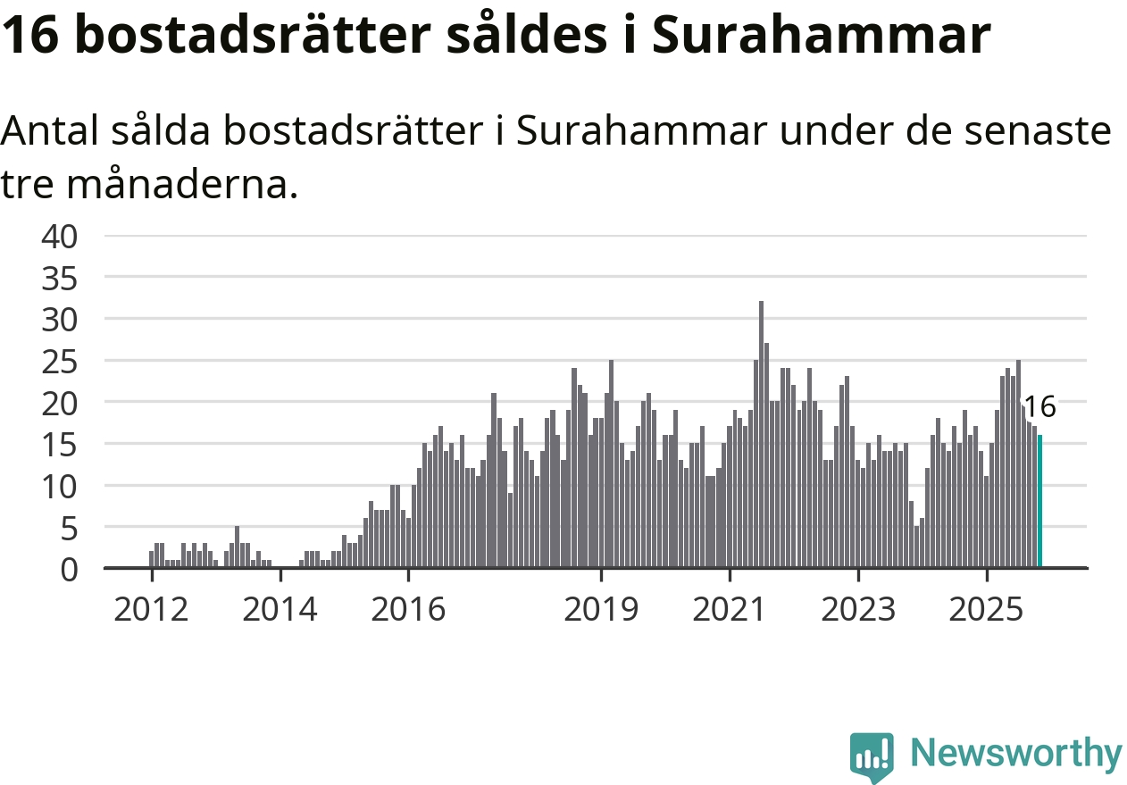 Mellan september och november gjordes sammanlagt 16 affärer med bostadsrätter i Surahammars kommun. Det kan jämföras med 17 vid motsvarande tid i fjol.