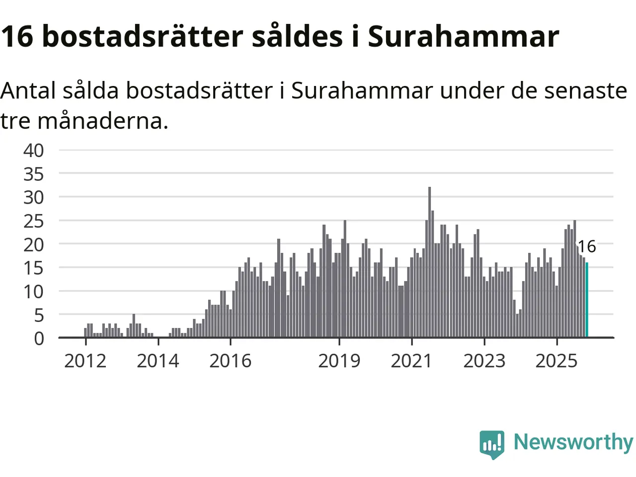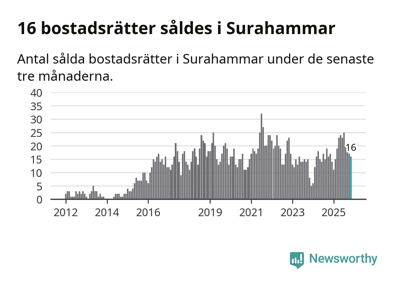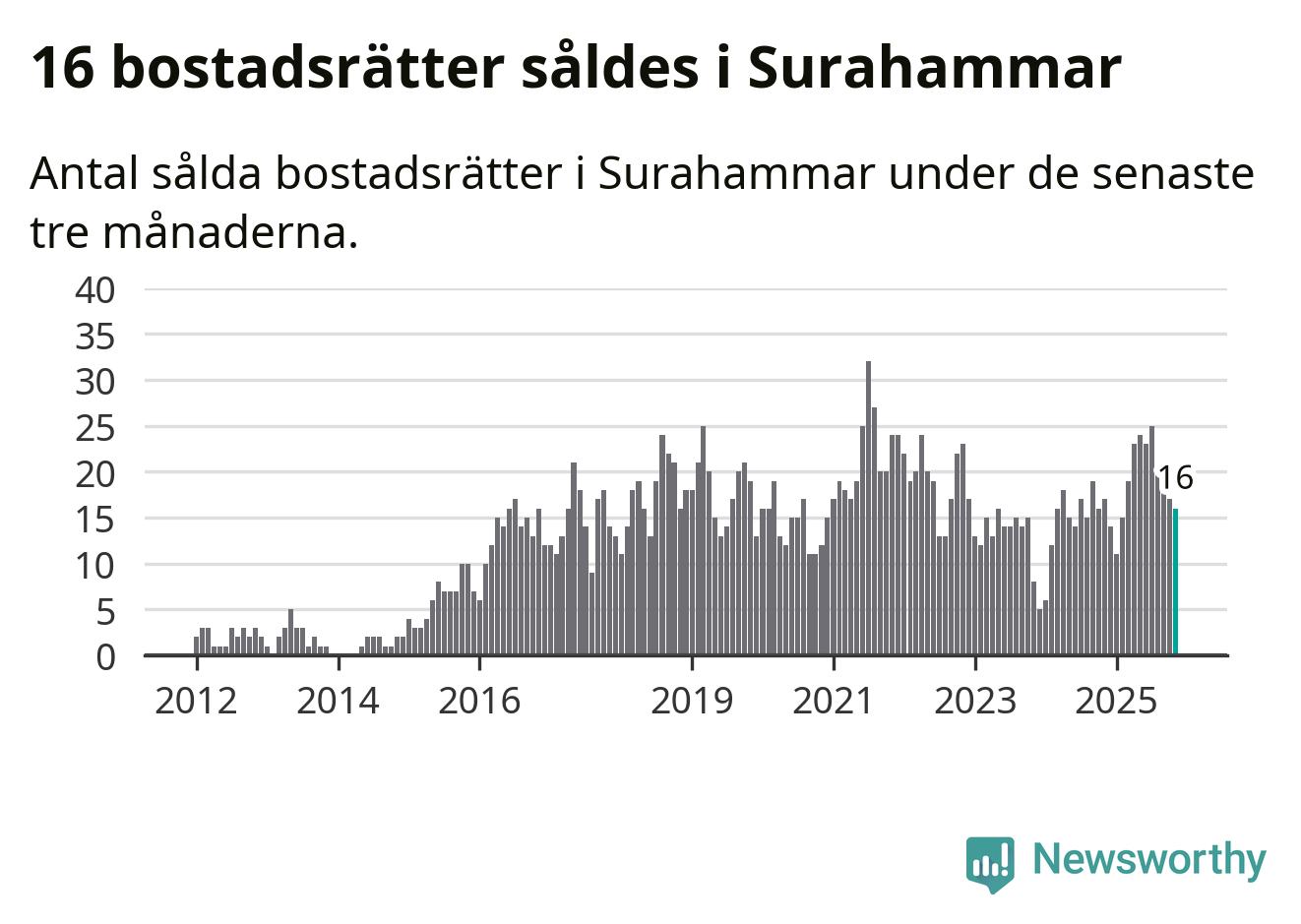 Mellan september och november gjordes sammanlagt 16 affärer med bostadsrätter i Surahammars kommun. Det kan jämföras med 17 vid motsvarande tid i fjol.