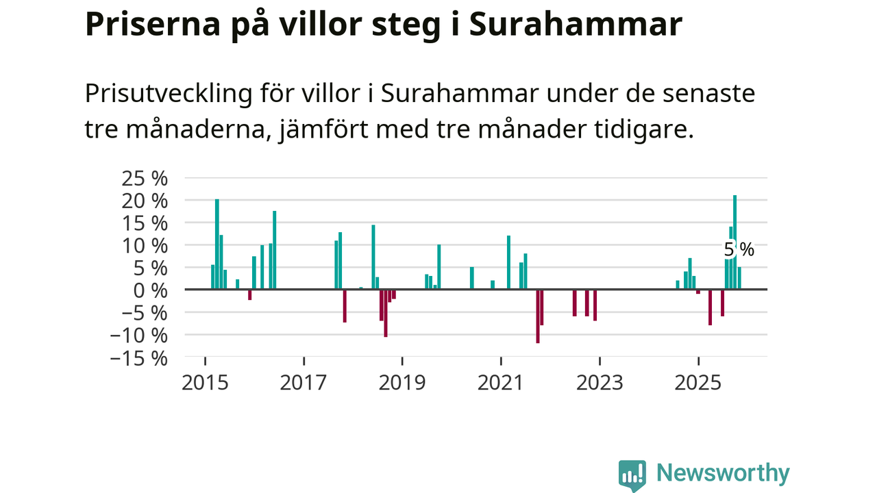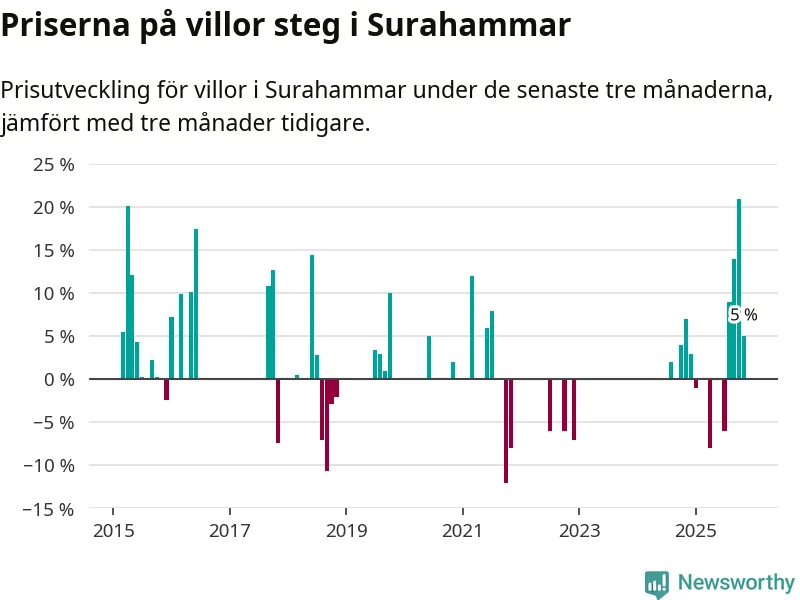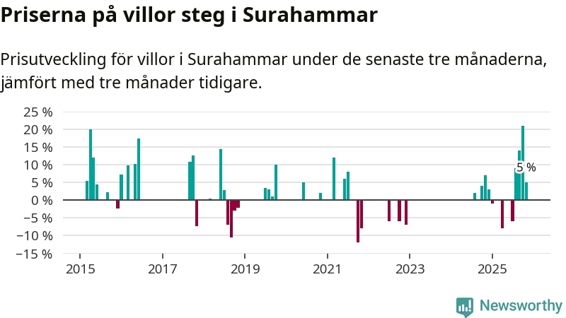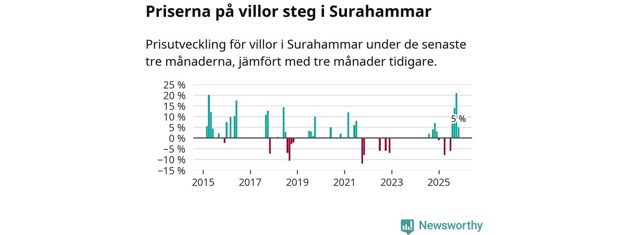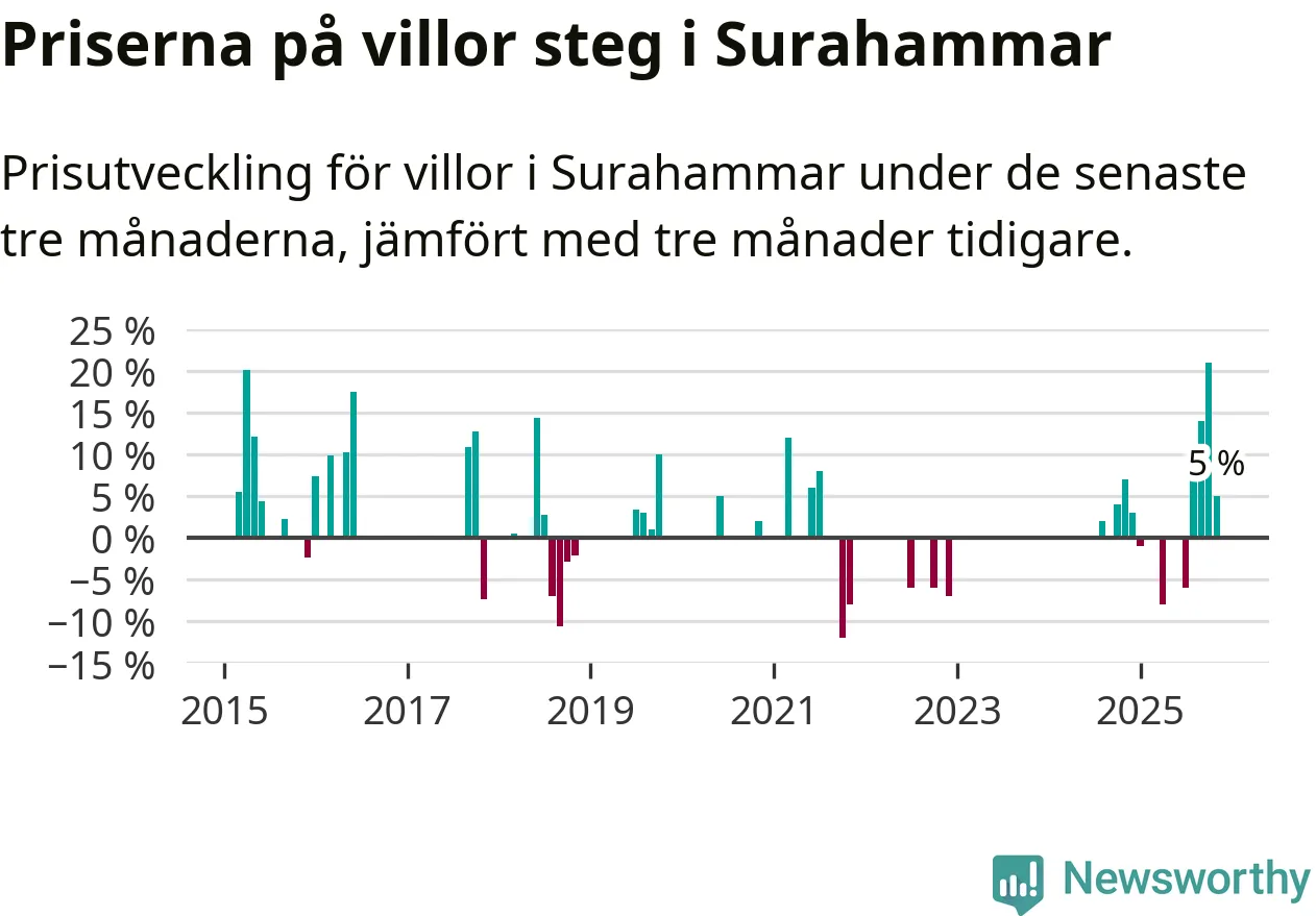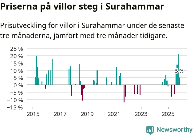 Statistiken visar även på en kännbar prisuppgång i Surahammars kommun. Medelpriset på försäljningarna av villor i kommunen var 5 procent högre än för tre månader sedan. I hela Västmanland däremot sjunker villapriserna. I hela länet noterades en prisnedgång på 2 procent.