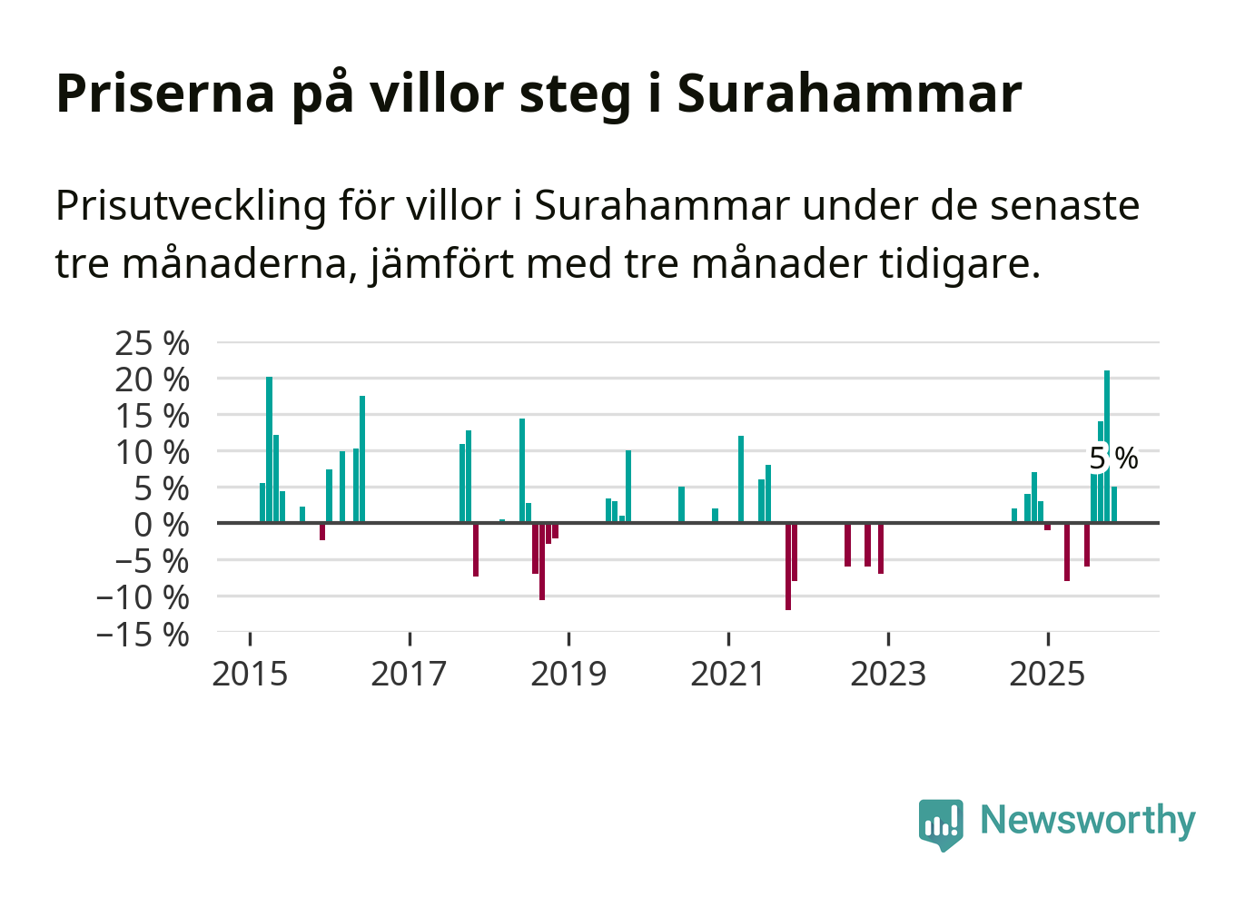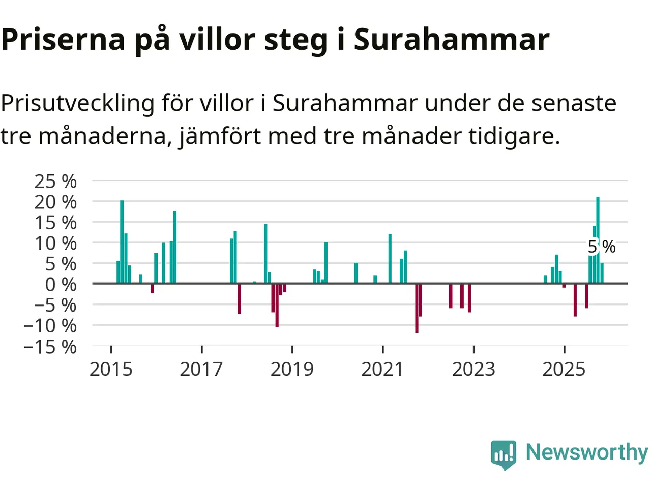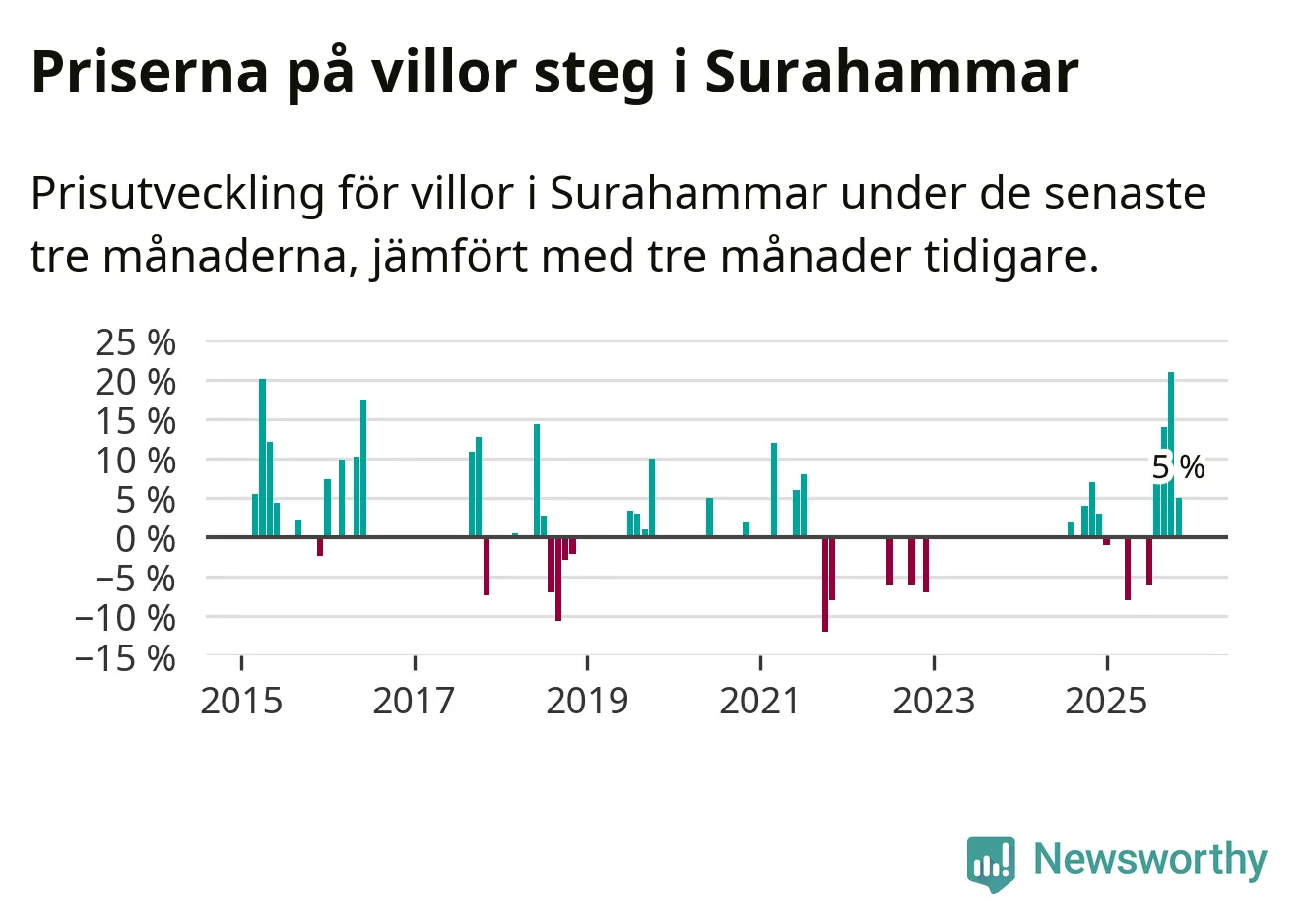 Statistiken visar även på en kännbar prisuppgång i Surahammars kommun. Medelpriset på försäljningarna av villor i kommunen var 5 procent högre än för tre månader sedan. I hela Västmanland däremot sjunker villapriserna. I hela länet noterades en prisnedgång på 2 procent.