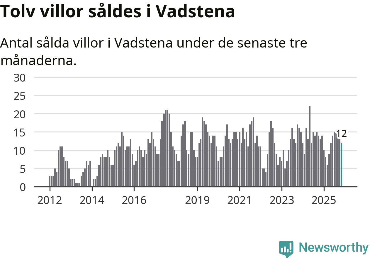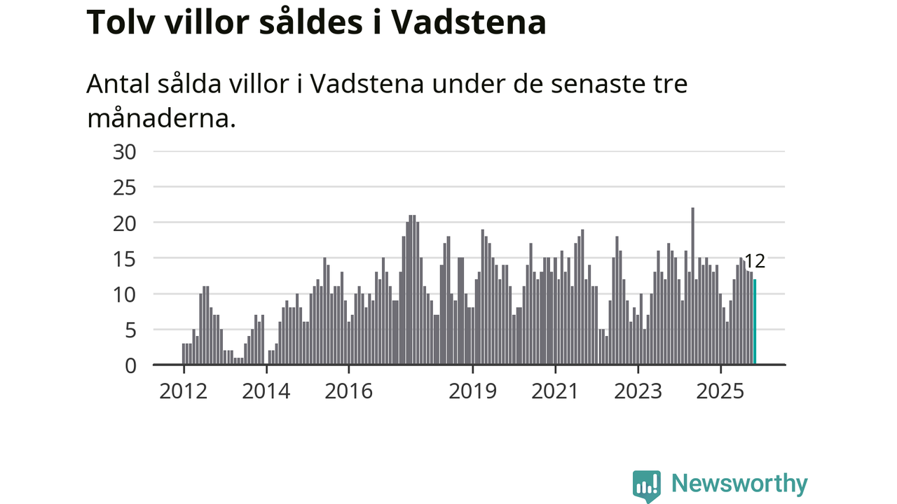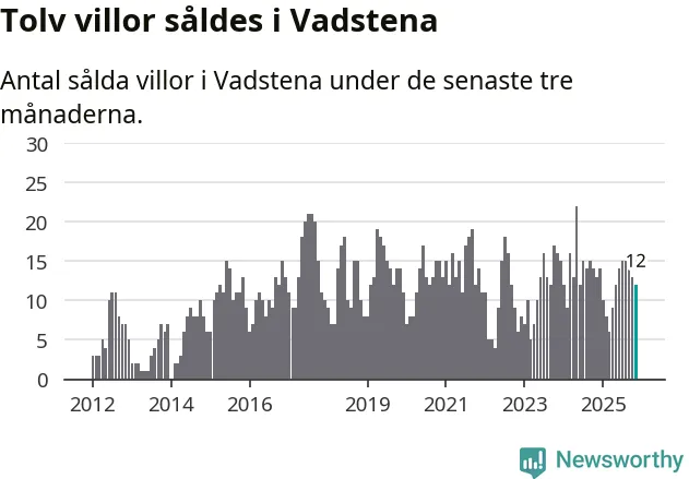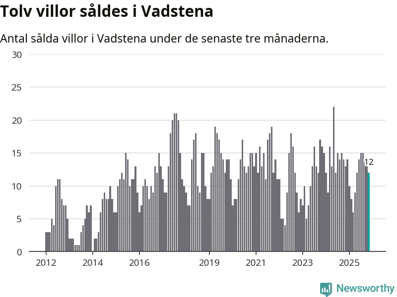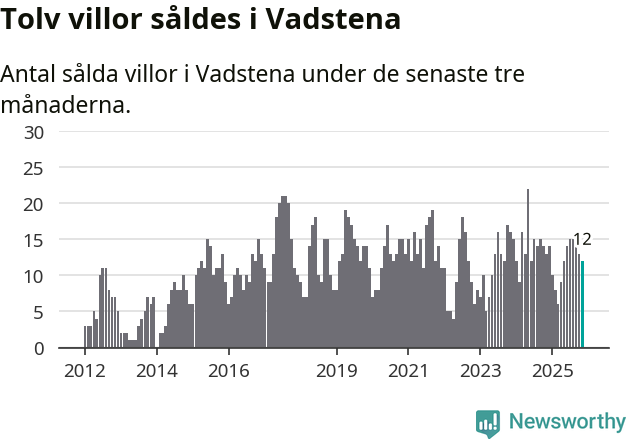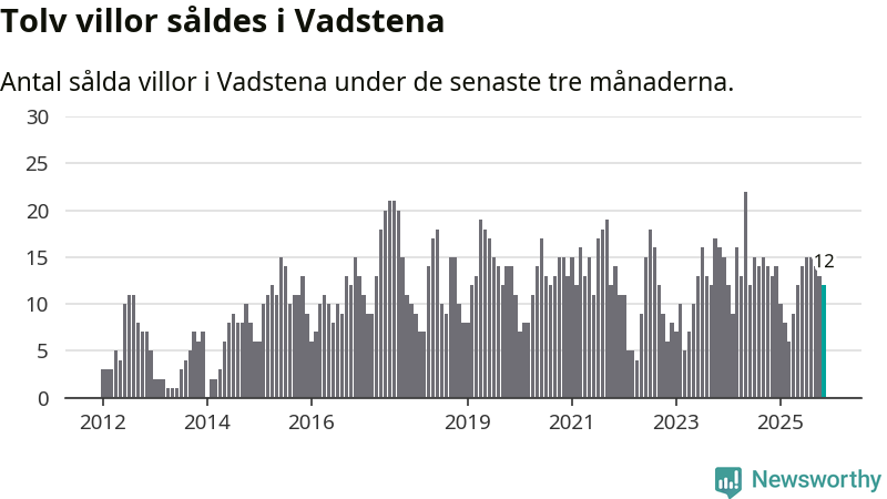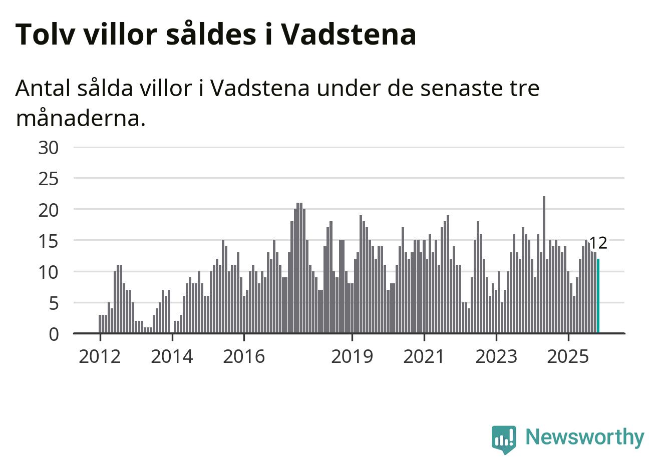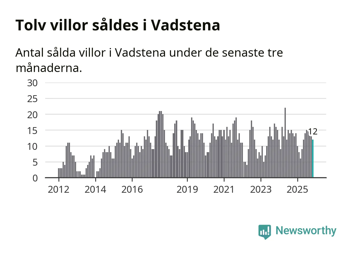 Mellan september och november gjordes sammanlagt tolv affärer med villor i Vadstena kommun. Det kan jämföras med 13 vid motsvarande tid i fjol.