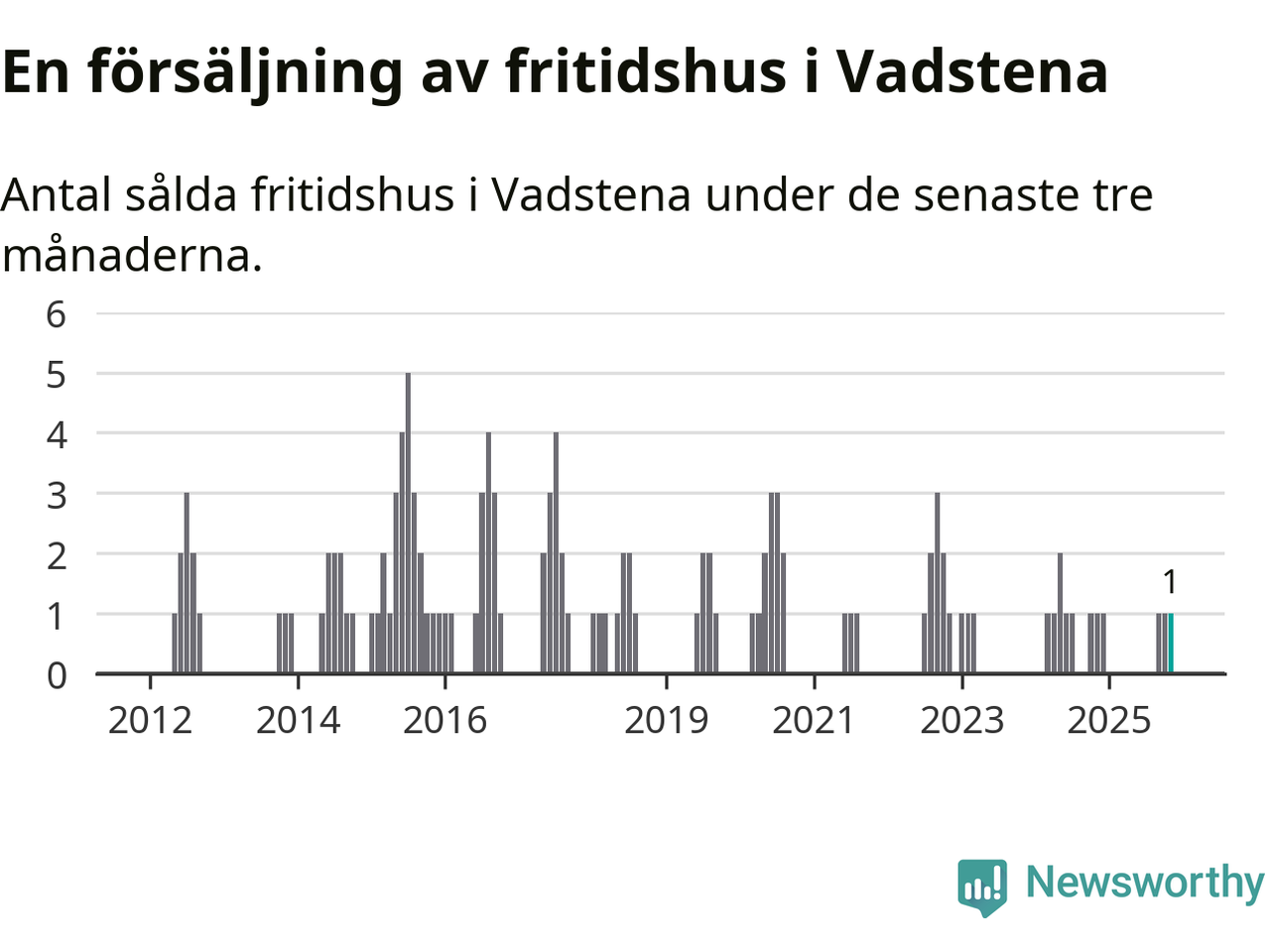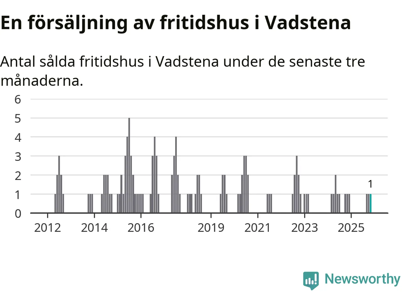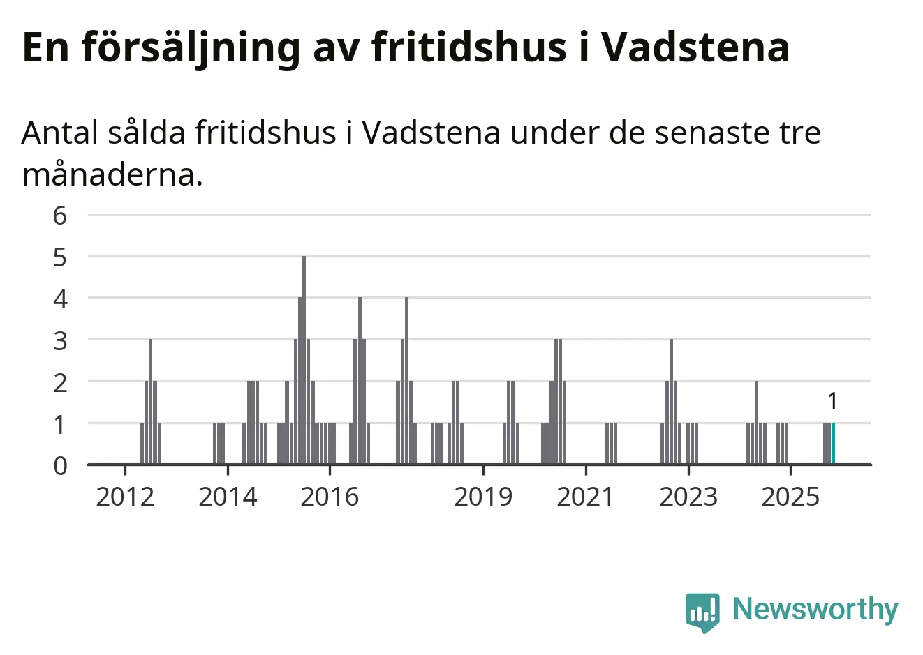 Mellan september och november gjordes sammanlagt en affär med fritidshus i Vadstena kommun. Det är lika många affärer som vid motsvarande tid i fjol.