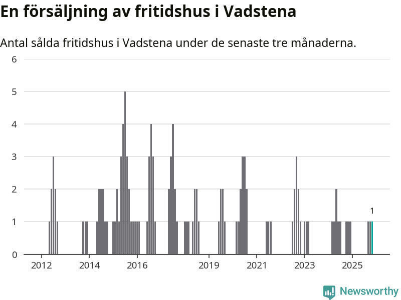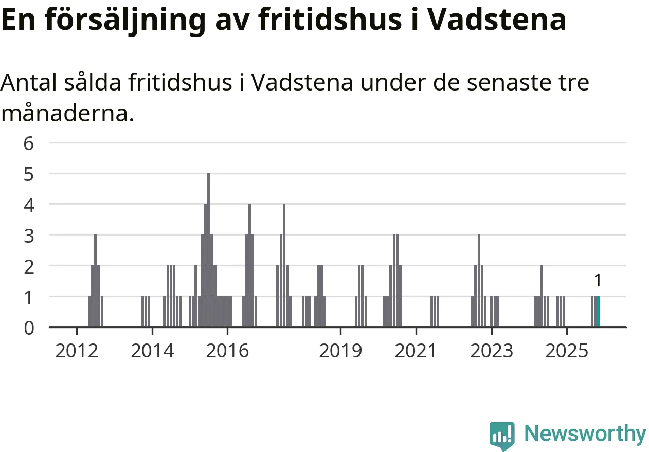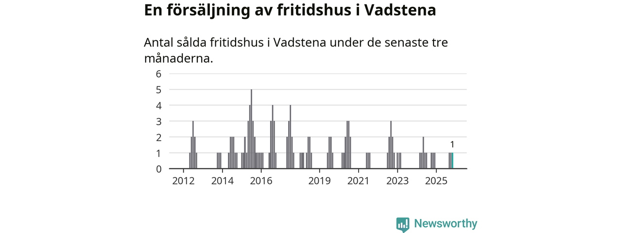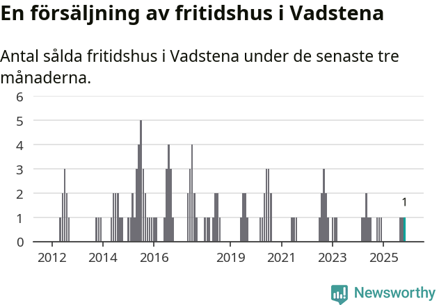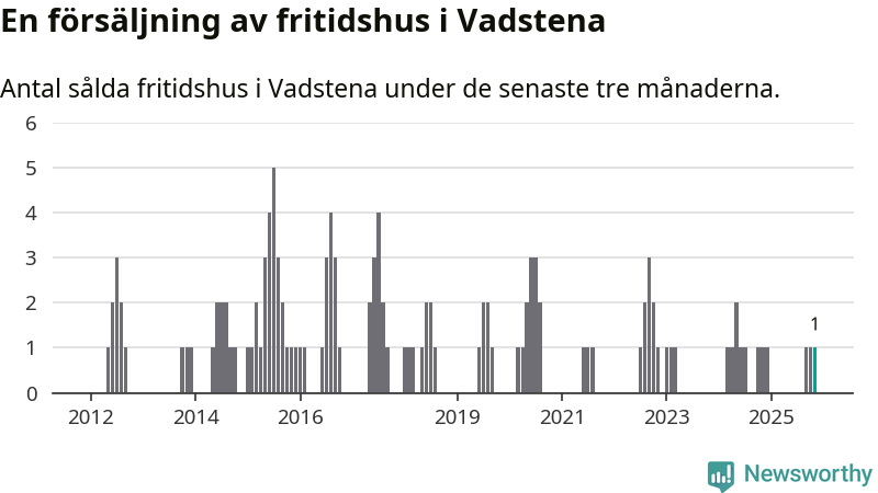 Mellan september och november gjordes sammanlagt en affär med fritidshus i Vadstena kommun. Det är lika många affärer som vid motsvarande tid i fjol.