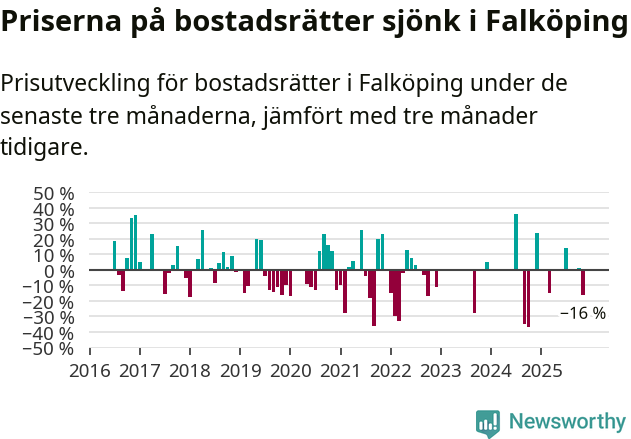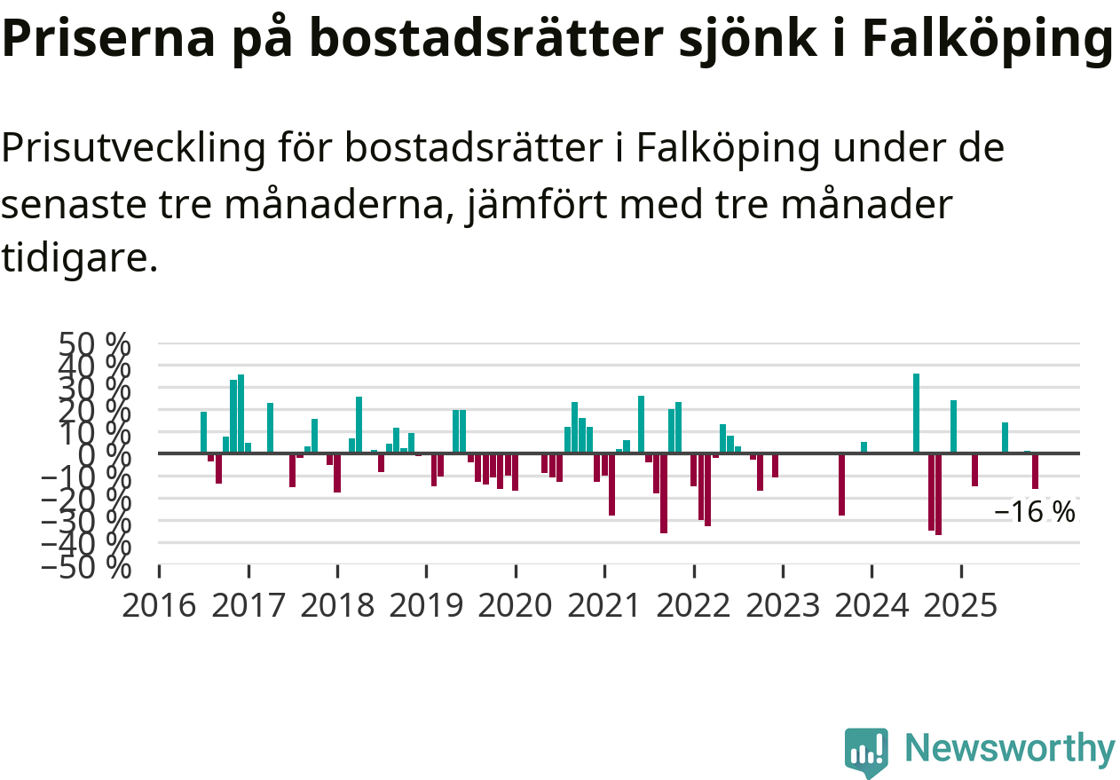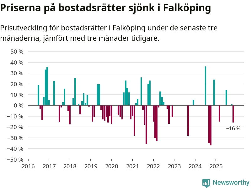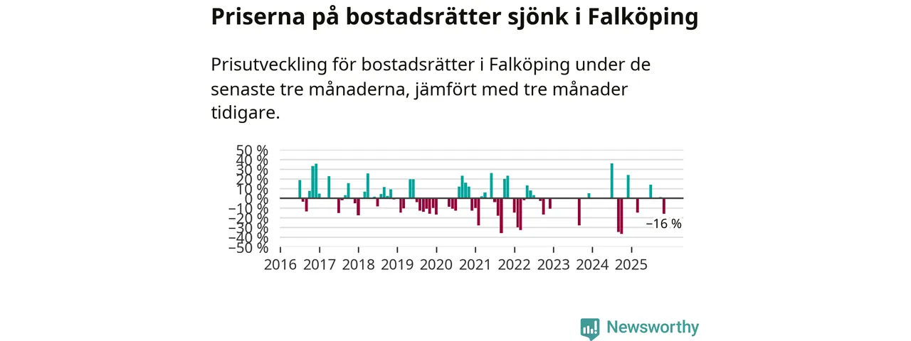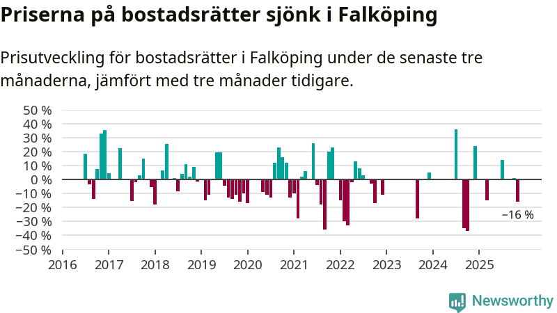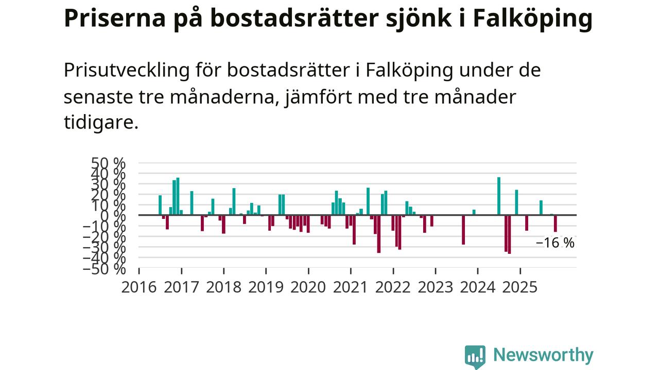 Statistiken visar även på en stor prisnedgång i Falköpings kommun. Medelpriset på försäljningarna av bostadsrätter i kommunen var 16 procent lägre än för tre månader sedan. I hela Västra Götaland däremot ökar priserna på bostadsrätter. I hela länet noterades en prisuppgång på 1 procent.