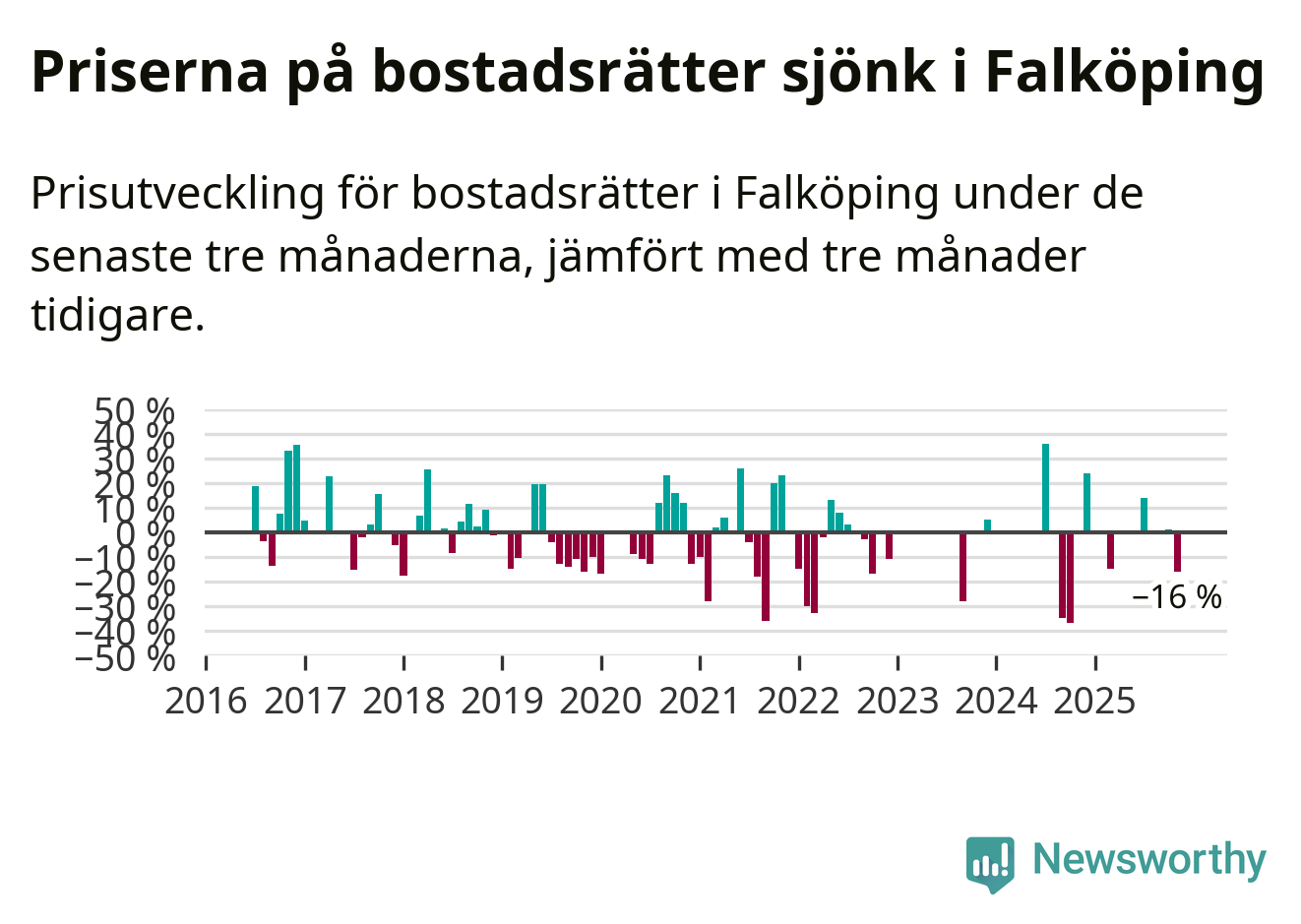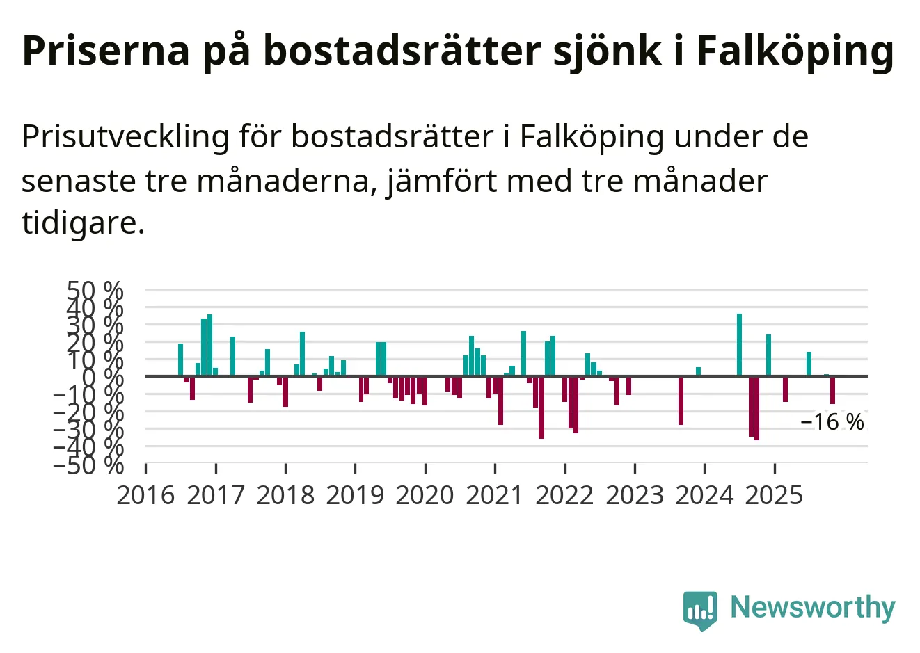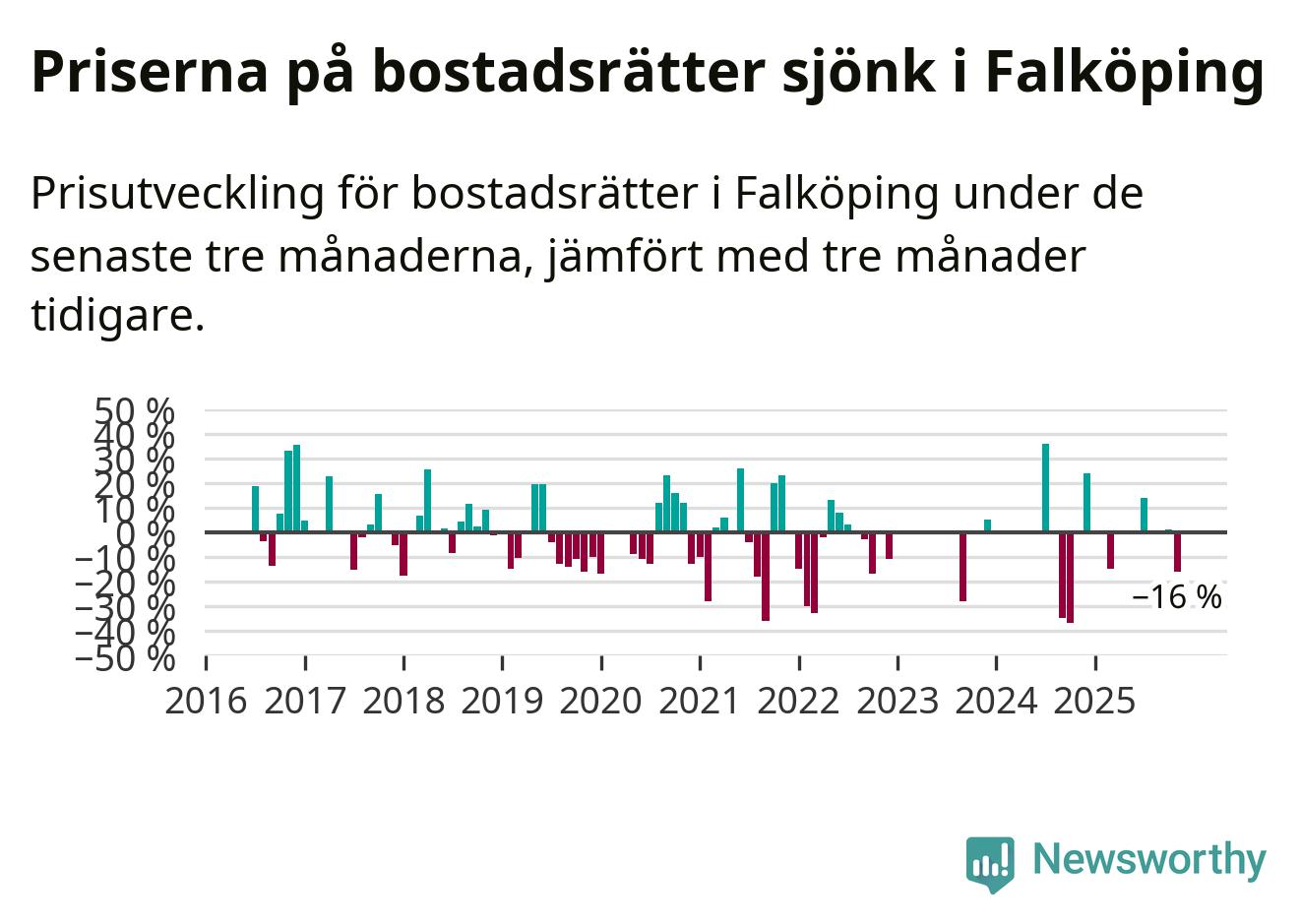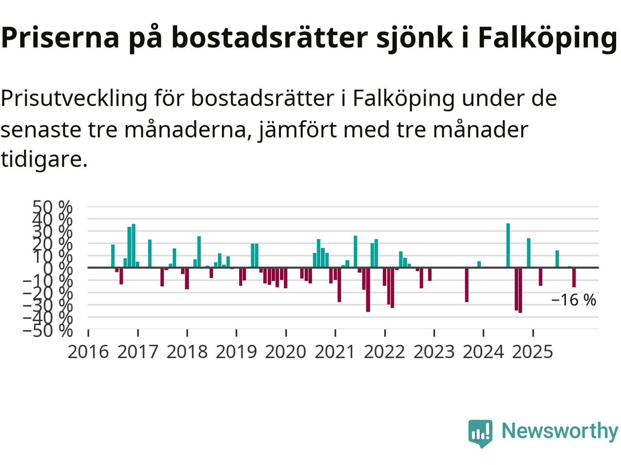 Statistiken visar även på en stor prisnedgång i Falköpings kommun. Medelpriset på försäljningarna av bostadsrätter i kommunen var 16 procent lägre än för tre månader sedan. I hela Västra Götaland däremot ökar priserna på bostadsrätter. I hela länet noterades en prisuppgång på 1 procent.