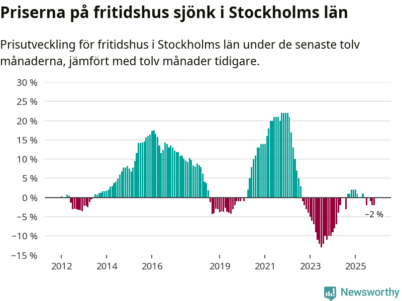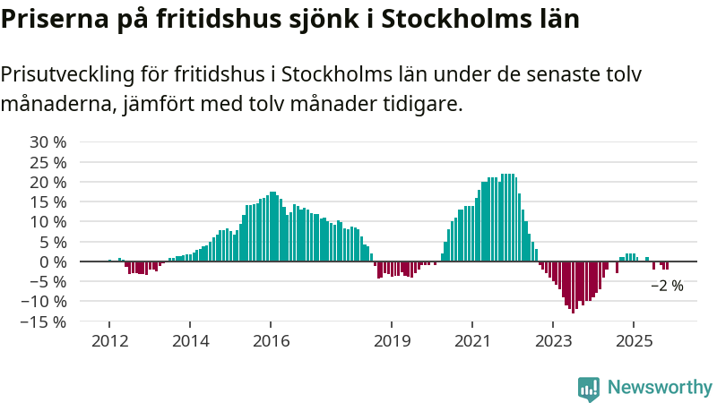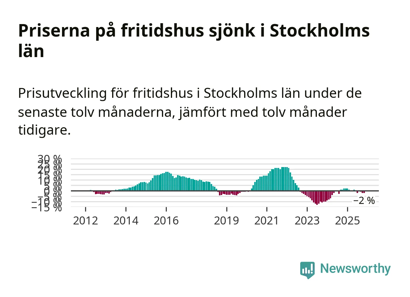 Priserna på fritidshus har gått ner i Stockholms län. Medelpriset på försäljningarna under de senaste tolv månaderna visar på en nedgång med 2 procent.