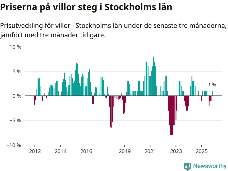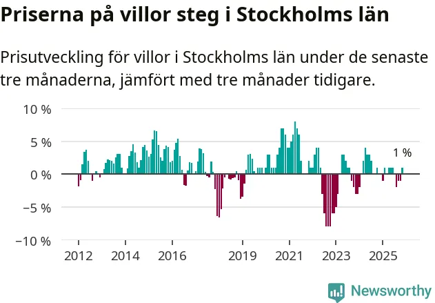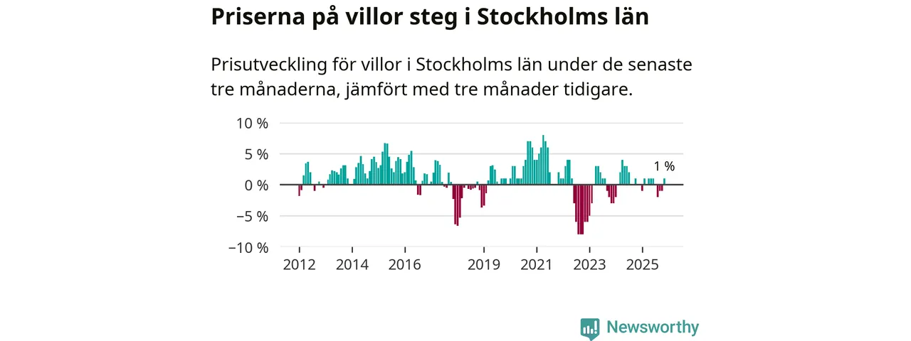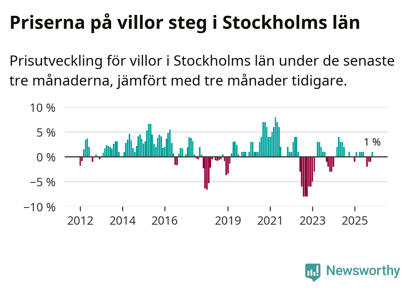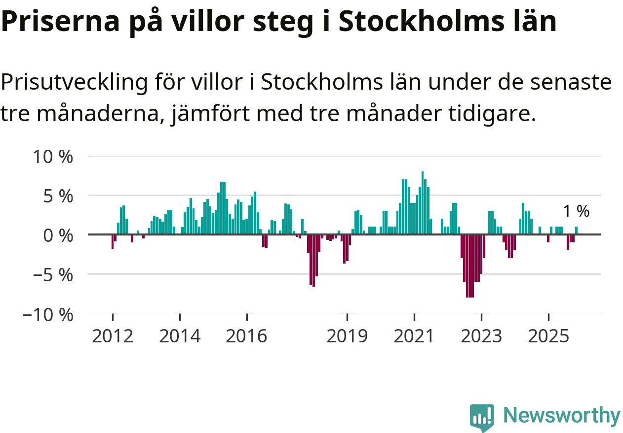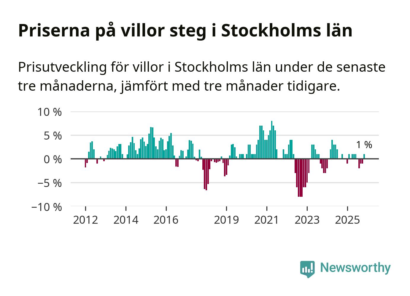 Statistiken visar även på en prisuppgång i Stockholms län. Medelpriset på försäljningarna av villor i länet var 1 procent högre än för tre månader sedan. I hela Sverige däremot sjunker villapriserna. I hela riket noterades en prisnedgång på 2 procent.