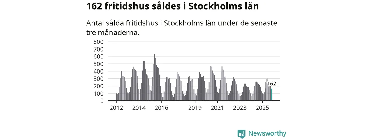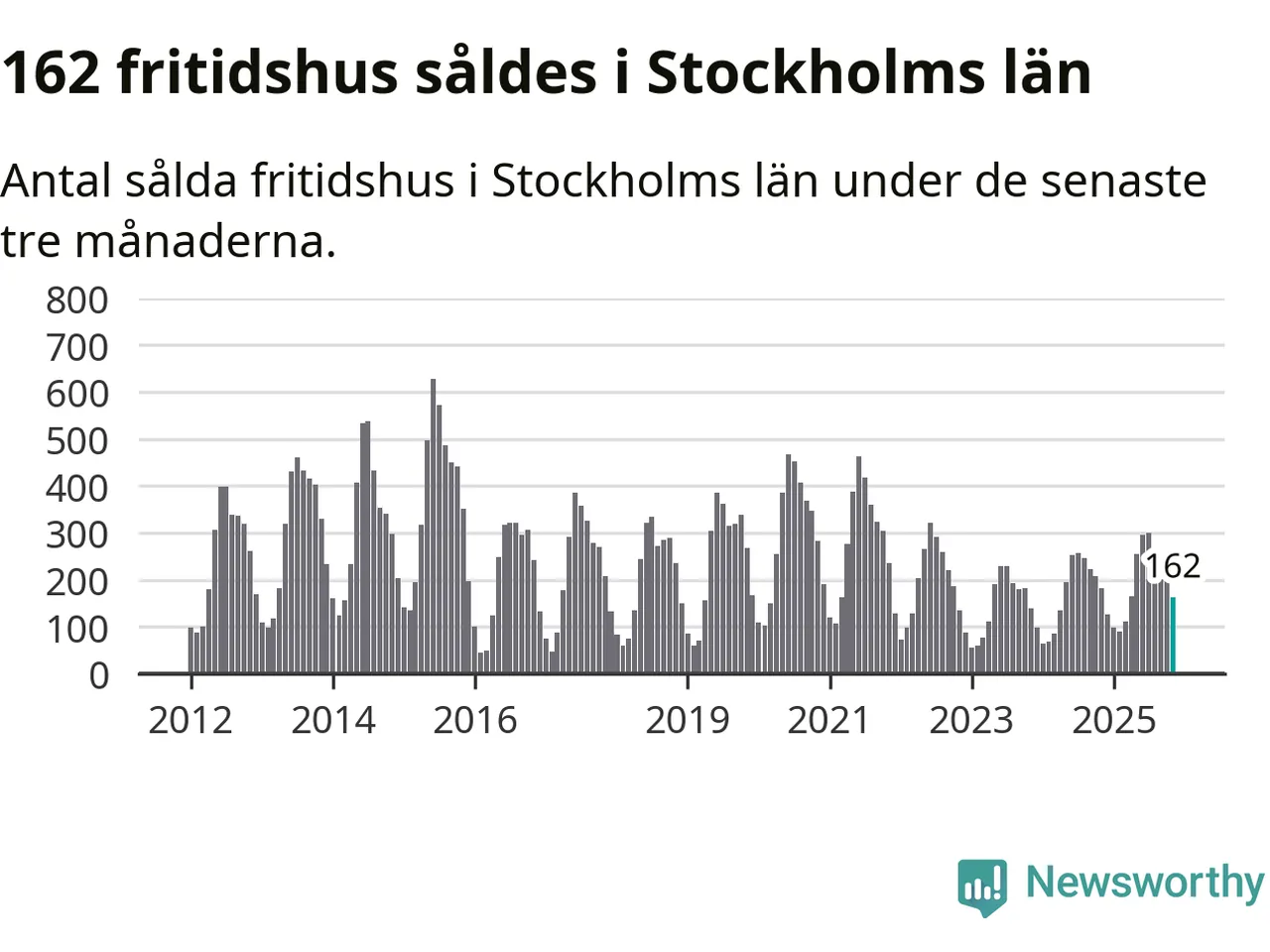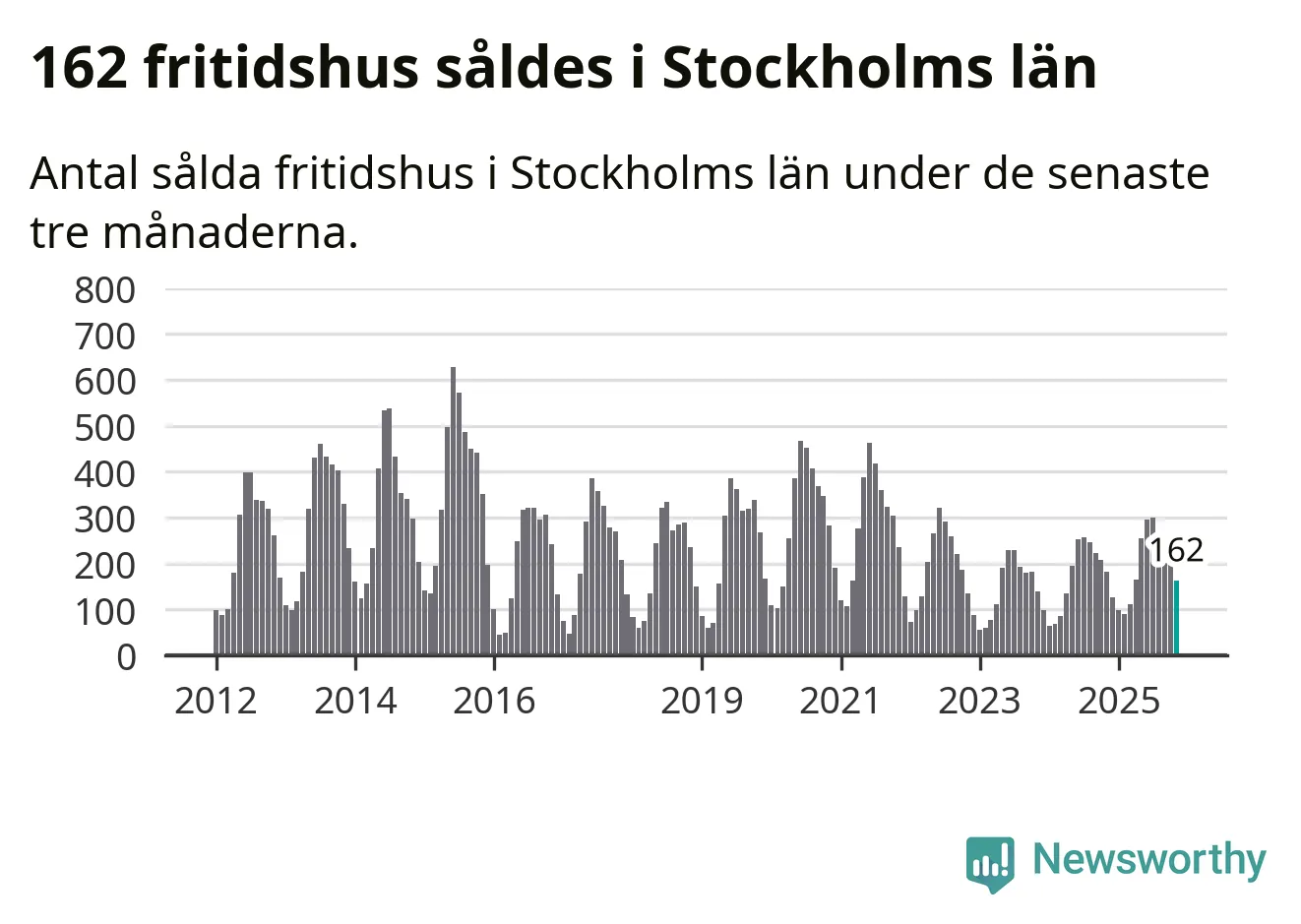 Sammanlagt såldes 162 fritidshus i Stockholms län mellan september och november till ett genomsnittligt pris på 3,5 miljoner kronor. I fjol gjordes 183 affärer vid den här tiden på året.