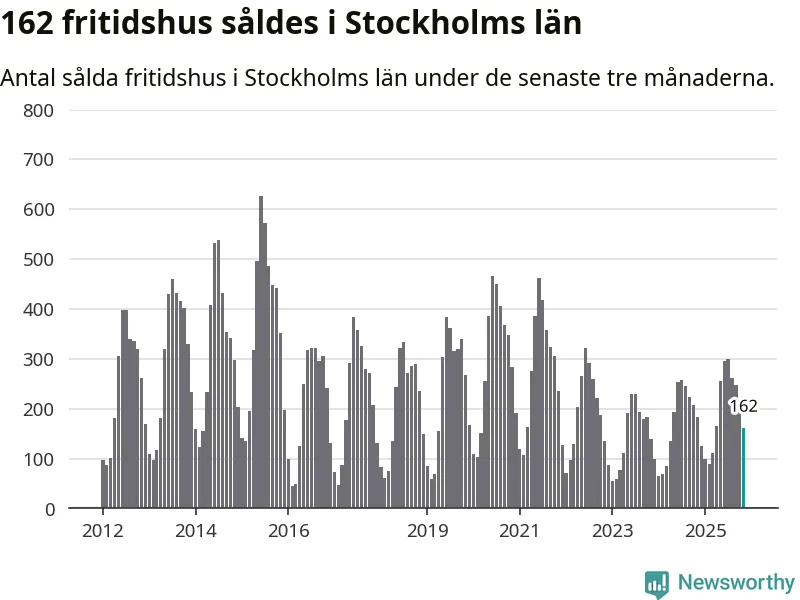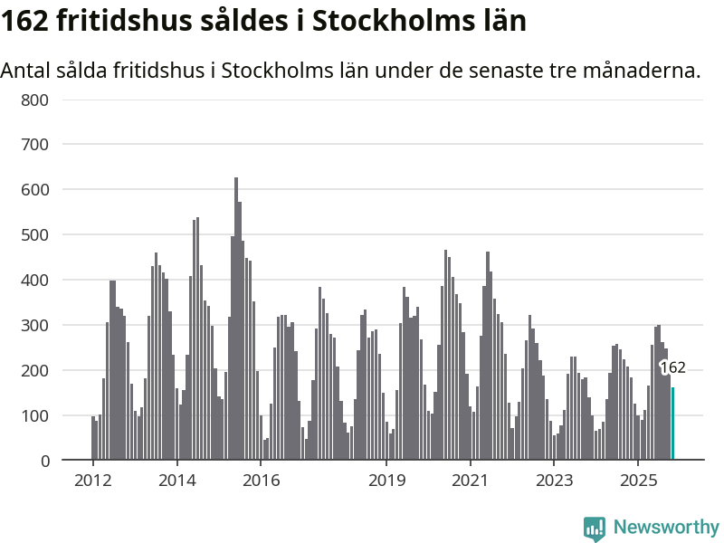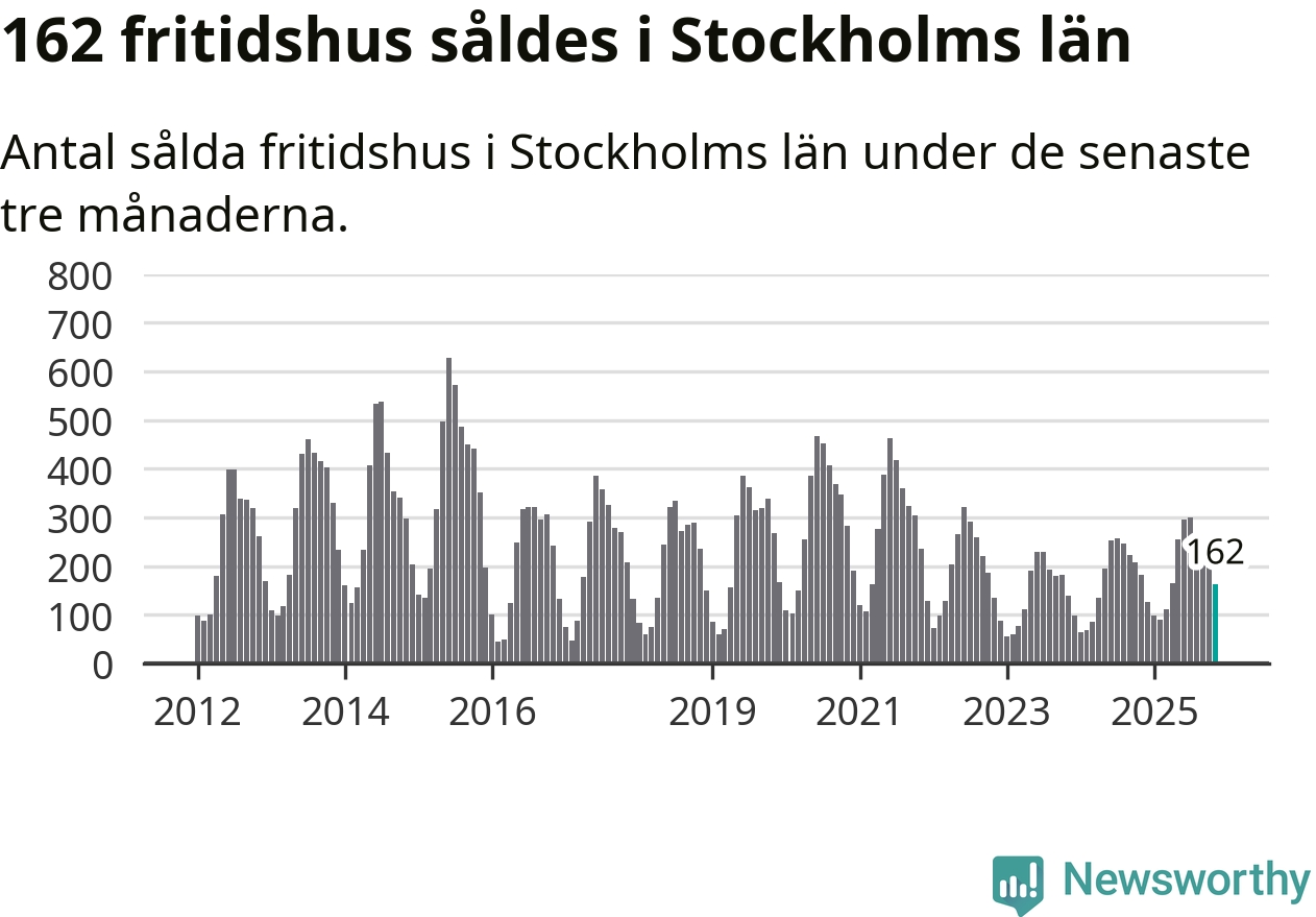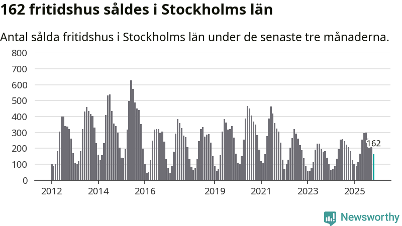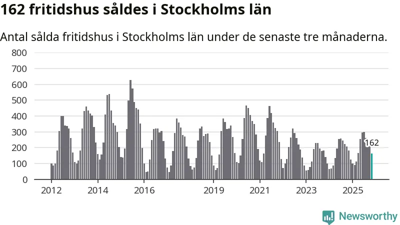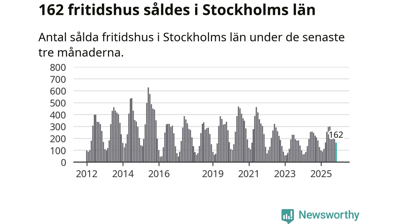 Sammanlagt såldes 162 fritidshus i Stockholms län mellan september och november till ett genomsnittligt pris på 3,5 miljoner kronor. I fjol gjordes 183 affärer vid den här tiden på året.