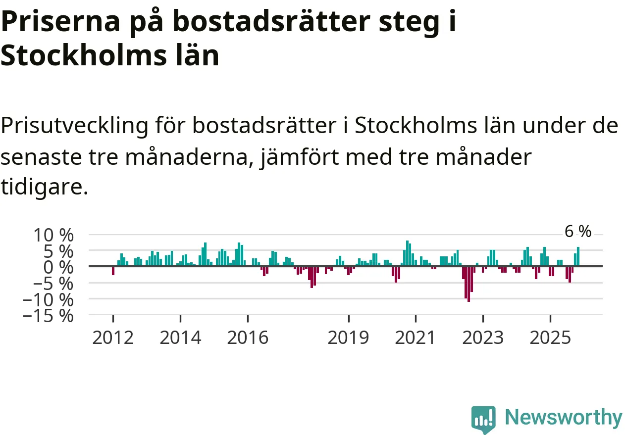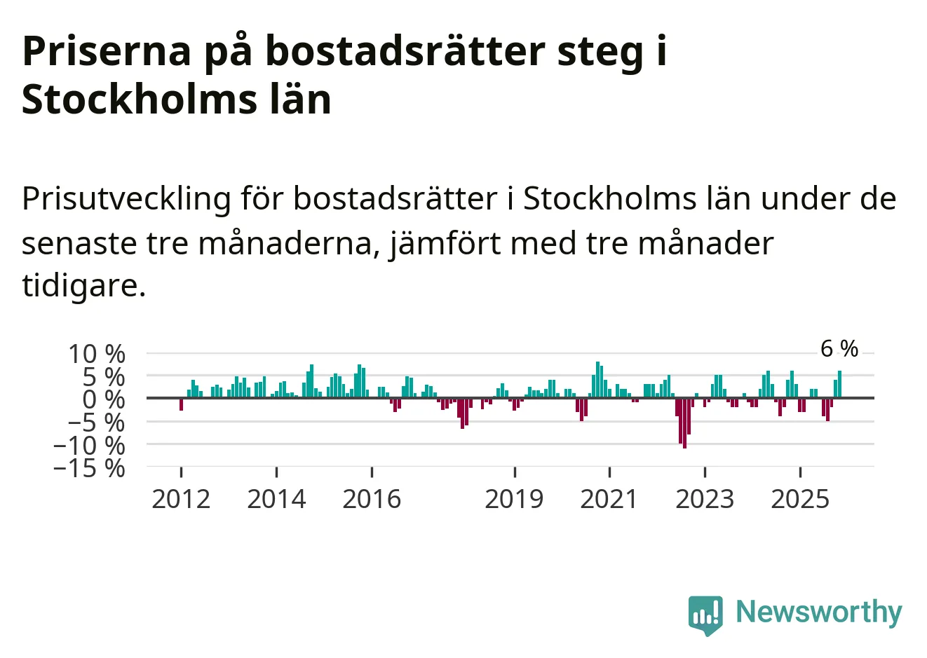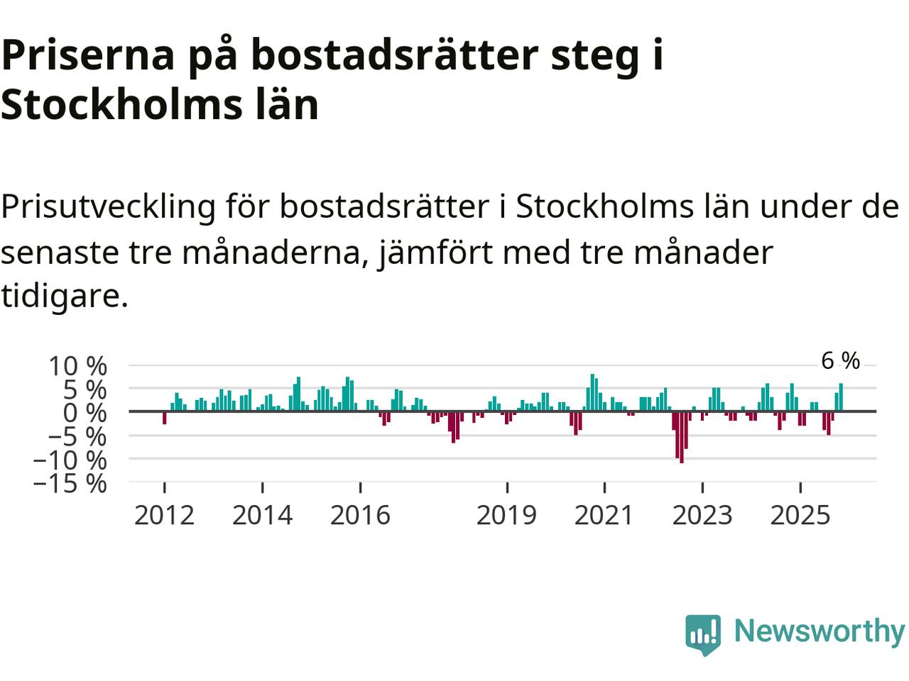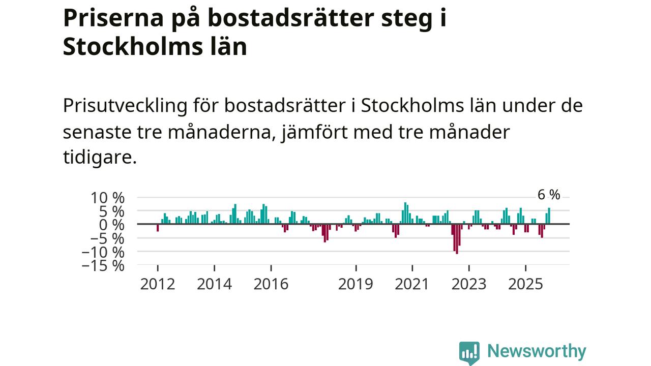 Priserna på bostadsrätter steg mellan september och november med 6 procent i Stockholms län. Det är en betydande uppgång jämfört med det gångna året då priserna i snitt stått stilla.