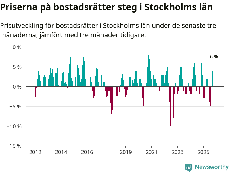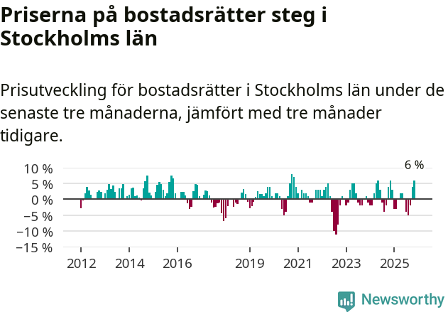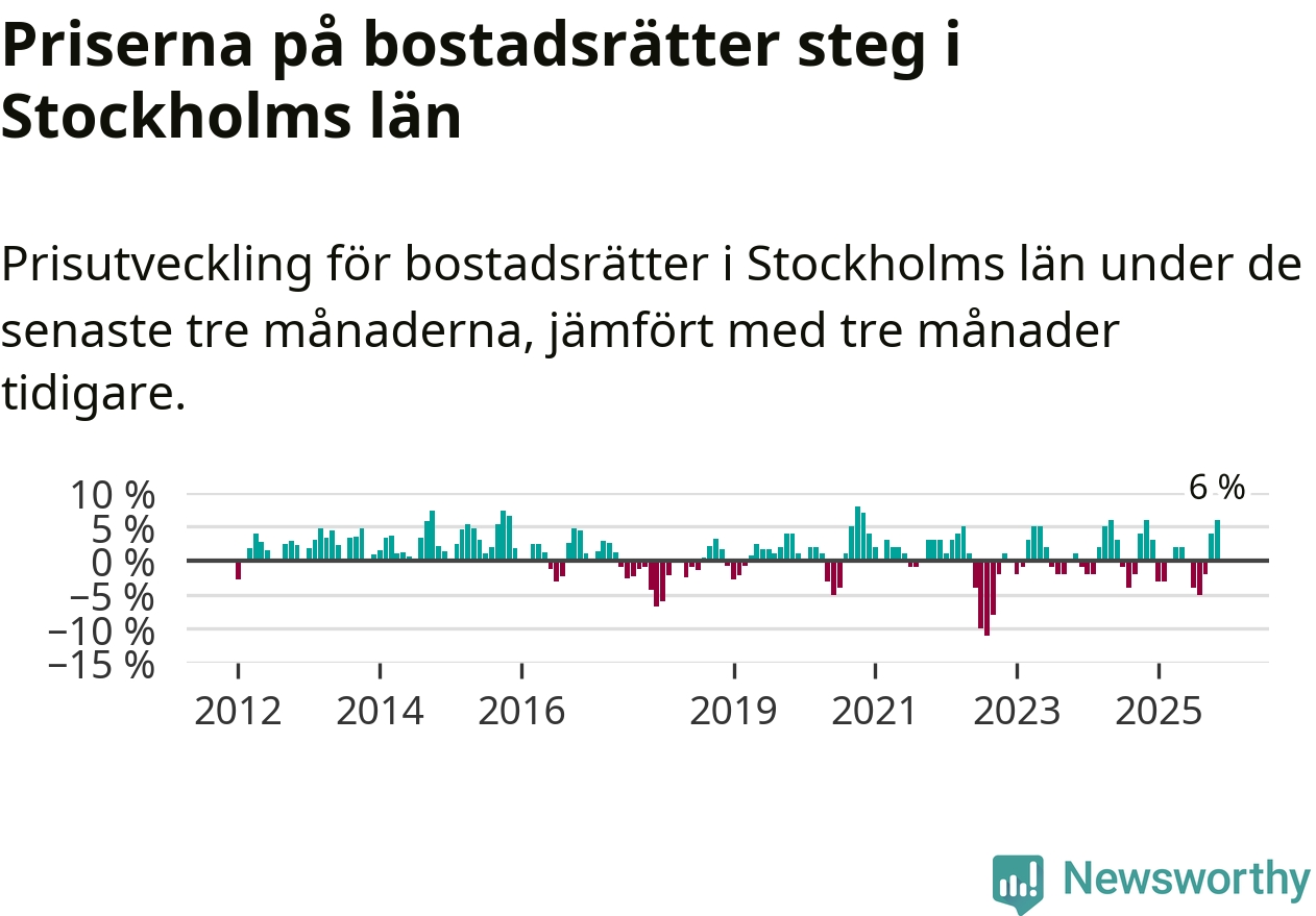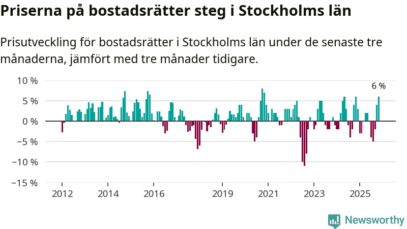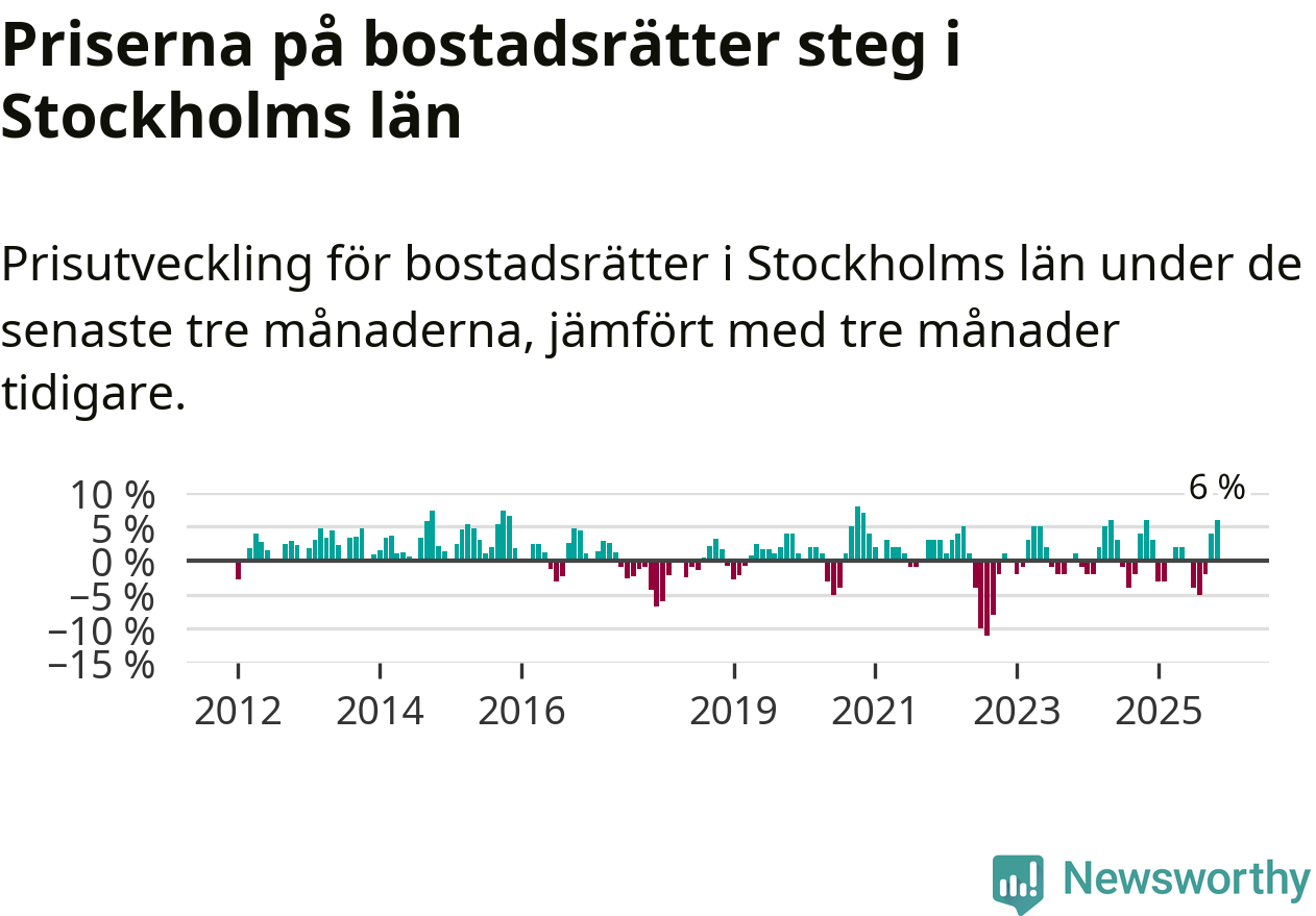 Priserna på bostadsrätter steg mellan september och november med 6 procent i Stockholms län. Det är en betydande uppgång jämfört med det gångna året då priserna i snitt stått stilla.