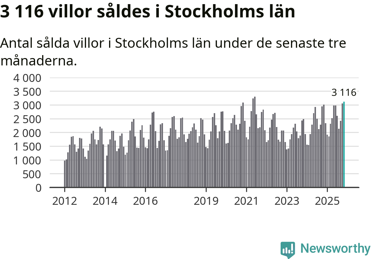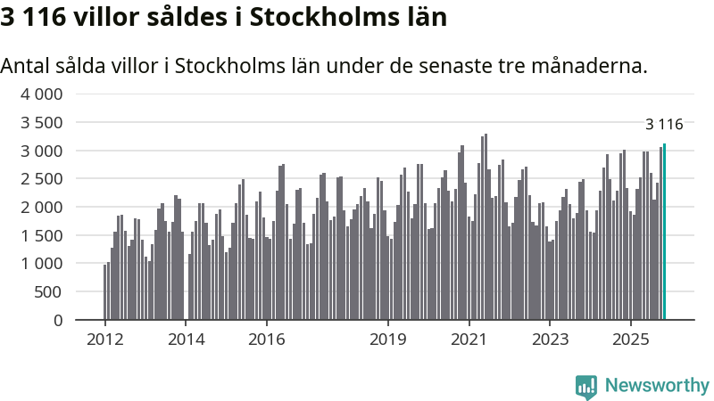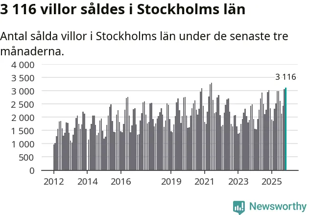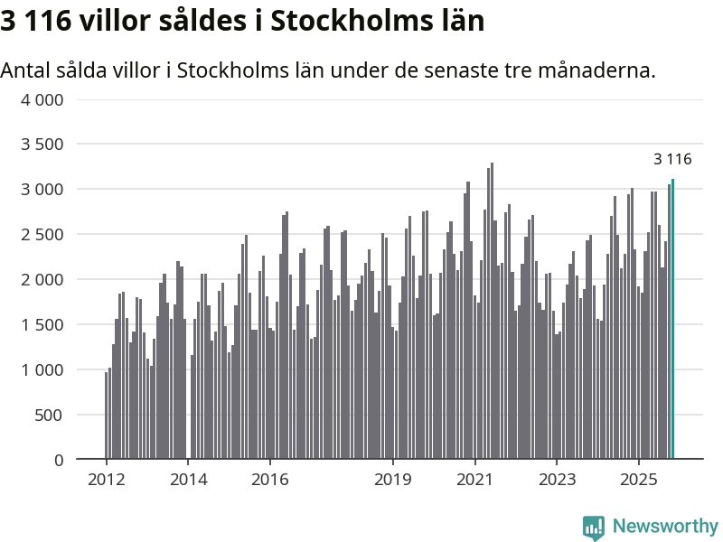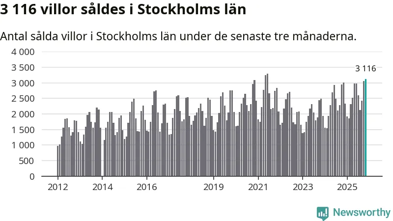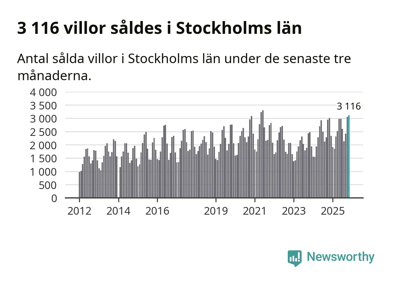 Mellan september och november såldes 3 116 villor i Stockholms län. Det är fler än någon tremånadersperiod sedan 2021.
