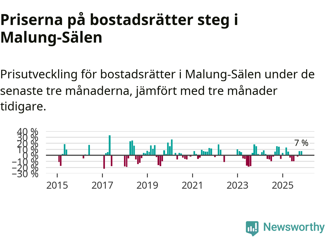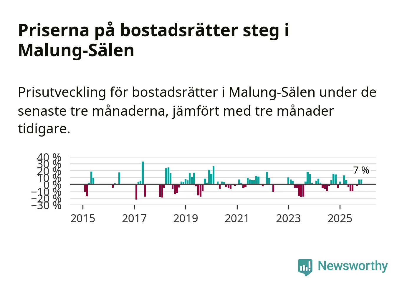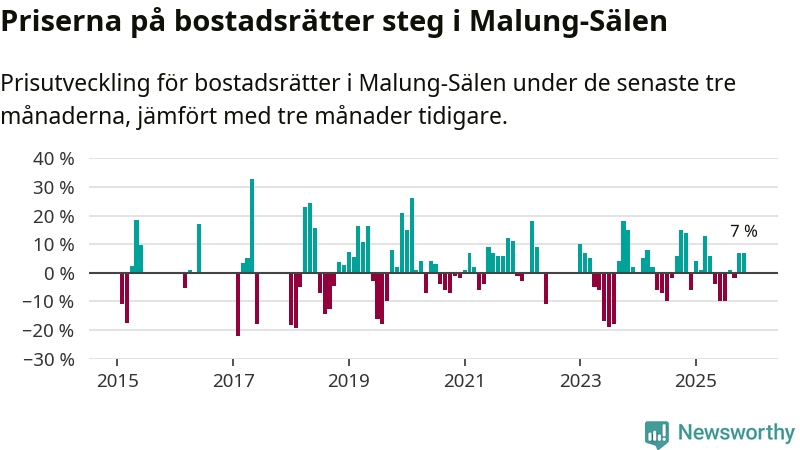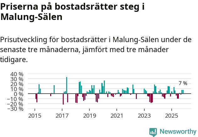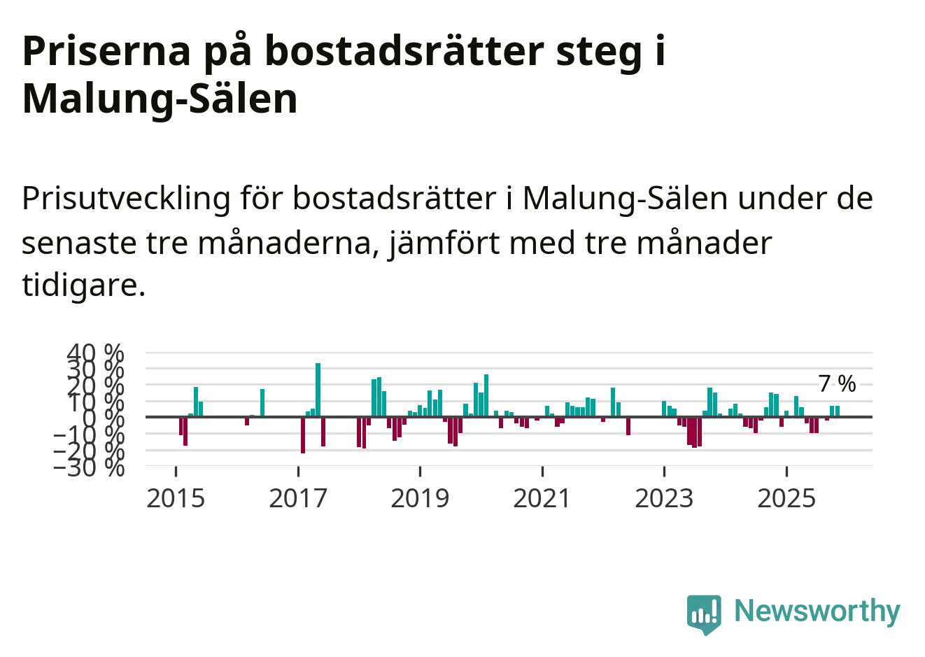Statistiken visar även på en kännbar prisuppgång i Malung-Sälens kommun. Medelpriset på försäljningarna av bostadsrätter i kommunen var 7 procent högre än för tre månader sedan. Även i hela Dalarna ökar priserna på bostadsrätter. I hela länet noterades en prisuppgång på 21 procent.