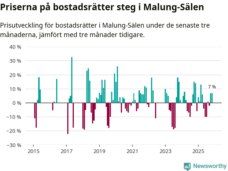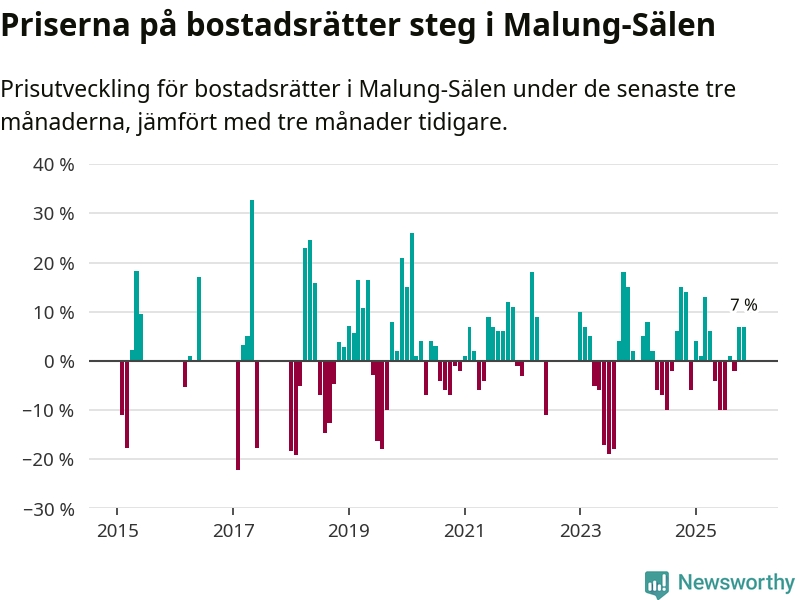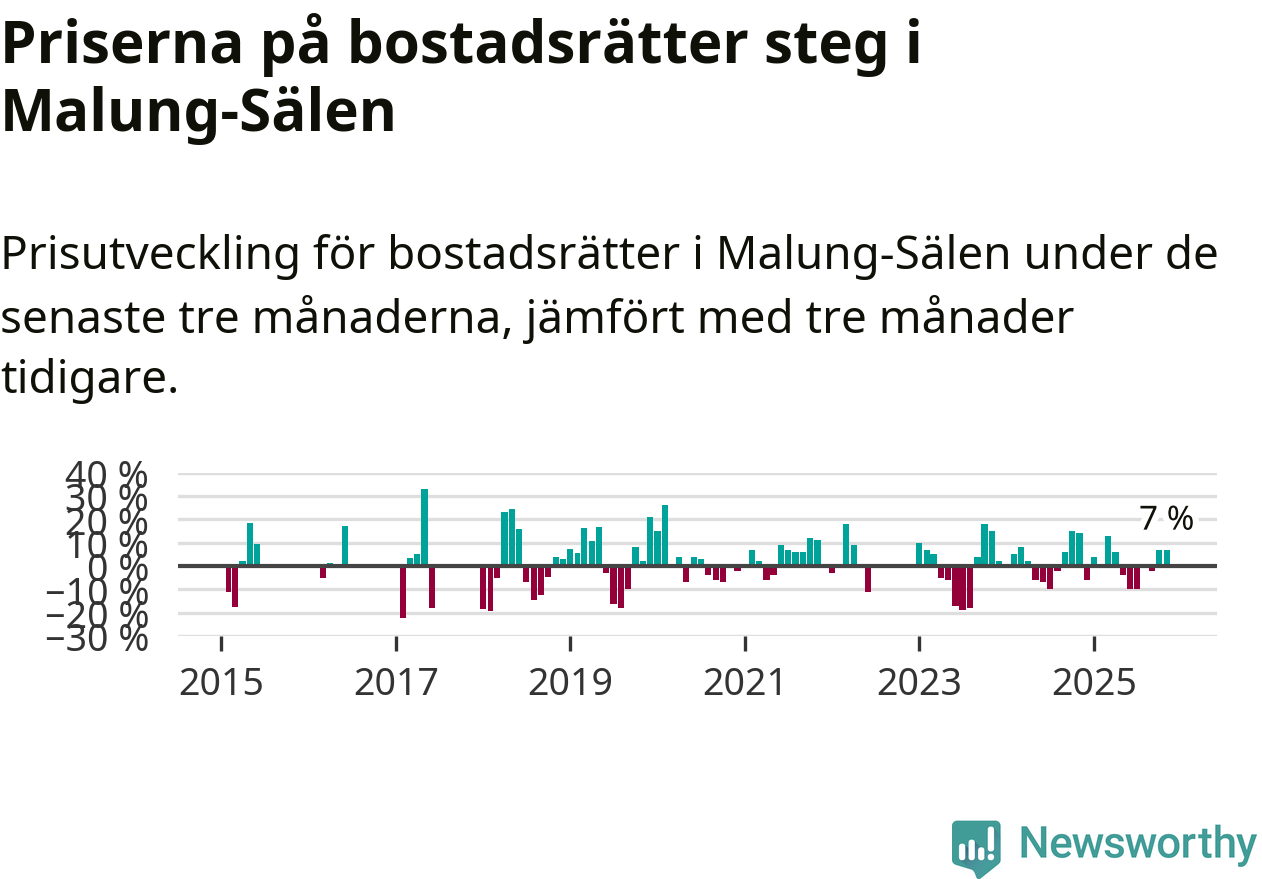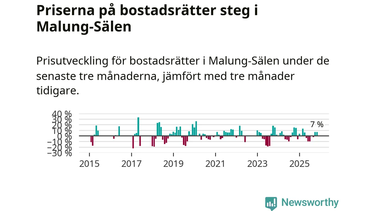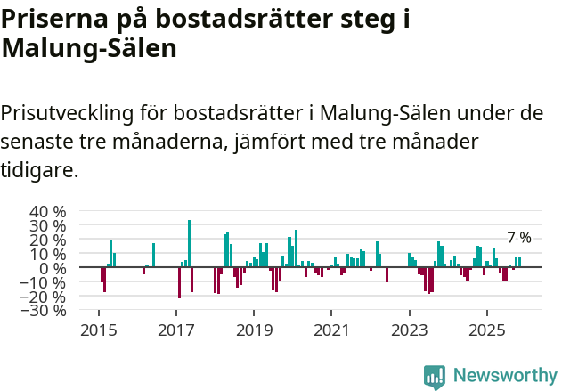 Statistiken visar även på en kännbar prisuppgång i Malung-Sälens kommun. Medelpriset på försäljningarna av bostadsrätter i kommunen var 7 procent högre än för tre månader sedan. Även i hela Dalarna ökar priserna på bostadsrätter. I hela länet noterades en prisuppgång på 21 procent.