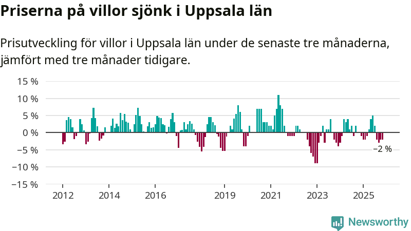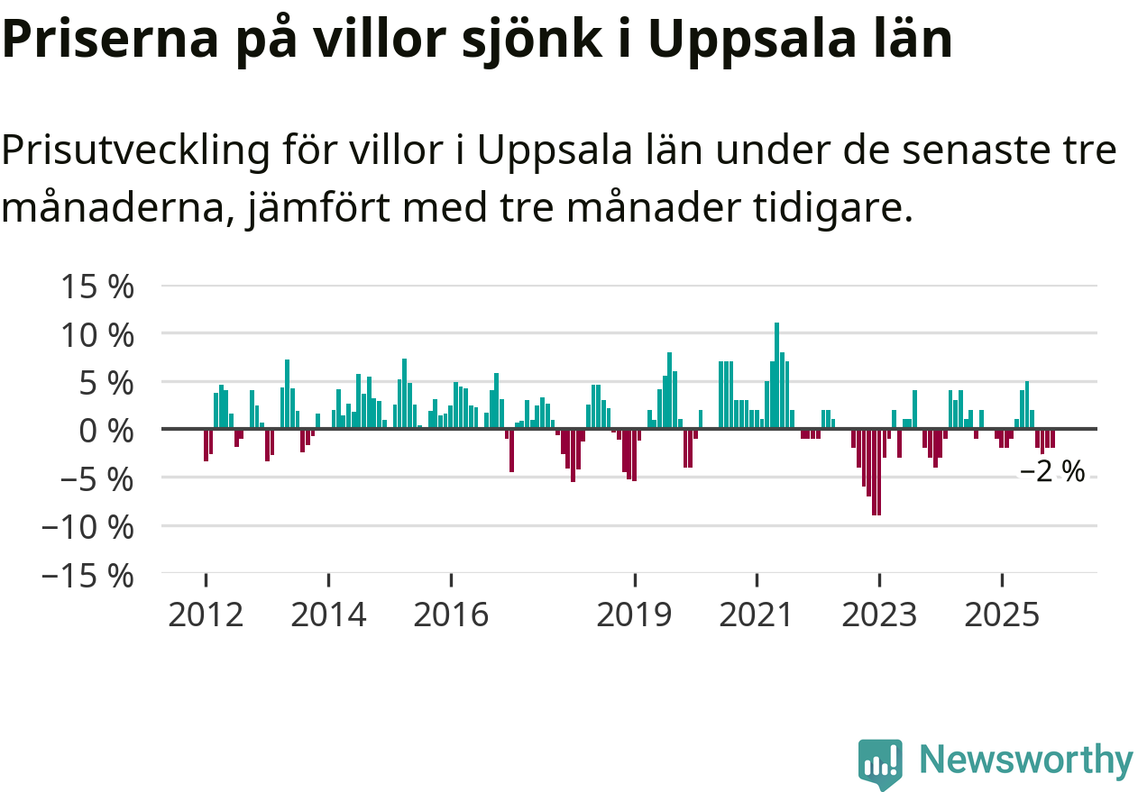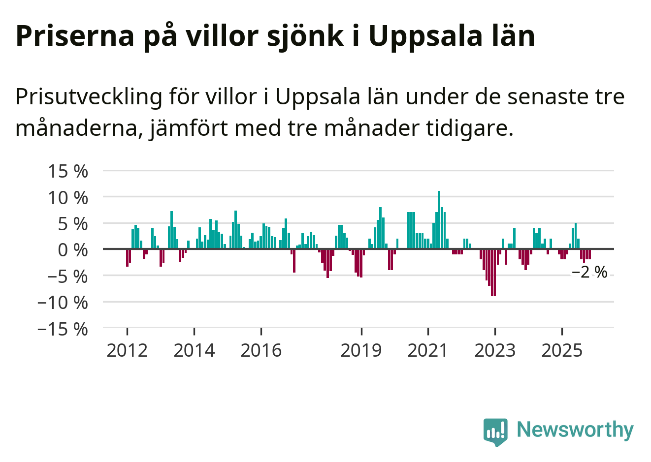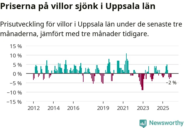 Villapriserna har gått ner i Uppsala län. Medelpriset på försäljningarna under de senaste tre månaderna visar på en nedgång med 2 procent.
