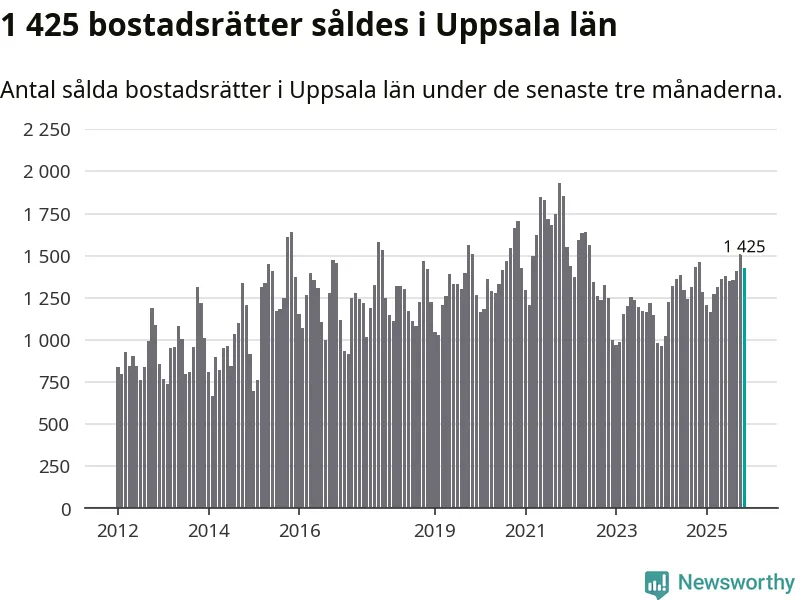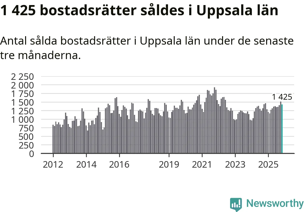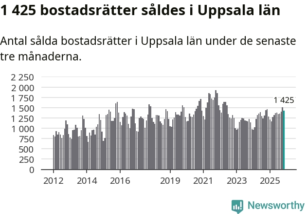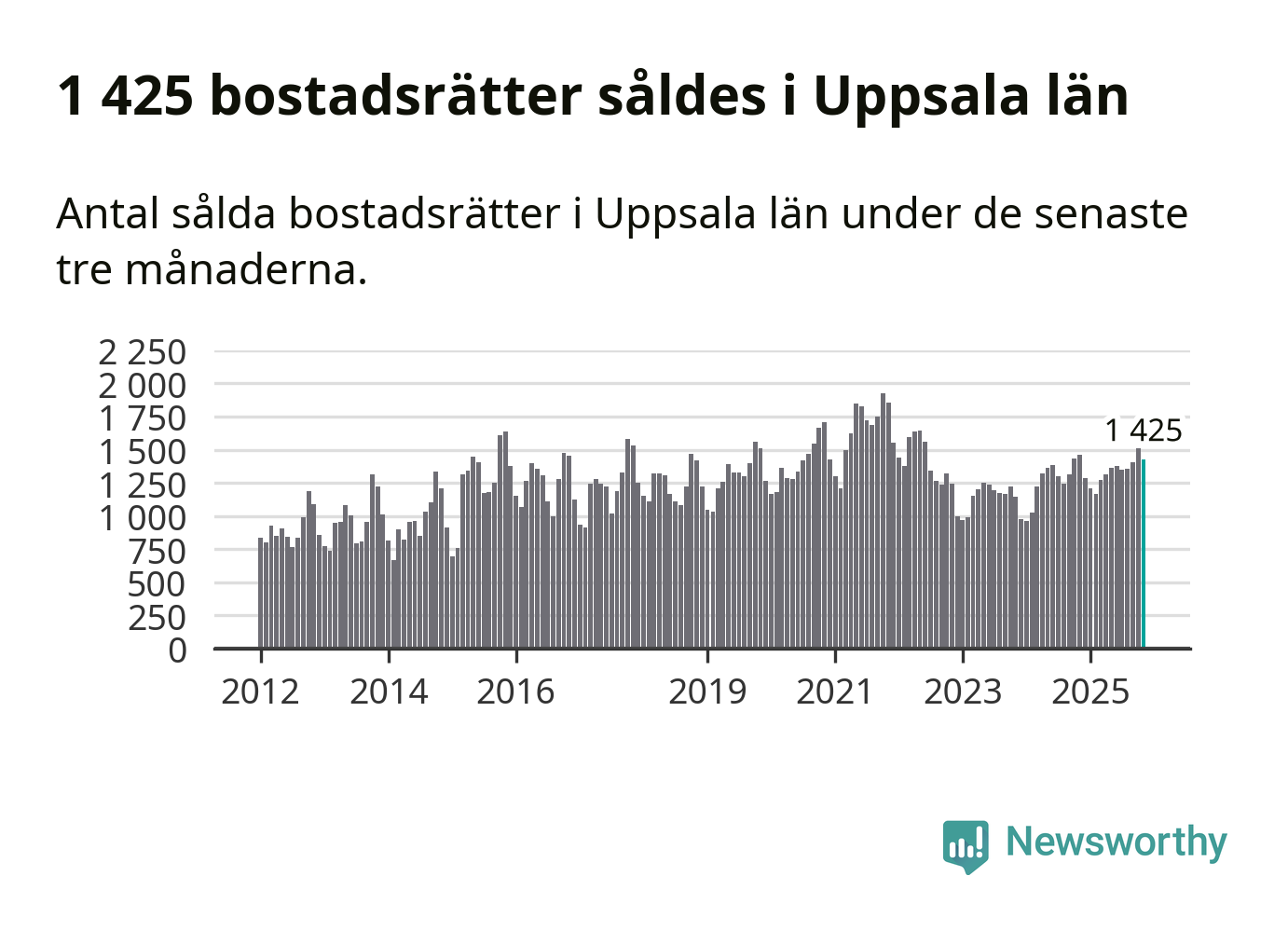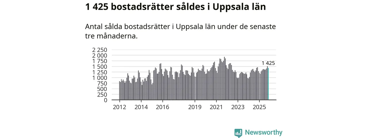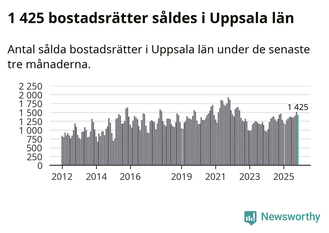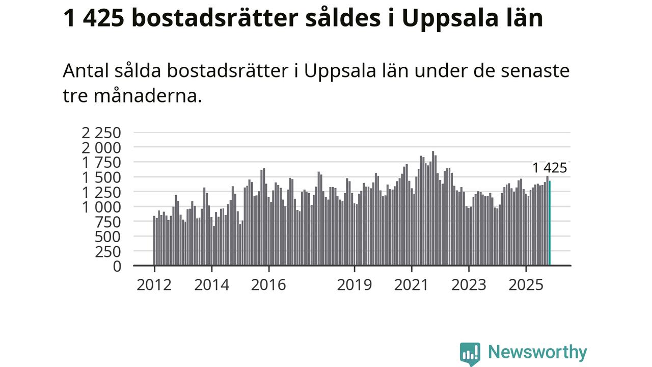 Sammanlagt såldes 1 425 bostadsrätter i Uppsala län mellan september och november till ett genomsnittligt pris på 2,5 miljoner kronor. I fjol gjordes 1 464 affärer vid den här tiden på året.