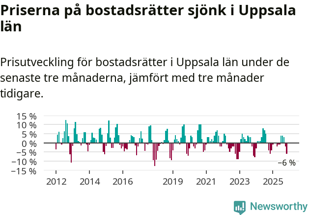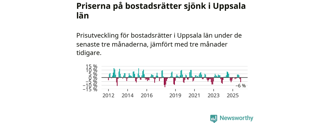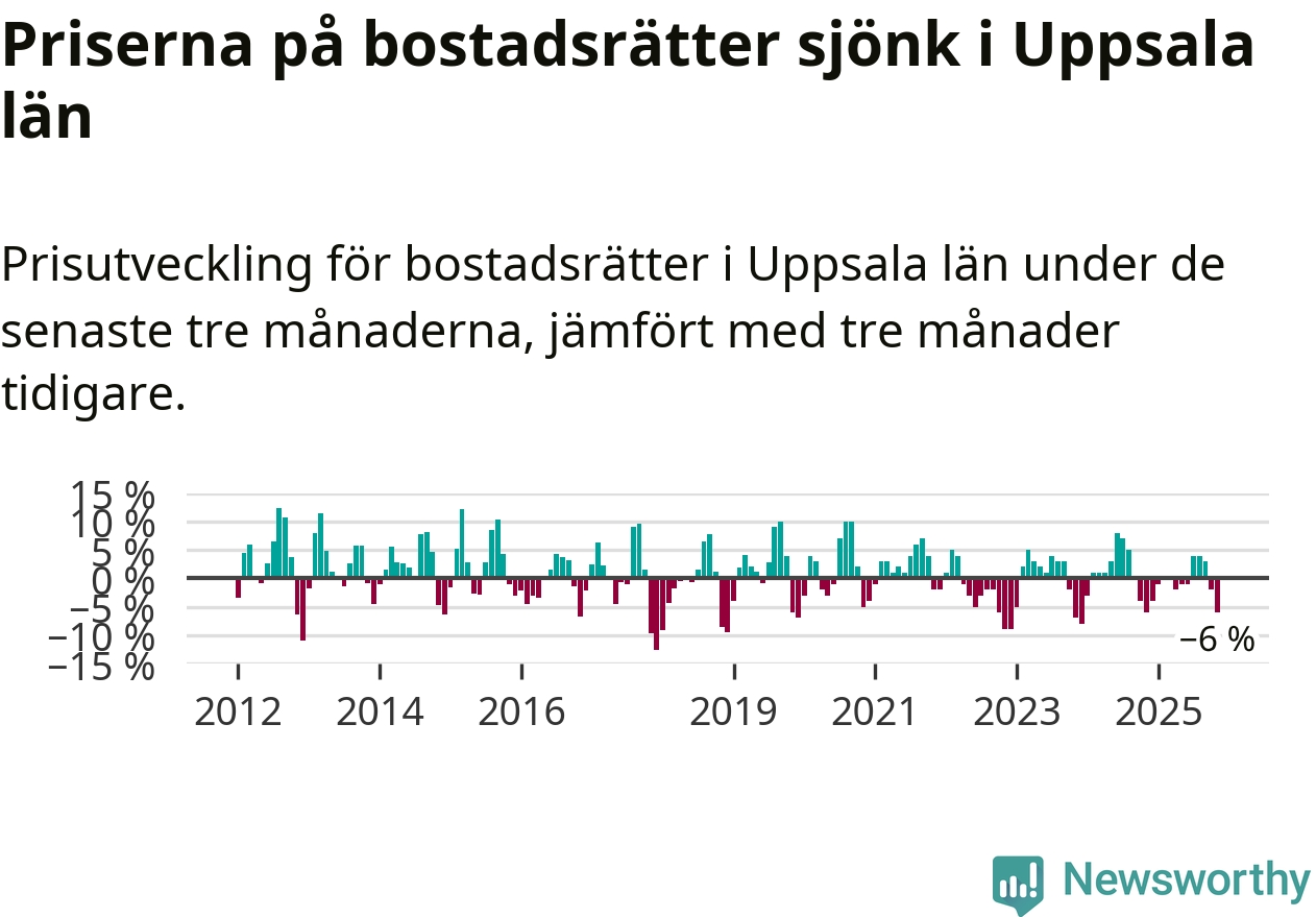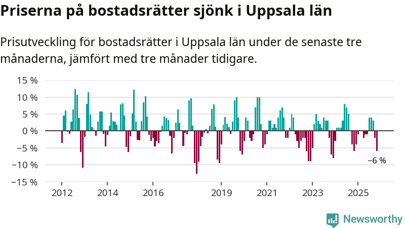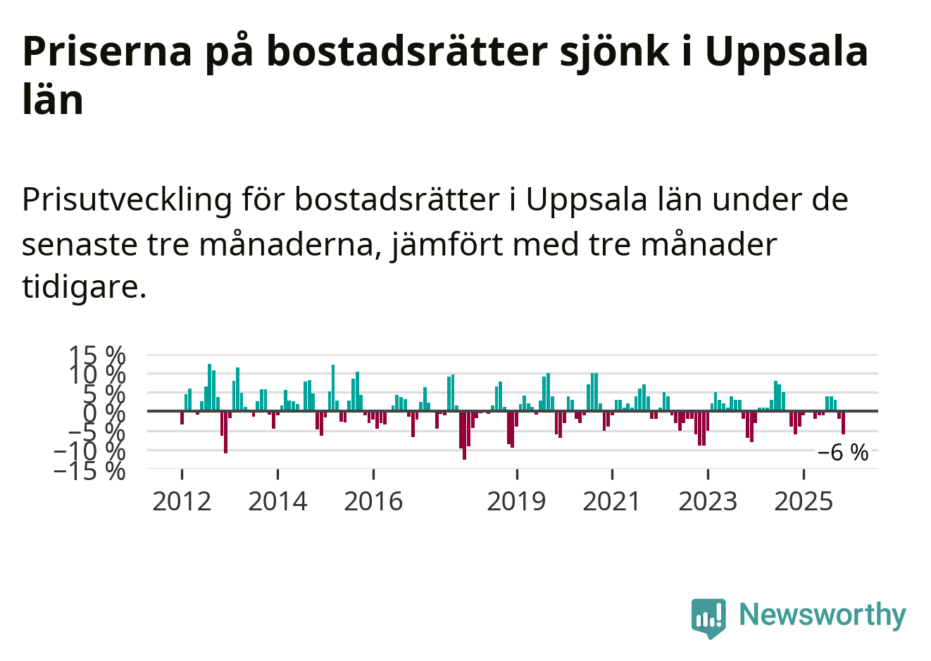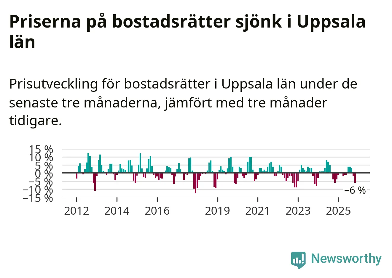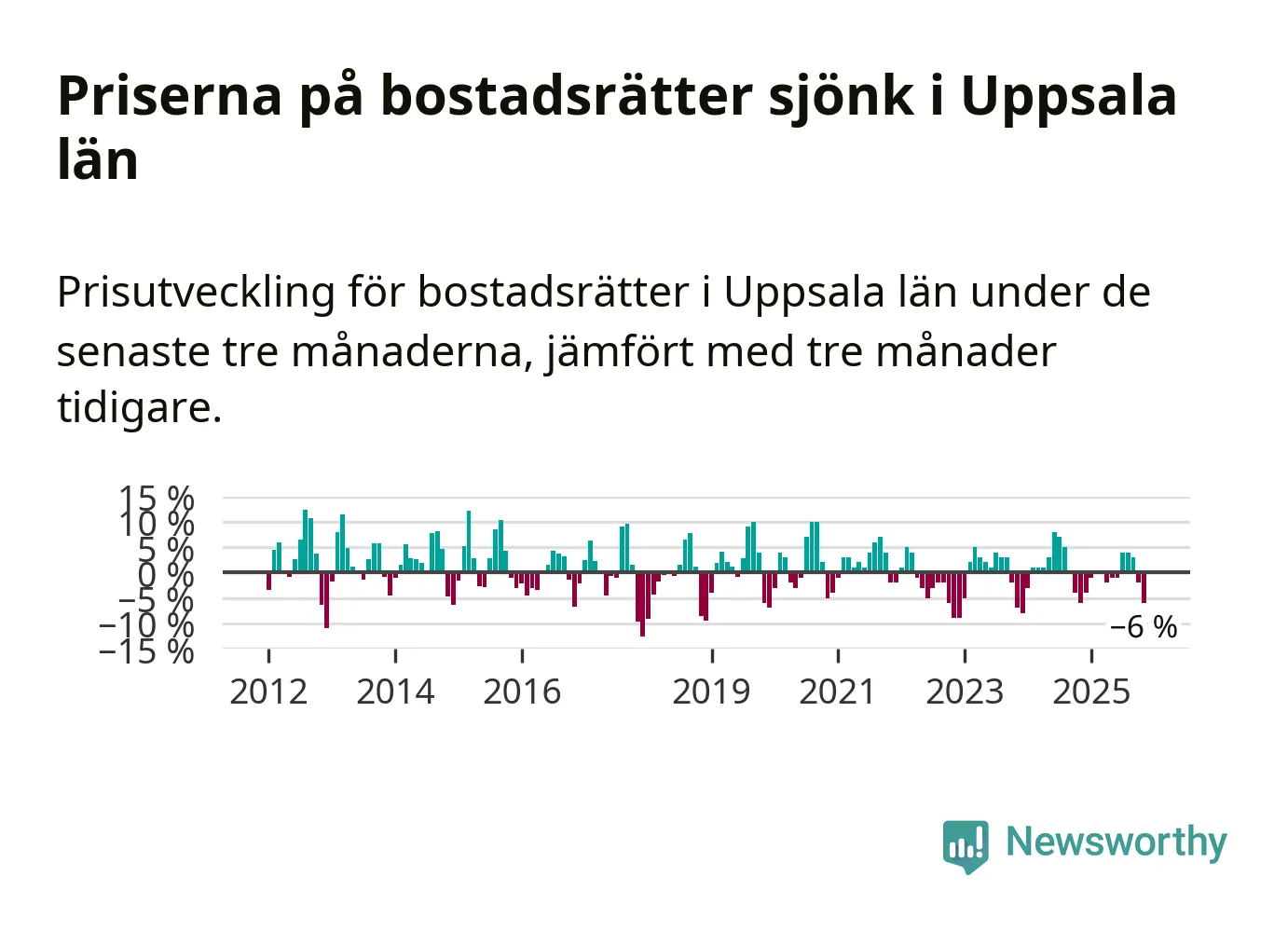 Priserna på bostadsrätter har gått ner i Uppsala län. Medelpriset på försäljningarna under de senaste tre månaderna visar på en nedgång med 6 procent.