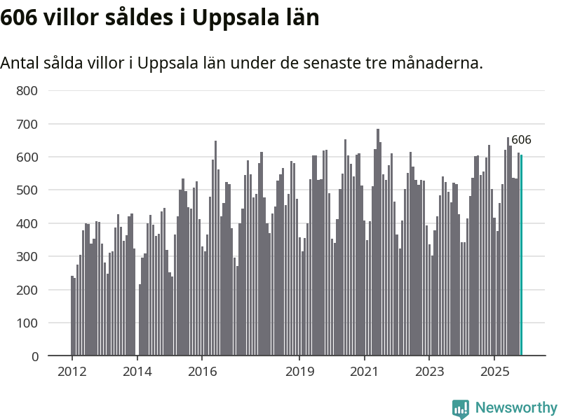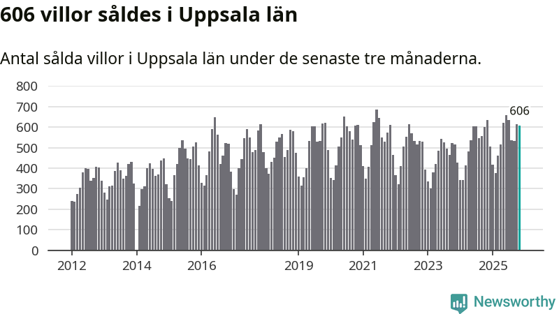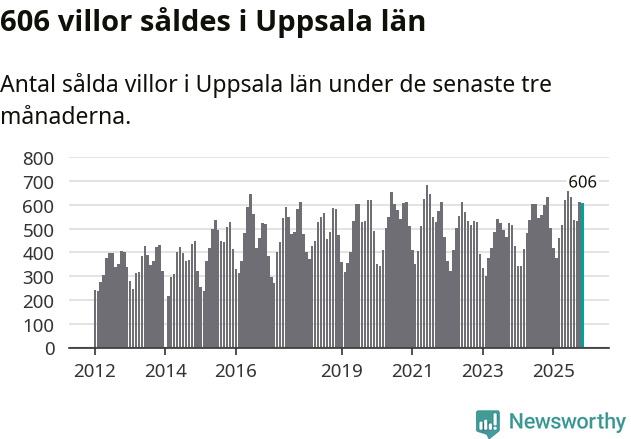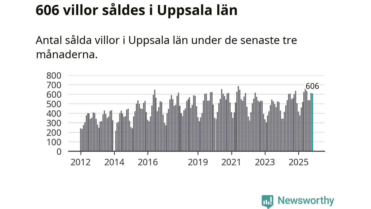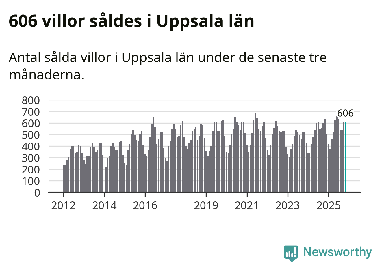 Sammanlagt såldes 606 villor i Uppsala län mellan september och november till ett genomsnittligt pris på 4,2 miljoner kronor. I fjol gjordes 635 affärer vid den här tiden på året.