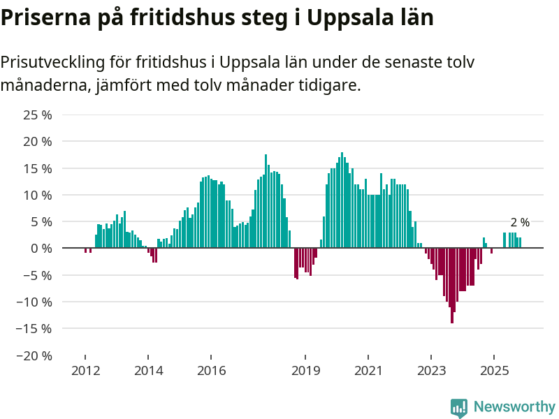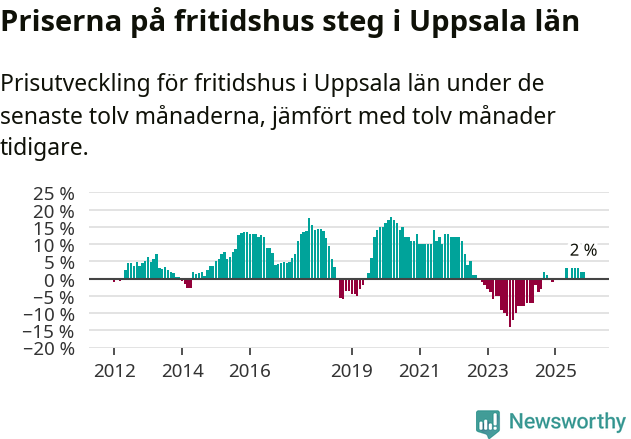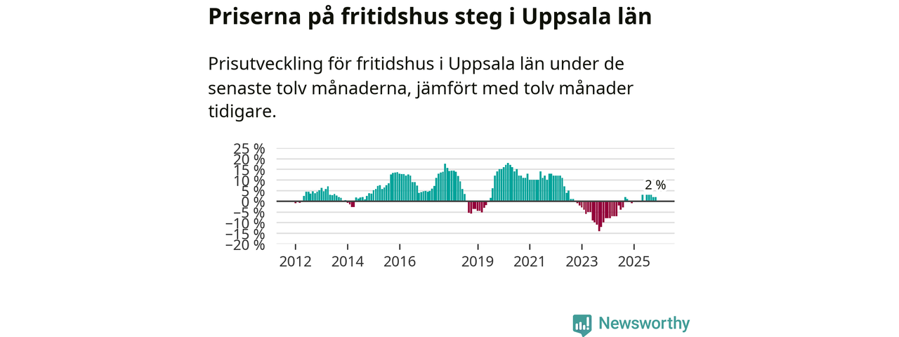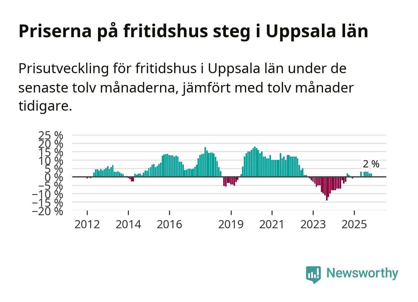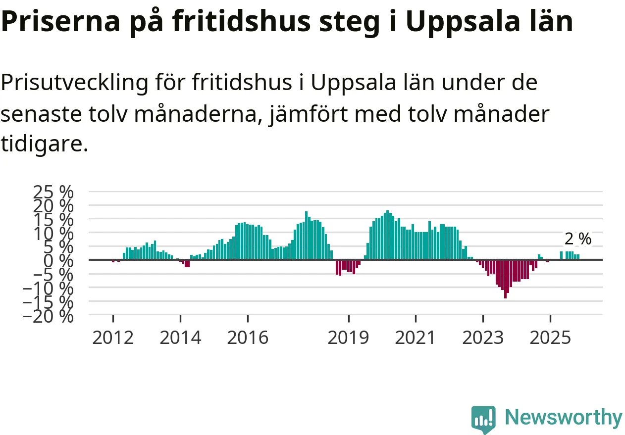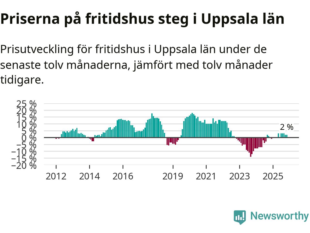 Priserna på fritidshus har gått upp i Uppsala län. Medelpriset på försäljningarna under de senaste tolv månaderna visar på en uppgång med 2 procent.