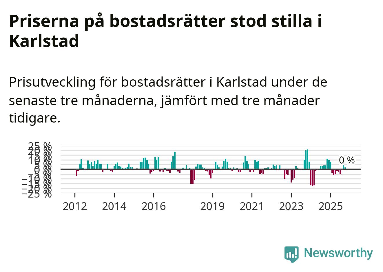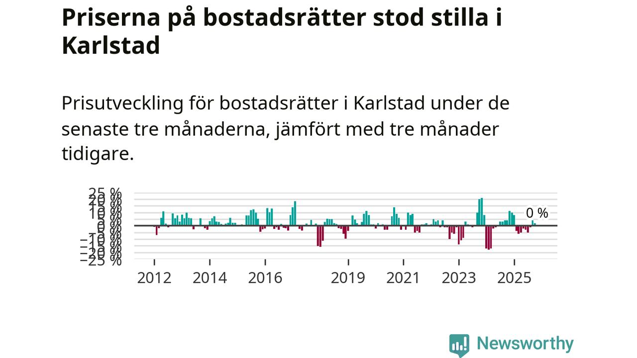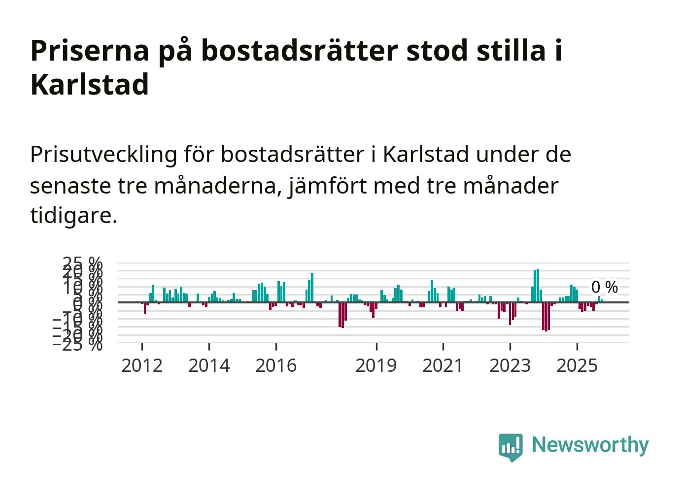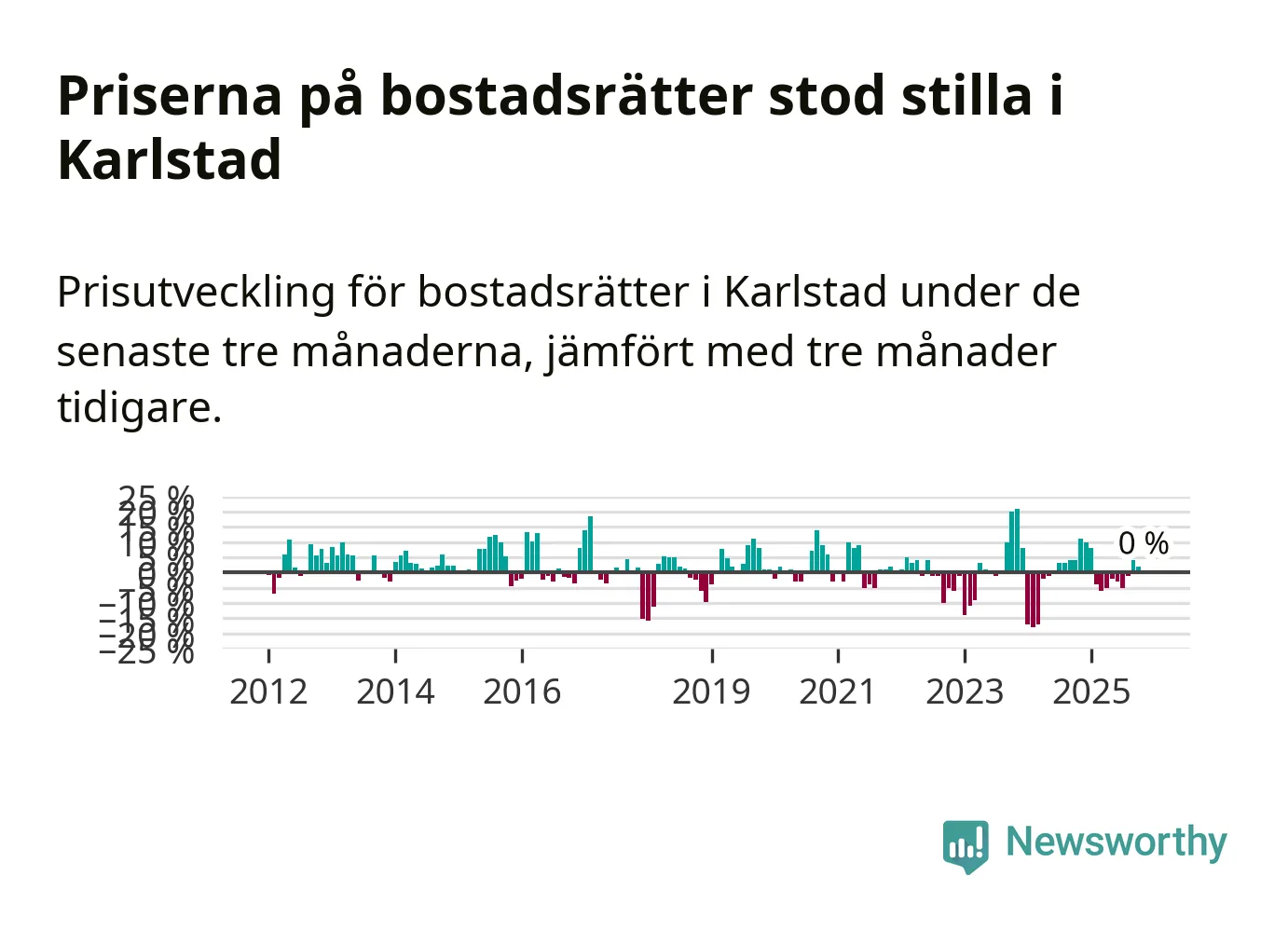 Priserna på bostadsrätter står i stort sett stilla i Karlstads kommun. Medelpriset på de på försäljningarna under de senaste tre månaderna låg på samma nivå som för tre månader sedan.