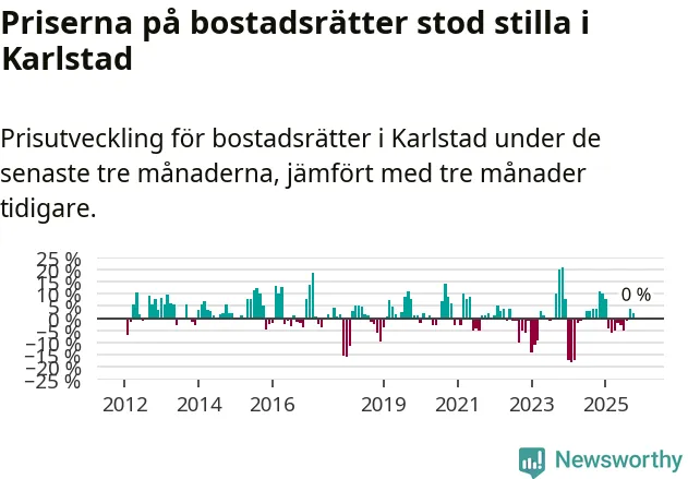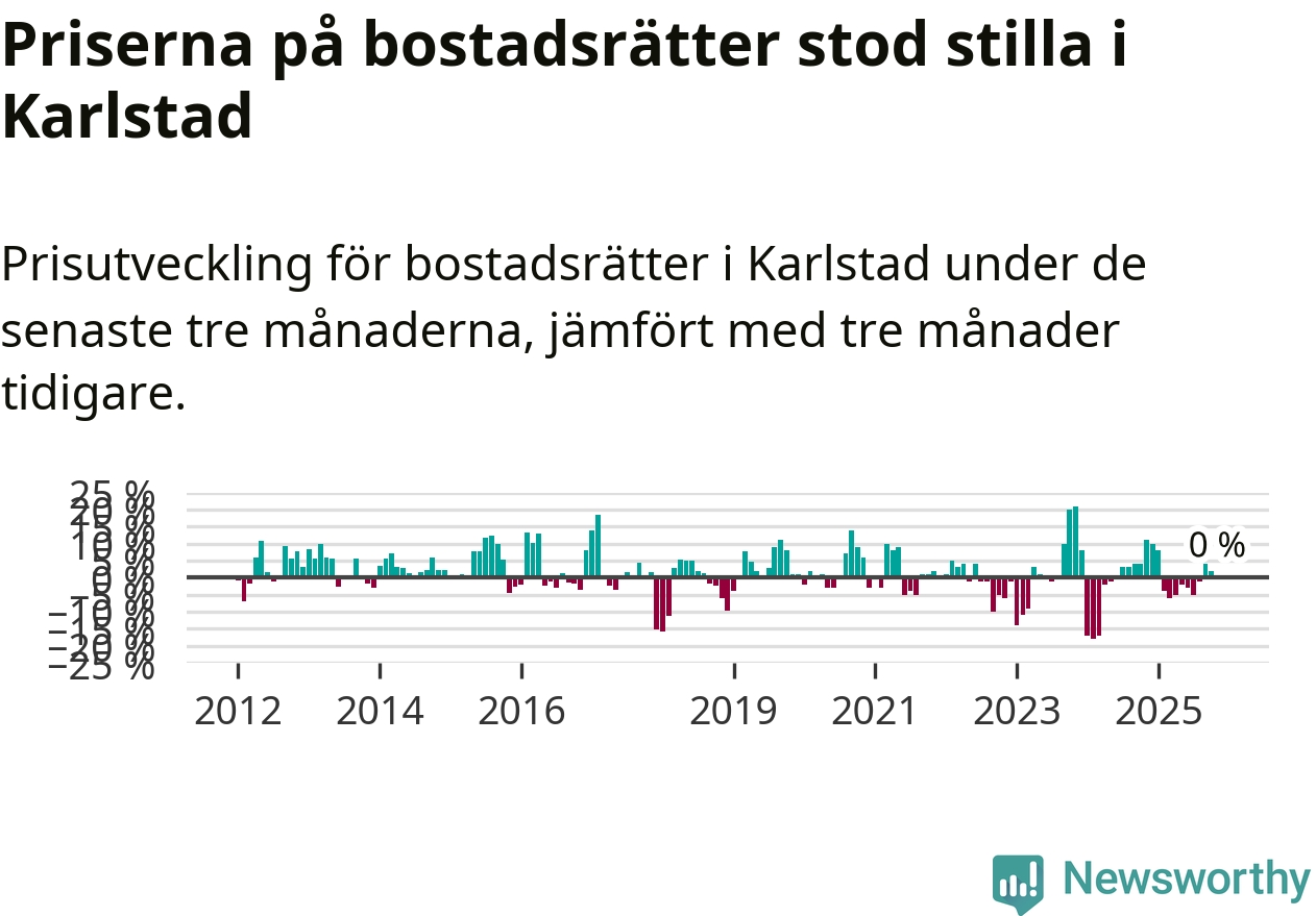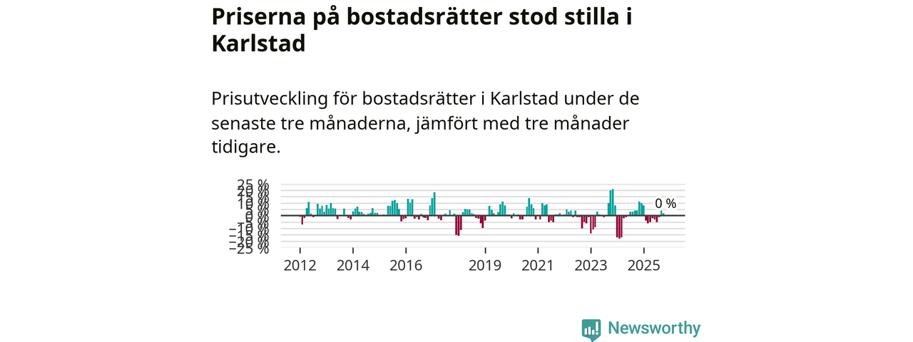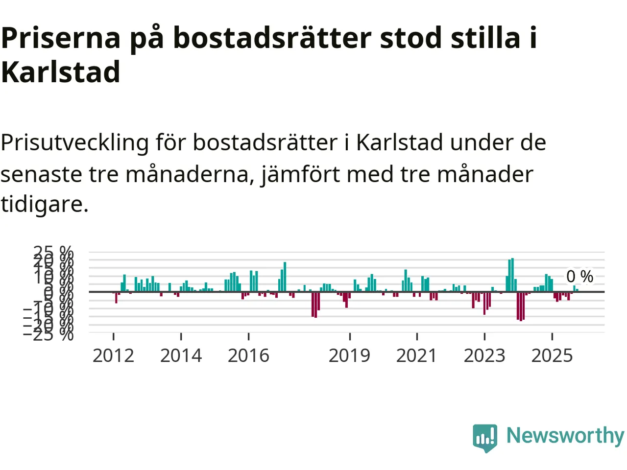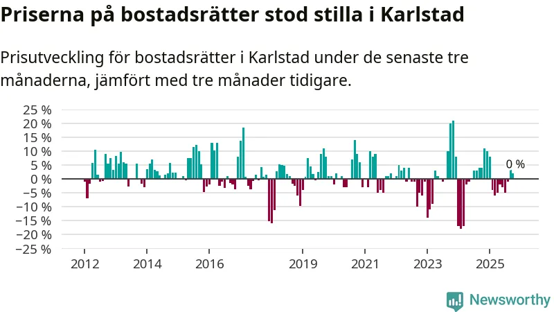 Priserna på bostadsrätter står i stort sett stilla i Karlstads kommun. Medelpriset på de på försäljningarna under de senaste tre månaderna låg på samma nivå som för tre månader sedan.