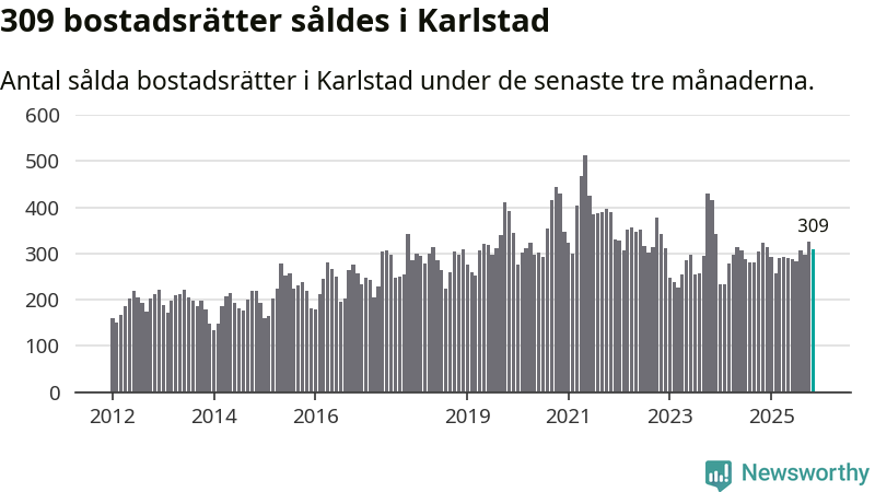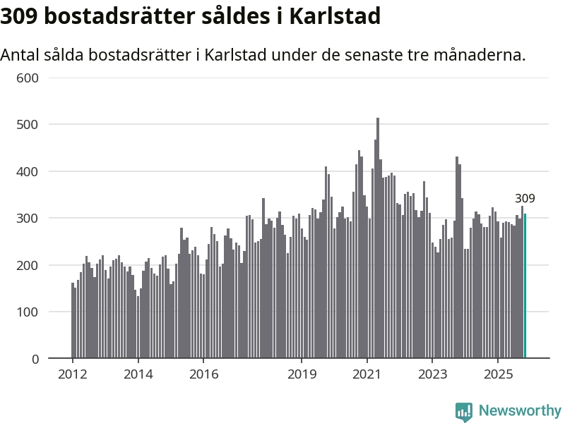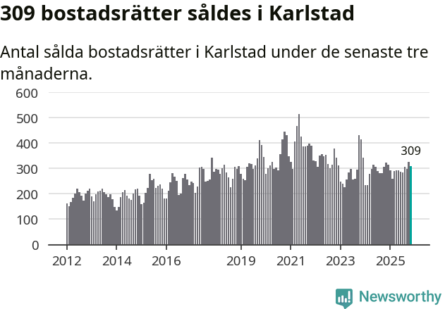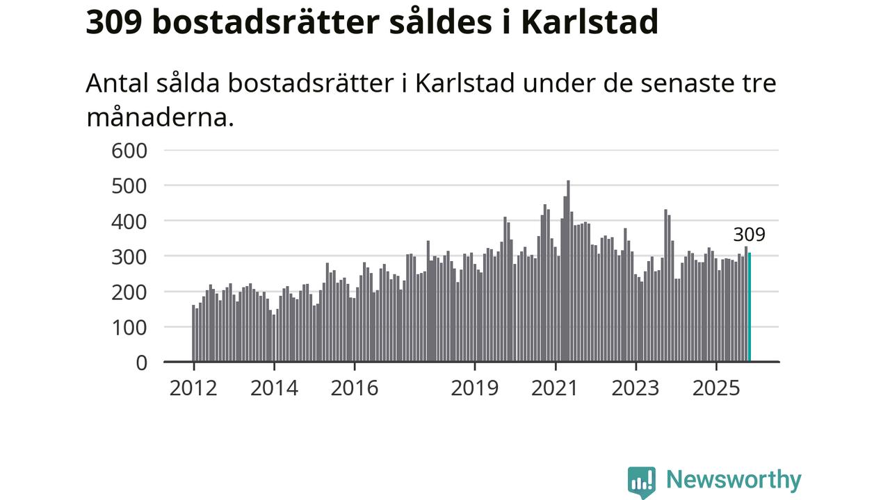 Sammanlagt såldes 309 bostadsrätter i Karlstads kommun mellan september och november till ett genomsnittligt pris på 2,0 miljoner kronor. I fjol gjordes 323 affärer vid den här tiden på året.
