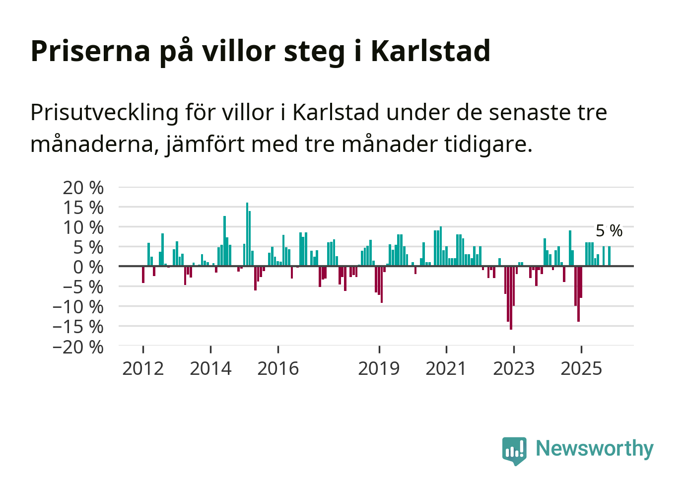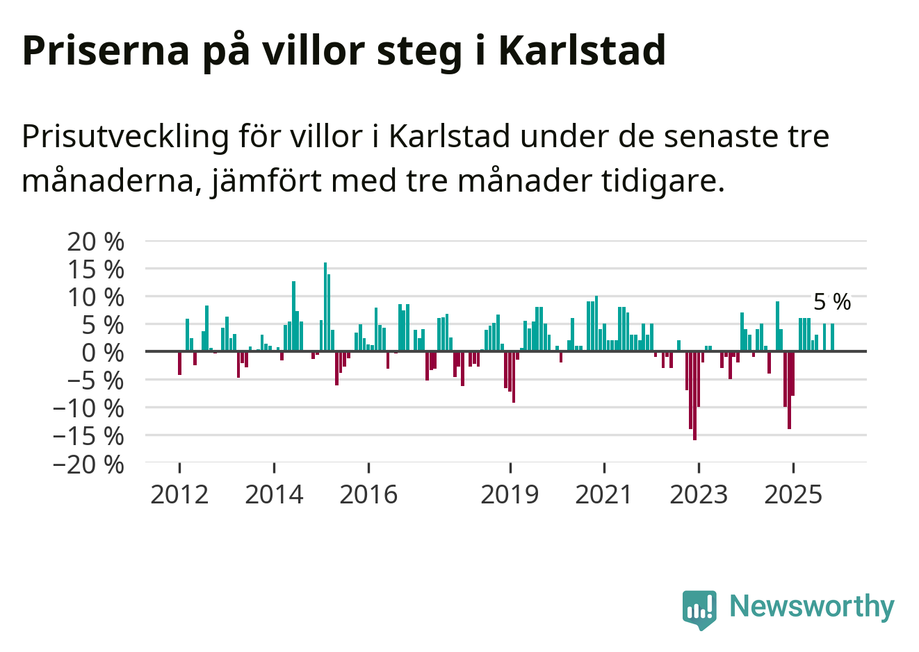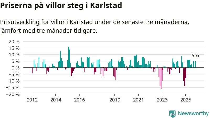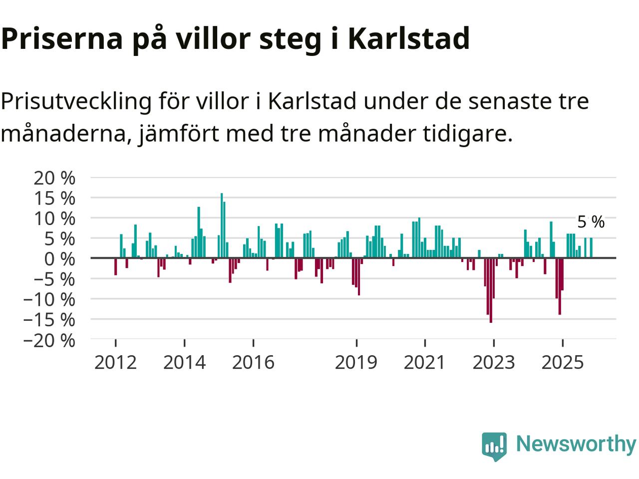 Villapriserna har gått upp i Karlstads kommun. Medelpriset på försäljningarna under de senaste tre månaderna visar på en uppgång med 5 procent.