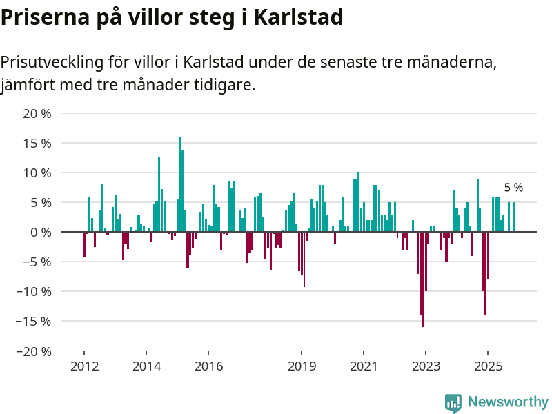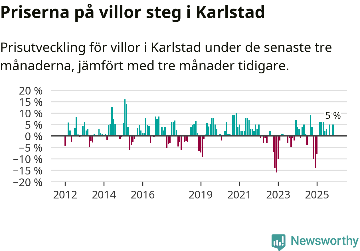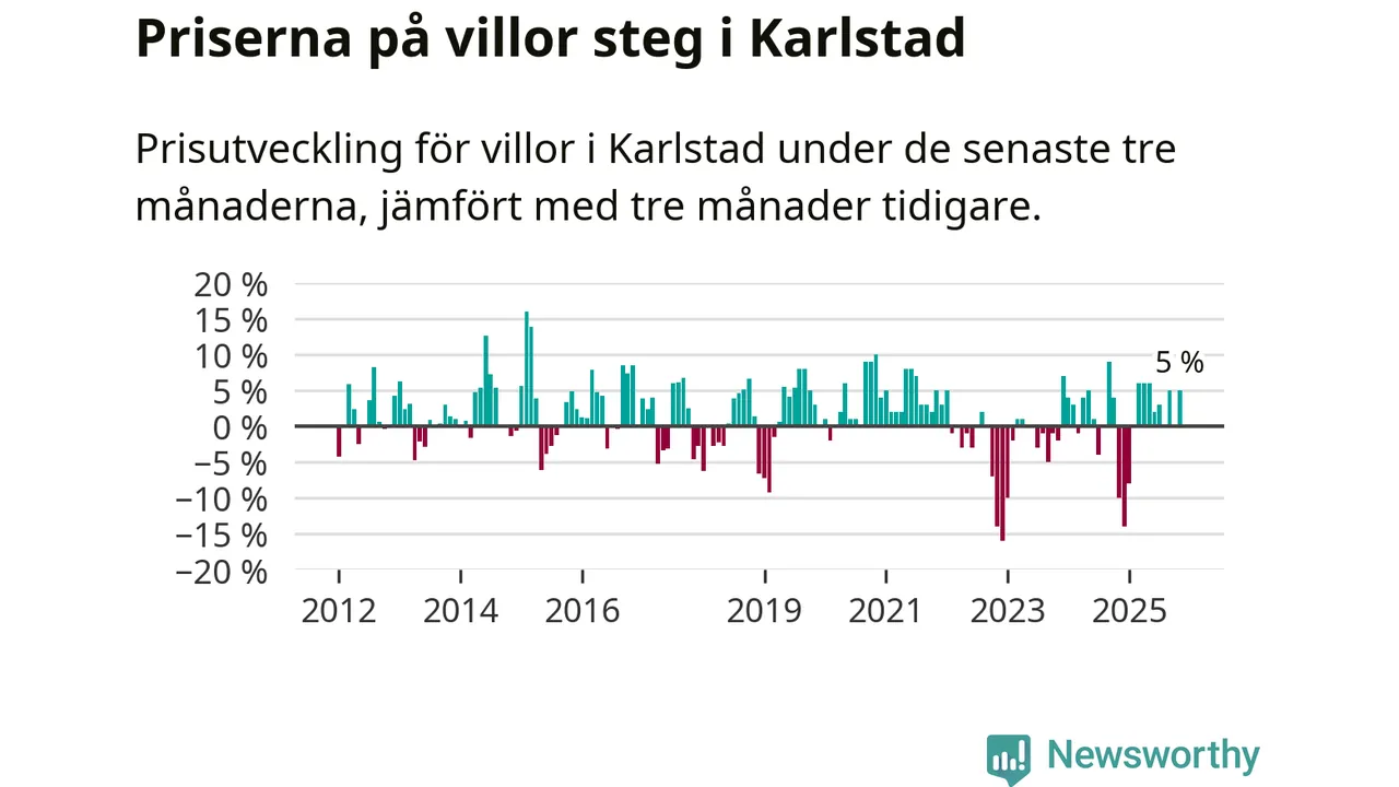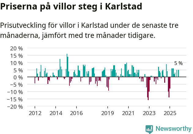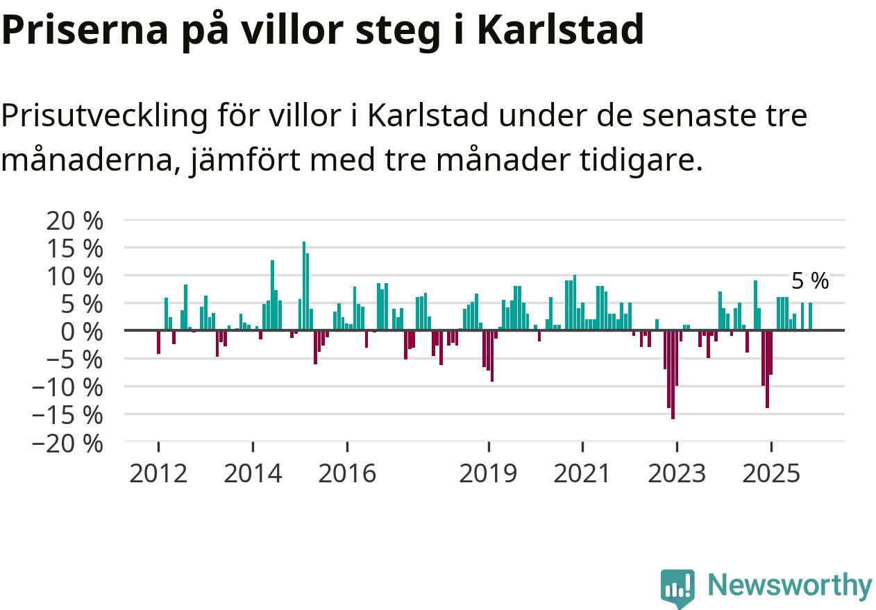 Villapriserna har gått upp i Karlstads kommun. Medelpriset på försäljningarna under de senaste tre månaderna visar på en uppgång med 5 procent.